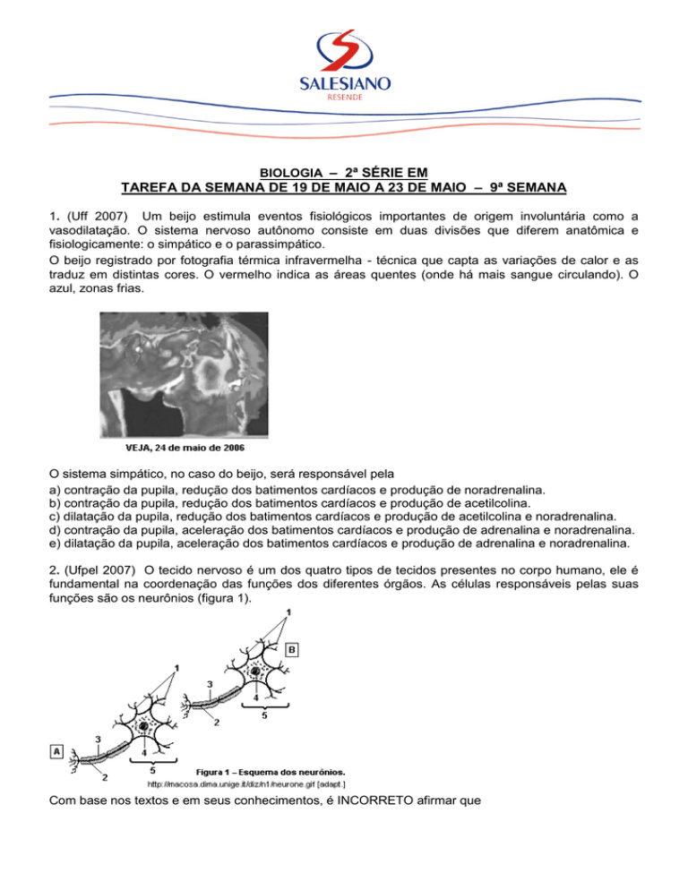 BIOLOGIA – 2ª SÉRIE EM TAREFA DA SEMANA DE 19 DE MAIO A 23 DE MAIO – 9ª SEMANA 1. (Uff 2007) Um beijo estimula eventos fisiológicos importantes de origem involuntária como a vasodilatação. O sistema nervoso autônomo consiste em duas divisões que diferem anatômica e fisiologicamente: o simpático e o parassimpático. O beijo registrado por fotografia térmica infravermelha - técnica que capta as variações de calor e as traduz em distintas cores. O vermelho indica as áreas quentes (onde há mais sangue circulando). O azul, zonas frias. O sistema simpático, no caso do beijo, será responsável pela a) contração da pupila, redução dos batimentos cardíacos e produção de noradrenalina. b) contração da pupila, redução dos batimentos cardíacos e produção de acetilcolina. c) dilatação da pupila, redução dos batimentos cardíacos e produção de acetilcolina e noradrenalina. d) contração da pupila, aceleração dos batimentos cardíacos e produção de adrenalina e noradrenalina. e) dilatação da pupila, aceleração dos batimentos cardíacos e produção de adrenalina e noradrenalina. 2. (Ufpel 2007) O tecido nervoso é um dos quatro tipos de tecidos presentes no corpo humano, ele é fundamental na coordenação das funções dos diferentes órgãos. As células responsáveis pelas suas funções são os neurônios (figura 1). Com base nos textos e em seus conhecimentos, é INCORRETO afirmar que a) geralmente o sentido da propagação do impulso nervoso é A para B, e por isso a estrutura 1 é especializada na transmissão do impulso nervoso para um outro neurônio ou para outros tipos celulares. b) tanto a estrutura representada pelo número 1 quanto 2 são ramificações do neurônio, sendo que geralmente a 2 é única e mais longa. c) a estrutura número 3 pode ser formada pela célula de Schwann. Ela desempenha um papel protetor, isolante e facilita a transmissão do impulso nervoso. d) a estrutura número 4 está no centro metabólico do neurônio, onde também se encontra a maioria das organelas celulares. e) considerando o sistema nervoso central, a região número 5 está presente na substância cinzenta e ausente na branca. 3. (Ufpb 2006) As células que compõem o sistema nervoso são os neurônios e os gliócitos (antes denominados neuróglia), as primeiras as unidades de recepção e transmissão de estímulos. O termo gliócitos é uma denominação conjunta de células que atuam de várias formas no sistema nervoso. Nesse sentido, observe a figura a seguir, que representa células do tecido nervoso. O texto a seguir contém lacunas que devem ser preenchidas por termos relacionados às estruturas numeradas na figura. Células que atuam na fagocitose interna ao tecido nervoso são denominadas _________(1). Células que potencializam a transmissão de impulso envolvem os axônios. Axônios internos ao sistema nervoso central têm um envoltório mielínico produzido por células denominadas ________(2). Axônios que estão no sistema nervoso periférico têm envoltório mielínico produzido por células denominadas _______(3). As lacunas são preenchidas corretamente por: a) (1) Granulócitos (2) Micróglias (3) Astrócitos b) (1) Astrócitos (2) Oligodendrócitos (3) Granulócitos c) (1) Micróglias (2) Oligodendrócitos (3) Oligodendrócitos especiais ou células de Schwann d) (1) Astrócitos (2) Oligodendrócitos especiais ou células de Schwann (3) Linfócitos e) (1) Micróglias (2) Linfócitos (3) Oligodendrócitos especiais ou células de Schwann 4. (Unirio 1999) O vestibular é um momento decisivo na vida do estudante, o qual pode apresentar uma certa ansiedade antes e durante as provas. Nesse momento, o organismo sofre intensas alterações fisiológicas. Como um exemplo de alteração estimulada pelo sistema nervoso simpático, pode-se citar a(o): a) contração da bexiga. b) contração da pupila. c) diminuição da pressão sanguínea. d) aumento da frequência cardíaca. e) aumento da peristalse intestinal. 5. (Cesgranrio 1998) O estresse, a chamada doença do século, não é exclusiva da espécie humana. Certamente você já viu algumas fêmeas defendendo seus filhotes, um animal em fuga de um predador ou ainda um animal acuado e que deve enfrentar o agressor para sobreviver. Essas situações típicas de estresse estão associados ao seguinte par de fatores. a) atropina ⇔ sistema nervoso parassimpático. b) adrenalina ⇔ sistema nervoso simpático. c) adrenalina ⇔ sistema nervoso somático. d) noradrenalina ⇔ sistema nervoso central. e) noradrenalina ⇔ sistema nervoso somático. 6. (Mackenzie 1998) A respeito da sinapse representada anteriormente, é correto afirmar que: a) só está presente no sistema nervoso central. b) o impulso nervoso passa de 2 para 1. c) a liberação das substâncias presentes em 3 determina a passagem de impulso de um neurônio para outro. d) as substâncias presentes em 3 são produzidas exclusivamente nas células desse sistema. e) é possível haver contato físico entre 1 e 2. 7. (G2 1996) O esquema adiante representa, de maneira simplificada, as inter-relações do sistema nervoso. Assinale a alternativa correta em relação à análise desse esquema: a) 1 representa uma fibra sensorial do sistema nervoso somático. b) 2 representa uma fibra motora do sistema nervoso simpático c) 1 e 4 representam fibras motoras do sistema nervoso autônomo. d) 3 e 4 representam fibras do sistema nervoso autônomo. e) 3 representa uma fibra motora e 4 uma fibra sensorial. 8. (Fuvest 1993) A figura a seguir mostra os componentes de um arco reflexo. No esquema anterior, o neurônio de associação e o corpo celular do neurônio sensorial estão localizados, respectivamente a) na substância cinzenta e no gânglio. b) na substância cinzenta e na raiz ventral. c) no gânglio e na raiz ventral. d) no gânglio e na substância cinzenta. e) na raiz ventral e no gânglio.