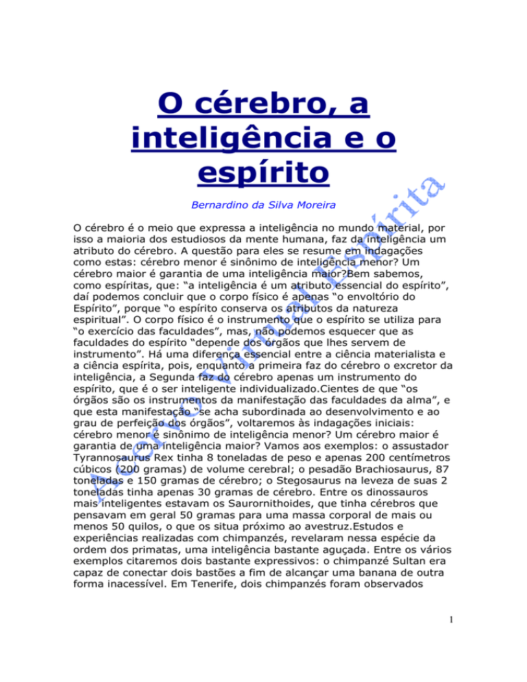 O cérebro, a inteligência e o espírito Bernardino da Silva Moreira O cérebro é o meio que expressa a inteligência no mundo material, por isso a maioria dos estudiosos da mente humana, faz da inteligência um atributo do cérebro. A questão para eles se resume em indagações como estas: cérebro menor é sinônimo de inteligência menor? Um cérebro maior é garantia de uma inteligência maior?Bem sabemos, como espíritas, que: “a inteligência é um atributo essencial do espírito”, daí podemos concluir que o corpo físico é apenas “o envoltório do Espírito”, porque “o espírito conserva os atributos da natureza espiritual”. O corpo físico é o instrumento que o espírito se utiliza para “o exercício das faculdades”, mas, não podemos esquecer que as faculdades do espírito “depende dos órgãos que lhes servem de instrumento”. Há uma diferença essencial entre a ciência materialista e a ciência espírita, pois, enquanto a primeira faz do cérebro o excretor da inteligência, a Segunda faz do cérebro apenas um instrumento do espírito, que é o ser inteligente individualizado.Cientes de que “os órgãos são os instrumentos da manifestação das faculdades da alma”, e que esta manifestação “se acha subordinada ao desenvolvimento e ao grau de perfeição dos órgãos”, voltaremos às indagações iniciais: cérebro menor é sinônimo de inteligência menor? Um cérebro maior é garantia de uma inteligência maior? Vamos aos exemplos: o assustador Tyrannosaurus Rex tinha 8 toneladas de peso e apenas 200 centímetros cúbicos (200 gramas) de volume cerebral; o pesadão Brachiosaurus, 87 toneladas e 150 gramas de cérebro; o Stegosaurus na leveza de suas 2 toneladas tinha apenas 30 gramas de cérebro. Entre os dinossauros mais inteligentes estavam os Saurornithoides, que tinha cérebros que pensavam em geral 50 gramas para uma massa corporal de mais ou menos 50 quilos, o que os situa próximo ao avestruz.Estudos e experiências realizadas com chimpanzés, revelaram nessa espécie da ordem dos primatas, uma inteligência bastante aguçada. Entre os vários exemplos citaremos dois bastante expressivos: o chimpanzé Sultan era capaz de conectar dois bastões a fim de alcançar uma banana de outra forma inacessível. Em Tenerife, dois chimpanzés foram observados 1 maltratando uma galinha: um deles estendia o alimento para a ave, incentivando-a a aproximar-se; enquanto isso, o outro arremetia golpes contra ela com um pedaço de arame que escondera nas costas. A galinha recuava, mas logo se aproximava novamente – e novamente era atingida.Dois psicólogos, Beatrice e Robert Gardner, da Universidade de Nevada, sabendo que a faringe e a laringe do chimpanzé não são apropriadas à linguagem humana, tiveram uma brilhante idéia: ensinar a um chimpanzé uma linguagem americana de sinais, conhecida por seu acróstico AMESLAN (American sign language) e às vezes por “linguagem americana de surdos e mudos”. Conclusão: existe hoje uma vasta biblioteca de conversas descritas e filmadas utilizando o AMESLAN e outras linguagens com chimpanzés estudados pelos Gardner e por outros outros.Em “Os animais e o homem”, inserido em “O Livro dos Espíritos”, na questão 593, Kardec pergunta: “Poder-se-á dizer que os animais só obram por instinto?” Eis a resposta dos Espíritos superiores, surpreendente para a época: “Ainda aí há um sistema. É verdade que na maioria dos animais domina o instinto. Mas, não vês que muitos obram denotando acentuada vontade? É que têm inteligência, porém limitada.” É inegável a diferença entre dinossauros e chimpanzés; enquanto nos primeiros o instinto é dominante, nos segundos, além dos instintos há inteligência, que apesar de ser limitada, se comparada a do homem, é surpreendente pela vontade que denotam ao expressar suas ações. Há 3 milhões de anos, existia uma série de indivíduos bípedes com grande variedade de volume craniano, um deles, o qual L.S.B. Leskey, o estudioso anglo-queniano do homem primitivo, chamou Homo habilis, tinha um volume cerebral aproximadamente de 700 centímetros cúbicos (700 gramas).Os homens e mulheres modernos têm caixas cranianas com o dobro do volume das do Homo habilis, isto é, a massa cerebral do homem contemporâneo gira em torno 1.375 gramas. Um recém-nascido normal possui, em média 350 gramas de massa cerebral (cerca de 12% da massa corporal), isto é, 23% do tamanho do cérebro do adulto; com um ano de idade, 500 gramas. O cérebro, principalmente o córtex cerebral, continua a crescer rapidamente nos três primeiros anos de vida – o período de mais rápido aprendizado. O crescimento total não se completa antes de vinte e três anos de idade.Se uma massa cerebral maior é um indício de maior inteligência, uma massa cerebral é indício de inteligência menor? Pelo que vimos parece que sim. O cérebro da mulher contemporânea tem cerca de 150 centímetros cúbicos (150 gramas) a menos que o homem. Quando os aspectos culturais e a educação da criança são levadas em consideração, não existem indícios concretos de diferenças globais na inteligência entre sexos. Por conseguinte, a diferença de 150 gramas de massa cerebral nos seres humanos deve ser desprezível. Existem diferenças análogas na massa cerebral adultos de diferentes etnias humanas (os orientais, em média, 2 possuem cérebros ligeiramente maiores do que os do homem branco); considerando-se que não foram demonstradas diferenças de inteligência sob condições controladas, segue-se a mesma conclusão. A discrepância entre os tamanhos de cérebros de Lorde Byron (2.200 gramas) e Anatole France (1.100 gramas) sugere que, neste campo, a diferença de muitas centenas de gramas pode ser irrelevante em termos funcionais. Não podemos prever a inteligência de uma pessoa, de forma alguma, medindo o tamanho do seu cérebro. Contudo, como demonstrou o biólogo americano Leigh 