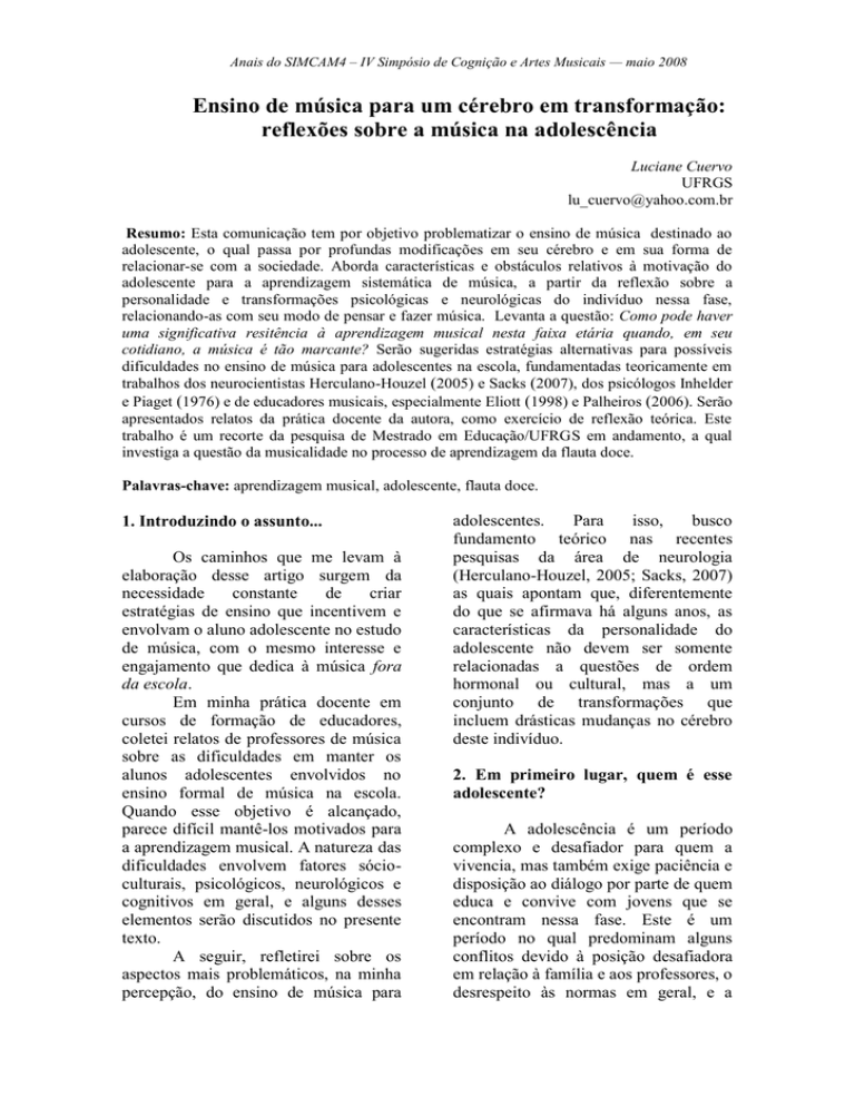 Anais do SIMCAM4 – IV Simpósio de Cognição e Artes Musicais — maio 2008 Ensino de música para um cérebro em transformação: reflexões sobre a música na adolescência Luciane Cuervo UFRGS [email protected] Resumo: Esta comunicação tem por objetivo problematizar o ensino de música destinado ao adolescente, o qual passa por profundas modificações em seu cérebro e em sua forma de relacionar-se com a sociedade. Aborda características e obstáculos relativos à motivação do adolescente para a aprendizagem sistemática de música, a partir da reflexão sobre a personalidade e transformações psicológicas e neurológicas do indivíduo nessa fase, relacionando-as com seu modo de pensar e fazer música. Levanta a questão: Como pode haver uma significativa resitência à aprendizagem musical nesta faixa etária quando, em seu cotidiano, a música é tão marcante? Serão sugeridas estratégias alternativas para possíveis dificuldades no ensino de música para adolescentes na escola, fundamentadas teoricamente em trabalhos dos neurocientistas Herculano-Houzel (2005) e Sacks (2007), dos psicólogos Inhelder e Piaget (1976) e de educadores musicais, especialmente Eliott (1998) e Palheiros (2006). Serão apresentados relatos da prática docente da autora, como exercício de reflexão teórica. Este trabalho é um recorte da pesquisa de Mestrado em Educação/UFRGS em andamento, a qual investiga a questão da musicalidade no processo de aprendizagem da flauta doce. Palavras-chave: aprendizagem musical, adolescente, flauta doce. 1. Introduzindo o assunto... Os caminhos que me levam à elaboração desse artigo surgem da necessidade constante de criar estratégias de ensino que incentivem e envolvam o aluno adolescente no estudo de música, com o mesmo interesse e engajamento que dedica à música fora da escola. Em minha prática docente em cursos de formação de educadores, coletei relatos de professores de música sobre as dificuldades em manter os alunos adolescentes envolvidos no ensino formal de música na escola. Quando esse objetivo é alcançado, parece difícil mantê-los motivados para a aprendizagem musical. A natureza das dificuldades envolvem fatores sócioculturais, psicológicos, neurológicos e cognitivos em geral, e alguns desses elementos serão discutidos no presente texto. A seguir, refletirei sobre os aspectos mais problemáticos, na minha percepção, do ensino de música para adolescentes. Para isso, busco fundamento teórico nas recentes pesquisas da área de neurologia (Herculano-Houzel, 2005; Sacks, 2007) as quais apontam que, diferentemente do que se afirmava há alguns anos, as características da personalidade do adolescente não devem ser somente relacionadas a questões de ordem hormonal ou cultural, mas a um conjunto de transformações que incluem drásticas mudanças no cérebro deste indivíduo. 2. Em primeiro lugar, quem é esse adolescente? A adolescência é um período complexo e desafiador para quem a vivencia, mas também exige paciência e disposição ao diálogo por parte de quem educa e convive com jovens que se encontram nessa fase. Este é um período no qual predominam alguns conflitos devido à posição desafiadora em relação à família e aos professores, o desrespeito às normas em geral, e a Anais do SIMCAM4 – IV Simpósio de Cognição e Artes Musicais — maio 2008 desmotivação generalizada – mais conhecida como tédio. No entanto, com o auxílio de pesquisas recentes nas áreas principalmente da neurologia, encontramos subsídios para repensar a forma de interagir com os indivíduos nesta fase. Segundo Inhelder e Piaget (1976), a adolescência pode ser considerada como a fase de integração do indivíduo na sociedade adulta, podendo esse período sofrer grande influência do meio. Enquanto a puberdade acontece, mais ou menos na mesma idade em diferentes contextos culturais e sociais, o período relacionado à integração no meio adulto pode ser tão variado quanto os diferentes ambientes sociais conhecidos. Em termos biológicos, ela pode variar entre 10 a 20 anos de idade, incluindo a puberdade, mas segundo HerculanoHouzel (2005), a maturação cerebral não a capacidade de aprender, esta considerada sem limite de idade(!) deve estar completa somente próximo dos 30 anos. Para Herculano-Houzel, a adolescência é a época em que o cérebro da infância se transforma em cérebro de um indivíduo adulto. A atual pesquisa sobre o desenvolvimento humano sofreu uma mudança de foco desde o reconhecimento de que “o cérebro adolescente é fundamentalmente diferente tanto do cérebro infantil quanto do adulto, e que essas diferenças em várias regiões do cérebro podem explicar as mudanças de comportamento típicas dos adolescentes” (HerculanoHouzel, 2005, p. 12). Inhelder e Piaget (1976), ainda na década de 70, apontavam caminhos nessa mesma direção, afirmando que “parece evidente que o desenvolvimento das estruturas formais da adolescência está ligado ao das estruturas cerebrais” (p. 251). Os autores seguem afirmando que, para o meio social atuar efetivamente sobre os cérebros individuais, “é preciso que estes estejam em condições de assimilar as contribuições desse meio, e voltamos à necessidade de uma maturação suficiente dos instrumentos cerebrais individuais” (p. 251). A ocorrência das transformações do cérebro está profundamente ligada ao meio cultural do adolescente, e é essa relação que servirá como base de desenvolvimento da autonomia e a afirmação de sua identidade perante a sociedade. Desta forma, seria incoerente pensar o ensino de música para adolescentes com os mesmos objetivos e metodologia daquele destinado às crianças. Por outro lado, este adolescente ainda não tem a maturidade do adulto, pois está passando por um profundo processo de transformação em seu cérebro, o que se manifesta em seu comportamento. É necessário que o educador musical possua uma po