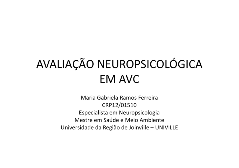 AVALIAÇÃO NEUROPSICOLÓGICA EM AVC Maria Gabriela Ramos Ferreira CRP12/01510 Especialista em Neuropsicologia Mestre em Saúde e Meio Ambiente Universidade da Região de Joinville – UNIVILLE Definição de AVC • A oclusão ou a ruptura dos vasos arteriais do sistema nervoso central causando uma interrupção na circulação sanguínea de parte do cérebro é definida como acidente cerebrovascular (AVC). LOTUFO, 2005; CHANDRA, 2006 • Isquemia = 70% • Hemorragia CHANDRA, 2006 Epidemiologia - AVC é a principal causa de incapacidade em todo o mundo BONITA, 2004; WOLFE, 2000 - Maior causa de morte e incapacidade nos países em desenvolvimento WHO, 2007 - América Latina Brasil com as maiores taxas de mortalidade LOTUFO, 2007 - Brasil AVC é a primeira causa de morte Disponível em www.datasus.org.br - Joinville Taxa de incidência = 105,4/100.000 hab. CABRAL, 2009 Impacto do AVC • Seqüelas físicas, emocionais e cognitivas afetando o cotidiano após a volta para casa e para a comunidade MUNSAT, 1997 • Impacto financeiro aos pacientes, seus familiares, ao sistema de saúde e à sociedade BARKER-COLLO, 2006 • Aposentadoria precoce • Demência BONITA, 2004 Cognição e AVC • O AVC pode causar síndromes cognitivas que refletem a neuroanatomia funcional da cognição e a anatomia vascular do cérebro NYS, 2005; FERRO, 2001 – disfunções lateralizadas dos hemisférios cerebrais – lesões difusas MUNSAT, 1997 Desordens cognitivas após AVC • síndromes neuropsicológicas: − − − − − − − − − afasia, apraxia, anosognosia, agnosia de objetos, disfunção executiva heminegligência unilateral, alterações de atenção prejuízo de memória alterações visuo-espaciais. LEZAK, 2004; MUNSAT, 1997 Desordens cognitivas após AVC • No Brasil a realidade dos pacientes que sofreram acidente vascular cerebral é muito similar àquela descrita por NYS (2005, p. 15), na Holanda: • “... quando depois do período de internação hospitalar a grande maioria dos sobreviventes recebe alta e retorna para suas casas, eles estão muitas vezes ignorantes da existência e das possíveis consequências das desordens cognitivas, considerando que identificação precoce e o fornecimento de informações poderiam facilitar a compreensão dos pacientes e de seus cuidadores”. Desordens Cognitivas Após AVC • Envelhecimento e sexo feminino prejuízo cognitivo. fatores de risco para • Lesões frontais, parietais e occipitais relacionadas a uma pior recuperação em domínios cognitivos específicos. • Maior volume da lesão associado com desfecho cognitivo adverso em seis meses após o AVC. • Trombólise cognitivo. não foi associada a benefício no desfecho NYS, 2005 Desordens Cognitivas Após AVC • Reitz, 2006: − estudo que comportou várias avaliações neuropsicológicas em um período de 5 anos − AVC pregresso está relacionado com declínio progressivo da memória e do desempenho abstrato/visuo-espacial − principalmente entre homens − naqueles que não apresentaram alelo APOEε4. Desordens Cognitivas Após AVC • Prejuízo cognitivo precoce após AVC lesões pré-existentes fatores de risco vasculares hiperglicemia + febre (admissão) • Portanto, febre e hiperglicemia aguda podem resultar em AVC mais graves e são fatores de risco “não independentes” para piores desfechos funcionais, podendo acarretar benefícios se for possível a sua modificação precoce. NYS, 2007 Desordens Cognitivas Após AVC • Plasticidade neuronal do cérebro → recuperação natural • Déficits cogniXvos mais severos → fase aguda • Depende da gravidade do AVC • Algumas síndromes cognitivas hiperagudas são indicadores úteis de posteriores incapacidades. • − − − Transtornos cognitivos mais comuns: funcionamento executivo percepção visual construção visuo-espacial. NYS, 2005 Desordens Cognitivas Após AVC • Bom nível de funcionamento intelectual pré-mórbido: − excelente preditor de boa recuperação em quase todos os domínios cognitivos, − maior capacidade de criar estratégias compensatórias adequadas − maior reserva cognitiva (densa conectividade neuronal existente) • Pacientes mais jovens melhor recuperação no funcionamento executivo, linguagem e memória visual e verbal • Pacientes mais idosos recuperação cognitiva pior após lesão cerebral envelhecimento reduz a conectividade neuronal NYS, 2007 e 2005 Desordens Cognitivas Após AVC • Sexo → não influenciou a recuperação cognitiva • Volume da lesão → prediXvo apenas para a memória visual • Localização da lesão → maior poder de predição (lesão pequena, mas estratégica pode causar maior dano cognitivo) • A gravidade do AVC, (NIH-SS) + presença ou a ausência de sintomas depressivos na primeira avaliação → não associados com a recuperação cognitiva. • Estudos longitudinais → a cognição permanece estável ou até melhora a longo-prazo → reorganização adaptativa das funções cerebrais após AVC. NYS, 2007 e 2006 Avaliação neuropsicológica • Mini Exame do Estado Mental (MEEM) • Pouca sensibilidade e especificidade como método de rastreio cognitivo em pacientes com AVC BLAKE, 2002 apud NYS, 2005 • Não discrimina entre pacientes cognitivamente intactos e com prejuízo cognitivo (ponto de corte <24) • Não demonstra prejuízos de raciocínio abstrato, funcionamento executivo, percepção visual e construção. NYS, 2005 Avaliação neuropsicológica • Ajudar a programar a reabilitação, • Auxiliar na instalação de estratégias compensatórias e intervenções precoces de restauração de função em reabilitação cognitiva. NYS, 2005; RIEPE, 2004 • • • • Fins jurídicos: aposentadoria Depressão X Demência Retorno e/ou adaptação à atividade laboral Capacidade de voltar a dirigir LEZAK, 2004 Avaliação neuropsicológica • Avaliação em processo orientado e flexível • COMPREENSIVA • Seleção dos 