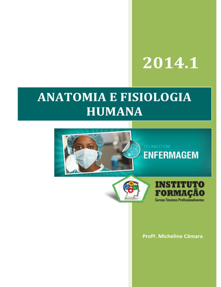 2014.1 ANATOMIA E FISIOLOGIA HUMANA Profª. Micheline Câmara 2 APRESENTAÇÃO A Anatomia constitui um dos estudos mais antigos da humanidade. Cinco milênios antes de Cristo os egípcios já desenvolveram técnicas de conservação dos corpos e rudimentares intervenções cirúrgicas. Na Grécia, Hipócrates, conhecido como o pai da medicina, dissecava os corpos em busca de compreensão para os mistérios da vida. Para entender as estruturas e as funções do corpo humano, estudaremos as ciências da anatomia e da fisiologia. A anatomia (anatome=cortar em partes, corta separando) refere-se ao estudo da estrutura e das relações entre estas estruturas. A fisiologia (do grego physis = natureza, função ou funcionamento; e logos = palavra ou estudo) lida com as funções das partes do corpo, isto é, como elas trabalham. A função nunca pode ser separada completamente da estrutura, por isso você aprenderá sobre o corpo humano estudando a anatomia e a fisiologia em conjunto. Você verá como cada estrutura do corpo está designada para desempenhar uma função específica, e como a estrutura de uma parte, muitas vezes, determina sua função. Você está iniciando o estudo do corpo humano e pode aprender como ele é organizado e como funciona. Através deste módulo você será introduzido aos vários sistemas que compõem o nosso organismo. Você também aprenderá como estes sistemas, em geral, cooperam entre si, para manter a saúde do corpo como um todo e como estes sistemas interagem para mantêlo saudável. www.ifcursos.com.br Anatomia e Fisiologia Humana Micheline Câmara 3 CAPITULO I ESTRUTURA DO CORPO HUMANO Níveis de Organização O corpo humano possui seis níveis de organização estrutural: o químico, o celular, o tecidual, o orgânico, o sistêmico e o de organismo. Nível químico: inclui todas as substâncias químicas necessárias para manter a vida. As substâncias químicas são constituídas de átomos, a menor unidade de matéria, e alguns deles, como o carbono (C), o hidrogênio (H), o oxigênio (O), o nitrogênio (N), o cálcio (Ca), o potássio (K) e o sódio (Na) são essenciais para a manutenção da vida. Os átomos combinam-se para formar moléculas. Exemplos familiares de moléculas são as proteínas, os carboidratos, as gorduras e as vitaminas. As moléculas, por sua vez, combinam-se para formar o próximo nível de organização: o nível celular. Nível celular: Qualquer organismo vivo é composto de células. As células são unidades estruturais e funcionais básicas de um organismo. É nelas que se executam as atividades metabólicas. Entre os muitos tipos de células existentes em seu corpo estão as células musculares, nervosas e sanguíneas. Cada uma tem estruturas diferentes e cada uma desenvolve uma função diferente. Nível tecidual: Os tecidos são grupos de células semelhantes na aparência, função e origem embrionária que, juntas, realizam uma função particular. Os tipos básicos de tecido são: tecido epitelial, tecido de sustentação, tecido sanguíneo, tecido muscular e tecido nervoso. Nível orgânico: quando diferentes tipos de tecidos estão unidos formam o nível orgânico. Os órgãos são compostos de dois ou mais tecidos diferentes, têm funções específicas e geralmente apresentam uma forma reconhecível. Exemplos de órgãos: o coração, os pulmões, o cérebro, etc. Nível sistêmico: Um sistema consiste de órgãos relacionados que desempenham uma função comum. Exemplo: O sistema digestório que funciona na digestão e na absorção dos alimentos é composto pelos seguintes órgãos: boca, glândulas salivares, faringe (garganta), esôfago, estômago, intestino delgado, intestino grosso, fígado, vesícula biliar e pâncreas. O sistema é a base para o plano estrutural geral de um corpo. Organismo: O mais alto nível de organização é o organismo. Todos os sistemas do corpo, funcionando como um todo compõe o organismo = um ser vivo. Relação entre os sistemas À medida que os sistemas do corpo forem estudados com mais profundidade, você verá como eles funcionam para manter a saúde, protege-lo contra doenças e permitir a reprodução da espécie. Exemplo de interação entre os sistemas: consideramos como dois sistemas do corpo – os sistemas tegumentar e esquelético – cooperam entre si. O sistema tegumentar (pele, pêlos e unhas) protege todos os sistemas do corpo, incluído o sistema ósseo, por meio da função de barreira entre o ambiente externo e os tecidos e os órgãos internos. A pele (cútis) também está envolvida na produção de vitamina D, da qual o corpo necessita para a utilização apropriada de cálcio (mineral necessário para o crescimento e desenvolvimento dos ossos). O www.ifcursos.com.br Anatomia e Fisiologia Humana Micheline Câmara 4 sistema esquelético, por sua vez fornece sustentação para o sistema tegumentar. A essas interações entre os sistemas dá-se o nome de Aparelho. Processos Vitais Todos os organismos vivos apresentam certas características que os diferenciam das coisas não-vivas. Os processos vitais importantes no ser humano são: O metabolismo (metábole=mudança): que é a soma de todos os processos químicos que ocorrem no corpo. Uma fase do metabolismo, chamada de catabolismo (cata=para baixo), envolve o desdobramento de moléculas complexas em moléculas menores e mais simples. Um exemplo é a quebra de proteínas alimentares em seus constituintes, os aminoácidos. A outra fase do metabolismo, chamada de anabolismo (ana=para cima), utiliza energia gerada pelo catabolismo para a construção dos componentes estruturais e funcionais do corpo. Um exemplo de anabolismo é a síntese protética que forma músculo e ossos. A responsibilidade é a capacidade de detectar e responder às mudanças no meio externo (ambiente fora do corpo). Células diferentes detectam diferentes alterações e respondem de maneira característica. Por exemplo, os neurônios (cél