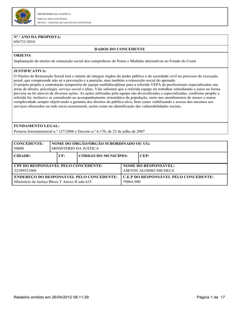 MINISTERIO DA JUSTICA PORTAL DOS CONVÊNIOS SICONV - SISTEMA DE GESTÃO DE CONVÊNIOS Nº / ANO DA PROPOSTA: 056721/2010 DADOS DO CONCEDENTE OBJETO: Implantação do núcleo de reinserção social dos cumpridores de Penas e Medidas alternativas no Estado do Ceará JUSTIFICATIVA: O Núcleo de Reinserção Social terá o intuito de integrar órgãos do poder público e da sociedade civil no processo de execução penal, que compreende não só a prevenção e a punição, mas também a reinserção social do apenado. O projeto propõe a contratação temporária de equipe multidisciplinar para a referida VEPA de profissionais especializados nas áreas de direito, psicologia, serviço social e afins. Vale salientar que a referida equipe irá trabalhar subsidiando o juízo na forma prevista na lei através de diversas ações. As ações utilizadas pela equipe são diversificadas e especializadas, conforme propõe a referida lei, inclusive se estendendo ao acompanhamento sistemático da população, tanto nos atendimentos de menor e maior complexidade sempre objetivando a garantia dos direitos do público-alvo, bem como viabilizando a acesso dos mesmos aos serviços oferecidos na rede sócio-assistencial, assim como na identificação das vulnerabilidades sociais. FUNDAMENTO LEGAL: Portaria Interministerial n.º 127/2008 e Decreto n.º 6.170, de 25 de julho de 2007 CONCEDENTE: 30000 CIDADE: NOME DO ÓRGÃO/ÓRGÃO SUBORDINADO OU UG: MINISTERIO DA JUSTICA UF: CÓDIGO DO MUNICÍPIO: CEP: CPF DO RESPONSÁVEL PELO CONCEDENTE: 22189521068 NOME DO RESPONSÁVEL: AIRTON ALOISIO MICHELS ENDEREÇO DO RESPONSÁVEL PELO CONCEDENTE: Ministério da Justiça Bloco T Anexo II sala 633 C.E.P DO RESPONSÁVEL PELO CONCEDENTE: 70064-900 Relatório emitido em 26/04/2012 08:11:29 Página 1 de 17 2 - DADOS DO PROPONENTE PROPONENTE: 07954530000118 RAZÃO SOCIAL DO PROPONENTE: SECRETARIA DA JUSTICA E CIDADANIA DO ESTADO DO CEARA ENDEREÇO JURÍDICO DO PROPONENTE: Rua Tenente Benevolo, 1055 CIDADE: FORTALEZA UF: CE CÓDIGO MUNICÍPIO: 1389 BANCO: 104 - CAIXA ECONOMICA AGÊNCIA: 0919-9 CPF DO RESPONSÁVEL PELO PROPONENTE: 02040778349 CEP: 60160-040 E.A.: DDD/TELEFONE: Administração 85-31012865 Pública Estadual ou do Distrito Federal 0060014139 CONTA CORRENTE: NOME DO RESPONSÁVEL: ANTONIO LUIZ ABREU DANTAS ENDEREÇO DO RESPONSÁVEL PELO PROPONENTE: Rua Tenente Benévolo, 1055, Bairro Meireles Relatório emitido em 26/04/2012 08:11:29 Página 2 de 17 3- DADOS DO INTERVENIENTE INTERVENIENTE: 07954480000179 RAZÃO SOCIAL DO INTERVENIENTE: CEARA GOVERNO DO ESTADO ENDEREÇO JURÍDICO DO INTERVENIENTE: AV. BARÃO DE STUDART, 505 CIDADE: FORTALEZA UF: CE CÓDIGO CEP: MUNICÍPIO: 60120-000 1389 CPF DO RESPONSÁVEL PELO INTERVENIENTE: 20912013320 DDD/TELEFONE: 3466-4004 E.A: Administração Pública Estadual ou do Distrito Federal NOME DO RESPONSÁVEL: CID FERREIRA GOMES ENDEREÇO DO RESPONSÁVEL PELO INTERVENIENTE: Rua Silva Paulet, 455 Relatório emitido em 26/04/2012 08:11:29 Página 3 de 17 4 - DADOS DO EXECUTOR/VALORES VALOR GLOBAL: R$ 292.000,00 VALOR DA CONTRAPARTIDA: R$ 34.800,00 VALOR DOS REPASSES: Ano Valor 2010 R$ 257.200,00 VALOR DA CONTRAPARTIDA FINANCEIRA: R$ 34.800,00 VALOR DA CONTRAPARTIDA EM BENS E SERVIÇOS: R$ 0,00 INÍCIO DE VIGÊNCIA: 20/12/2010 FIM DE VIGÊNCIA: 20/10/2012 VIGÊNCIA DO CONVÊNIO: 2012 Relatório emitido em 26/04/2012 08:11:29 Página 4 de 17 5 - PLANO DE TRABALHO Meta nº: 1 Especificaçã Implantação do núcleo de reinserção social dos cumpridores de Penas e Medidas alternativas no Estado do Ceará UN UNIDADE DE QUANTIDADE: 1.0 Valor: R$ 292.000,00 Início Previsto: 20/12/2010 Término Previsto: 20/10/2012 Sigla UF: CE Código Município: 1389 Valor Global: R$ 292.000,00 Município: FORTALEZA Endereço: CEP: Etapa/Fase nº: 1 Especificação: Aquisição de material de consumo Quantidade: 1.0 Valor: R$ 33.366,00 Início Previsto: 31/12/2010 Término 30/05/2011 Início Previsto: 31/12/2010 Término 30/05/2011 Início Previsto: 31/12/2010 Término 20/10/2012 Etapa/Fase nº: 2 Especificação: Aquisição de material permanente Quantidade: 1.0 Valor: R$ 49.834,00 Etapa/Fase nº: 3 Especificação: Contratação de Serviços de Pessoa Jurídica Quantidade: 1.0 Valor: R$ 208.800,00 6 - CRONOGRAMA DE DESEMBOLSO MINISTERIO DA JUSTICA MÊS DESEMBOLSO: Dezembro ANO: 2010 META Nº: 1 VALOR DA META: DESCRIÇÃO: Implantação do núcleo de reinserção social dos cumpridores de Penas e Medidas alternativas no Estado do Ceará R$ 257.200,00 VALOR DO REPASSE: R$ 257.200,00 PARCELA Nº:1 7 - CRONOGRAMA DE DESEMBOLSO SECRETARIA DA JUSTICA E CIDADANIA DO ESTADO DO CEARA MÊS DESEMBOLSO: Dezembro ANO: 2010 META Nº: 1 VALOR DA META: DESCRIÇÃO: Implantação do núcleo de reinserção social dos cumpridores de Penas e Medidas alternativas no Estado do Ceará R$ 34.800,00 VALOR DO REPASSE: R$ 34.800,00 PARCELA Nº:1 Relatório emitido em 26/04/2012 08:11:29 Página 5 de 17 8 - PLANO DE APLICAÇÃO DETALHADO DESCRIÇÃO DO BEM/SERVIÇO: Lixeiras NATUREZA DA AQUISIÇÃO: Recursos do Convênio NATUREZA DA DESPESA: 449052 ENDEREÇO DE LOCALIZAÇÃO: Rua Desembargador Floriano Benevides 220, Bairro Edson Queiroz CEP: 60811-902 UF: CE CÓDIGO DO MUNICÍPIO: 1389 UNIDADE: UN QUANTIDADE: 4,00 V. UNITÁRIO: R$ 25,00 MUNICÍPIO: FORTALEZA V.TOTAL: R$ 100,00 DESCRIÇÃO DO BEM/SERVIÇO: Cadeiras sem braço fixa NATUREZA DA AQUISIÇÃO: Recursos do Convênio NATUREZA DA DESPESA: 449052 ENDEREÇO DE LOCALIZAÇÃO: Rua Desembargador Floriano Benevides 220, Bairro Edson Queiroz CEP: 60811-902 UF: CE CÓDIGO DO MUNICÍPIO: 1389 UNIDADE: UN QUANTIDADE: 18,00 V. UNITÁRIO: R$ 500,00 MUNICÍPIO: FORTALEZA V.TOTAL: R$ 9.000,00 DESCRIÇÃO DO BEM/SERVIÇO: Cadeiras para computador NATUREZA DA AQUISIÇÃO: Recursos do Convênio NATUREZA DA DESPESA: 449052 ENDEREÇO DE LOCALIZAÇÃO: Rua Desembargador Floriano Benevides 220, Bairro Edson Queiroz CEP: 60811-902 UF: CE CÓDIGO DO MUNICÍPIO: 1389 UNIDADE: UN QUANTIDADE: 6