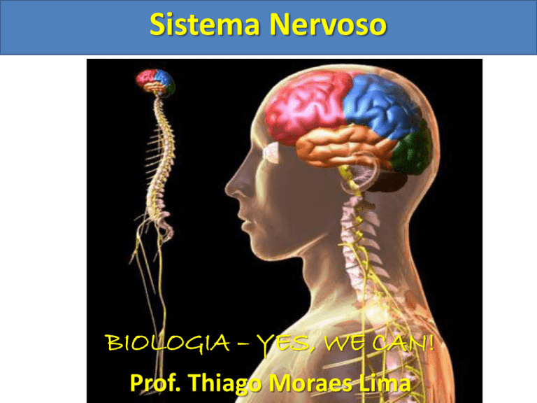 Sistema Nervoso BIOLOGIA – YES, WE CAN! Prof. Thiago Moraes Lima Sistema Nervoso 1) Introdução O sistema nervoso é responsável pelo ajustamento do organismo ao ambiente. Sua função é perceber e identificar as condições ambientais externas, bem como as condições reinantes dentro do próprio corpo e elaborar respostas que adaptem a essas condições. 2) Organização do sistema nervoso humano Cérebro Encéfalo Sistema Nervoso Central (SNC) Cerebelo Mesencéfalo Tronco Encefálico Ponte Bulbo Medula Sistema Nervoso Periférico (SNP) Nervos cranianos (12 pares) Nervos raquidianos (31 pares) Terminações nervosas Sistema Nervoso IMPULSO NERVOSO Sistema Nervoso Condução saltatória Sistema Nervoso 3) Sistema nervoso central (SNC) a) Encéfalo Possui cerca de 1,4 kg nos adultos Está localizado na caixa craniana Dividido em 3 partes: cérebro, cerebelo e tronco encefálico Encéfalo cérebro cerebelo Tronco encefálico Sistema Nervoso 3) Sistema nervoso central (SNC) a) Encéfalo I) Cérebro Constitui cerca de 90% da massa encefálica Sua superfície é bastante pregueada (aumento da superfície) Dividido em 2 hemisférios (esquerdo e direito) Dividido em duas partes: o Córtex (externo) – substância cinzenta (corpos neuronais) o Região interna – substância branca (dendritos e axônios) Sistema Nervoso 3) Sistema nervoso central (SNC) a) Encéfalo I) Cérebro Funções: o Sensações o Atos conscientes e voluntários (movimentos) o Pensamento o Memória o Inteligência o Aprendizagem o Sentidos o Equilíbrio Sistema Nervoso 3) Sistema nervoso central (SNC) a) Encéfalo I) Cérebro Tálamo e Hipotálamo (presentes na região inferior do cérebro) Tálamo o Reorganização dos estímulos nervosos o Percepção sensorial (consciência) Hipotálamo o Regulador da homeostase corporal o Temperatura o Apetite o Balanço hídrico o Controle da hipófise e outras glândulas Sistema Nervoso 3) Sistema nervoso central (SNC) I) Cérebro Tálamo e Hipotálamo Tálamo Hipotálamo Sistema Nervoso 3) Sistema nervoso central (SNC) II) Cerebelo Responsável pelo equilíbrio do corpo Tônus e vigor muscular Orientação espacial Coordenação dos movimentos Cerebelo Sistema Nervoso 3) Sistema nervoso central (SNC) III) Tronco encefálico 3 divisões: Mesencéfalo – controle das informações referentes ao estado de contração dos músculos e postura. Ponte – conecções fronto cerebelares. Mesencéfalo Ponte Bulbo Sistema Nervoso 3) Sistema nervoso central (SNC) III) Tronco encefálico Bulbo o Controle dos batimentos cardíacos o Controle dos movimentos respiratórios o Controle da deglutição (engolir) Bulbo Sistema Nervoso 3) Sistema nervoso central (SNC) b) Medula Espinhal (raque) Cordão cilíndrico que parte da base do encéfalo e percorre toda a coluna vertebral. Aloja-se dentro das perfurações das vértebras. Da medula espinhal partem 31 pares de nervos raquidianos Sistema Nervoso 3) Sistema nervoso central (SNC) b) Medula Espinhal (raque) Funções da medula o Recebe as informações de diversas partes do corpo e as enviam para o encéfalo e vice-versa. o Responsável pelos atos reflexos (reflexo medular). Sistema Nervoso 3) Sistema nervoso central (SNC) b) Medula Espinhal (raque) Reflexo Medular A medula espinhal é capaz de elaborar respostas rápidas em situações de emergência, sem a interferência do encéfalo. Sistema Nervoso 3) Sistema nervoso central (SNC) c) Meninges São três (SNC). o o o delicadas membranas que revestem e protegem o sistema nervoso central Dura-máter Aracnóide Pia-máter Medula espinhal Aracnóide possui o líquido cefalorraquidiano Encéfalo Sistema Nervoso Sistema Nervoso 4) Sistema nervoso periférico (SNP) Constituído por: a) Nervos b) Gânglios nervosos c) Terminações nervosas (receptores para dor, tato, frio, pressão, calor, paladar, etc.). Nervos São fios finos formados por vários axônios de neurônios envolvidos por tecido conjuntivo. Transmitem mensagens de várias partes do corpo para o sistema nervoso central ou destes para as regiões corporais. Sistema Nervoso 4) Sistema nervoso periférico (SNP) Gânglios nervosos o Aglomerado de corpos celulares de neurônios encontrados fora do sistema nervoso central. Corpos celulares Sistema Nervoso 4) Sistema nervoso periférico (SNP) Terminações Nervosas Captam estímulos do meio interno ou externo e os levam para o sistema nervoso central. Sistema Nervoso 4) Sistema nervoso periférico (SNP) Divisão do sistema nervoso periférico Sistema Nervoso Voluntário (somático) Ações conscientes: andar, falar, pensar, movimentar um braço, etc. Sistema Nervoso Autônomo (visceral) Ações inconscientes: controle da Simpático digestão, batimentos cardíacos, Parassimpático movimento das vísceras, etc. Sistema Nervoso 4) Sistema nervoso periférico (SNP) a) Sistema Nervoso Voluntário (Somático) Formado por nervos motores que conduzem impulsos do sistema nervoso central (SNC) à musculatura estriada esquelética. Determina ações conscientes: Andar, falar, abraçar, correr, etc. SNC Corpos celulares dentro do SNC Axônios controlando a musculatura esquelética Sistema Nervoso 4) Sistema nervoso periférico (SNP) b) Sistema Nervoso Autônomo (vegetativo ou visceral) Constituído por nervos motores que conduzem impulsos do sistema nervoso central à musculatura lisa de órgãos viscerais, músculos cardíacos e glândulas. Realiza o controle da digestão, sistema cardiovascular, excretor e endócrino. Os nervos do SNP autônomo possuem dois tipos de neurônios: I. Pré-ganglionares (corpo celular dentro do SNC) II. Pós-ganglionares (Corpo celular dentro do gânglio) órgão gânglio SNC Neurônio Pré-ganglionar Neurônio Pós-ganglionar Sistema Nervoso 4) Sistema nervoso periférico (SNP) b) Sistema Nervoso Autônomo É dividido em duas partes: I. Simpático II. Parassimpático Sistema Nervoso Simpático: Prepara o organismo para o estresse (instinto de fuga ou luta) Sistema Nervo