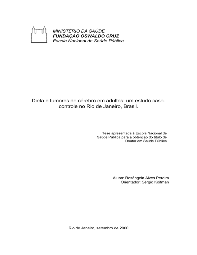 MINISTÉRIO DA SAÚDE FUNDAÇÃO OSWALDO CRUZ Escola Nacional de Saúde Pública Dieta e tumores de cérebro em adultos: um estudo casocontrole no Rio de Janeiro, Brasil. Tese apresentada à Escola Nacional de Saúde Pública para a obtenção do título de Doutor em Saúde Pública Aluna: Rosângela Alves Pereira Orientador: Sérgio Koifman Rio de Janeiro, setembro de 2000 “Quando médicos de grande perícia tiverem desenvolvido a cura de enfermidades por meio de alimentos, prescrevendo alimentos simples e proibindo às pessoas viver como escravos de seus desejos, é indubitável que se reduzirá a incidência de males crônicos e haverá imensa melhora na saúde geral de toda a humanidade.” ‘Abdu’I-Bahá (Selections from the writings of ‘Abdu’I-Bahá, p. 156) Aos meus filhos Agradecimentos Ao Eduardo, pelo muito que tem me estimulado e por me dar tranqüilidade nos momentos mais difíceis. Ao Fernando, Nuno, Ana Lia e Gabriel que são o meu maior incentivo, viveram a minha ausência mas, na sua escala de prioridades, colocaram o trabalho da mamãe como muito importante. Ao Sérgio Koifman, pela orientação e pela imensa paciência. Minha gratidão à Gina, pelo companheirismo e pela grande ajuda. À Célia Leitão, pelo auxílio e orientação inestimáveis na elaboração do questionário e no encaminhamento da pesquisa, sempre disposta a ouvir e trazendo valiosas contribuições. Agradeço à Vânia pelo estímulo e por sempre acreditar; também pela participação nas entrevistas, nos contatos com hospitais, telefonemas, idas e vindas, a disponibilidade dos dados do consultório, supervisão de bolsistas, enfim muita coisa ... Serei sempre grata à Rosely Sichieri, pelo grande incentivo e por estar sempre disponível para ler os rascunhos e dar valiosas opiniões e sugestões. Uma grande amiga que, com grande competência, tem trazido contribuições inéditas na área da Epidemiologia Nutricional no Brasil. Agradeço o apoio dos colegas o Departamento de Nutrição Social e Aplicada, do Instituto de Nutrição da Universidade Federal do Rio de Janeiro. Aos Serviços de Neurocirurgia e à Direção dos Hospitais que tiveram a gentileza de nos permitir realizar as entrevistas. Agradeço aos entrevistados que, na angústia da incerteza e da dor, se dispuseram a responder a um extenso questionário. Também sou grata às entrevistadoras que, com boa vontade, esforço e competência partilharam as dificuldades práticas envolvidas na realização de um trabalho como este: Alessandra, Daniele, Fabrícia, Glória, Nadja, Patrícia, Raíssa, Viviane Mukim e Viviane Borges. No caminho percorrido até atingir esta etapa, muitas e muitas pessoas passaram e deixaram, além de muitas saudades, estímulo e incentivo. Eu não teria conseguido completar mais esta etapa de vida se não tivesse recebido desde pequena as orientações e o apoio de meus padrinhos Zuleika e Amaro Araújo, hoje já falecidos, mas vivos em meu coração. Gostaria de agradecer todos que me ajudaram a crescer como profissional e como mulher, mãe e cidadã, principalmente, à solidariedade que sempre encontrei nas minhas grandes amigas. Resumo Os tumores de cérebro vêm ganhando importância devido ao aparente aumento da sua incidência e por sua alta letalidade. Não está, ainda, esclarecido se a elevação das taxas de tumores cerebrais é reflexo da modificação do risco de desenvolver a doença, ou se é conseqüência da melhoria dos métodos de diagnóstico, porque, apesar dos avanços na pesquisa epidemiológica e de genética molecular, a etiologia dos tumores de cérebro permanece desconhecida. A investigação da associação entre fatores da dieta e tumores de cérebro tem considerado os compostos N-nitroso como favorecedores do desenvolvimento desses tumores, e as vitaminas C e E atuando como protetores. Desenvolve-se na Região Metropolitana do Rio de Janeiro um estudo caso-controle de base hospitalar com o objetivo de determinar a magnitude da associação entre fatores de risco ambientais e os tumores de cérebro em adultos. São definidos como casos indivíduos de 30-65 anos, residentes na mesma região, internados em hospitais específicos com tumor primário de cérebro. Os controles são indivíduos internados nas mesmas instituições, pareados por sexo e freqüência de idade, residentes na mesma área, excluídos os que tiverem diagnóstico de câncer ou de nosologias que tenham os componentes da dieta entre os seus fatores de risco. Para a obtenção dos dados utiliza-se um questionário com questões referentes à exposição a fatores de risco diversos como campos eletromagnéticos, exposições ocupacionais, radiação ionizante; defensivos agrícolas, contato com animais, uso de tabaco, álcool e medicamentos, antecedentes familiares de câncer; história de traumatismo craniano e os padrões de alimentação na adolescência e no ano anterior ao diagnóstico. Esta tese, composta por um conjunto de quatro artigos, explora algumas das questões mais relevantes que emergem no estudo da epidemiologia dos tumores de cérebro, particularmente, os métodos empregados na avaliação do papel que os fatores da dieta exercem no desenvolvimento destes tumores. Os dois primeiros artigos são uma revisão crítica da literatura científica publicada sobre a validação de métodos de avaliação do relato retrospectivo de dieta pregressa e sobre as evidências da associação entre dieta e câncer. O terceiro artigo apresenta os resultados da validação do instrumento utilizado para averiguar a dieta praticada na adolescência e o quarto, a análise dos dados obtidos no estudo-piloto da investigação de desenho caso-controle descrita acima. Este trabalho permitiu demonstrar que a investigação retrospectiva do consumo de alimentos é um estimador mais confiável do padrão alimentar pregresso do que as informações sobre dieta recente. Um questionário de freqüência do consumo de alimen