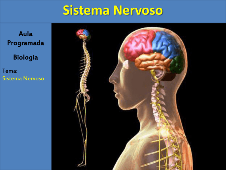 Sistema Nervoso Aula Programada Biologia Tema: Sistema Nervoso Sistema Nervoso 1) Introdução O sistema nervoso é responsável pelo ajustamento do organismo ao ambiente. Sua função é perceber e identificar as condições ambientais externas, bem como as condições reinantes dentro do próprio corpo e elaborar respostas que adaptem a essas condições. 2) Organização do sistema nervoso humano Cérebro Encéfalo Sistema Nervoso Central (SNC) Cerebelo Mesencéfalo Tronco Encefálico Ponte Bulbo Medula Sistema Nervoso Periférico (SNP) Nervos cranianos (12 pares) Nervos raquidianos (31 pares) Terminações nervosas Sistema Nervoso 3) Sistema nervoso central (SNC) a) Encéfalo Possui cerca de 1,4 kg nos adultos Está localizado na caixa craniana Dividido em 3 partes: cérebro, cerebelo e tronco encefálico Encéfalo cérebro cerebelo Tronco encefálico Sistema Nervoso 3) Sistema nervoso central (SNC) a) Encéfalo I) Cérebro Constitui cerca de 90% da massa encefálica Sua superfície é bastante pregueada (aumento da superfície) Dividido em dois hemisférios (esquerdo e direito) Dividido em duas partes: o Córtex (externo) – substância cinzenta (corpos neuronais) o Região interna – substância branca (dendritos e axônios) Sistema Nervoso 3) Sistema nervoso central (SNC) a) Encéfalo I) Cérebro Funções: o Sensações o Atos conscientes e voluntários (movimentos) o Pensamento o Memória o Inteligência o Aprendizagem o Sentidos o Equilíbrio Sistema Nervoso 3) Sistema nervoso central (SNC) a) Encéfalo I) Cérebro Tálamo e Hipotálamo (presentes na região inferior do cérebro) Tálamo o Reorganização dos estímulos nervosos o Percepção sensorial (consciência) Hipotálamo o Regulador da homeostase corporal o Temperatura o Apetite o Balanço hídrico o Controle da hipófise e outras glândulas Sistema Nervoso 3) Sistema nervoso central (SNC) I) Cérebro Tálamo e Hipotálamo Tálamo Hipotálamo Sistema Nervoso 3) Sistema nervoso central (SNC) II) Cerebelo Responsável pelo equilíbrio do corpo Tônus e vigor muscular Orientação espacial Coordenação dos movimentos Cerebelo Sistema Nervoso 3) Sistema nervoso central (SNC) III) Tronco encefálico 3 divisões: Mesencéfalo Ponte Bulbo Mesencéfalo Ponte Bulbo Sistema Nervoso 3) Sistema nervoso central (SNC) III) Tronco encefálico Mesencéfalo o Recepção e coordenação da contração muscular o Postura corporal Mesencéfalo Sistema Nervoso 3) Sistema nervoso central (SNC) III) Tronco encefálico Ponte o Manutenção da postura corporal, equilíbrio do corpo e tônus muscular. Ponte Sistema Nervoso 3) Sistema nervoso central (SNC) III) Tronco encefálico Bulbo o Controle dos batimentos cardíacos o Controle dos movimentos respiratórios o Controle da deglutição (engolir) Bulbo Sistema Nervoso 3) Sistema nervoso central (SNC) b) Medula Espinhal (raque) Cordão cilíndrico que parte da base do encéfalo e percorre toda a coluna vertebral. Aloja-se dentro das perfurações das vértebras. Da medula espinhal partem 31 pares de nervos raquidianos Sistema Nervoso 3) Sistema nervoso central (SNC) b) Medula Espinhal (raque) Funções da medula o Recebe as informações de diversas partes do corpo e as enviam para o encéfalo e vice-versa. o Responsável pelos atos reflexos (reflexo medular). Sistema Nervoso 3) Sistema nervoso central (SNC) b) Medula Espinhal (raque) Reflexo Medular A medula espinhal é capaz de elaborar respostas rápidas em situações de emergência, sem a interferência do encéfalo. Sistema Nervoso 3) Sistema nervoso central (SNC) c) Meninges São três (SNC). o o o delicadas membranas que revestem e protegem o sistema nervoso central Dura-máter Aracnóide Pia-máter Medula espinhal Encéfalo Sistema Nervoso 4) Sistema nervoso periférico (SNP) Constituído por: a) Nervos b) Gânglios nervosos c) Terminações nervosas (receptores para dor, tato, frio, pressão, calor, paladar, etc.). Nervos São fios finos formados por vários axônios de neurônios envolvidos por tecido conjuntivo. Transmitem mensagens de várias partes do corpo para o sistema nervoso central ou destes para as regiões corporais. Sistema Nervoso 4) Sistema nervoso periférico (SNP) Classificação dos nervos I) Quanto ao tipo de neurônio Sensitivos ou aferentes (contém apenas neurônios sensitivos) Motores ou eferentes (contém apenas neurônios motores) Mistos (contém neurônios sensitivos e motores) II) Quanto à posição anatômica Cranianos (ligados ao encéfalo) – 12 pares Raquidianos ou espinhais (ligados à medula) – 31 pares Sistema Nervoso 4) Sistema nervoso periférico (SNP) Gânglios nervosos o Aglomerado de corpos celulares de neurônios encontrados fora do sistema nervo central. Corpos celulares Sistema Nervoso 4) Sistema nervoso periférico (SNP) Terminações Nervosas Captam estímulos do meio interno ou externo e os levam para o sistema nervoso central. Sistema Nervoso 4) Sistema nervoso periférico (SNP) Divisão do sistema nervoso periférico Sistema Nervoso Voluntário (somático) Ações conscientes: andar, falar, pensar, movimentar um braço, etc. Sistema Nervoso Autônomo (visceral) Ações inconscientes: controle da Simpático digestão, batimentos cardíacos, Parassimpático movimento das vísceras, etc. Sistema Nervoso 4) Sistema nervoso periférico (SNP) a) Sistema Nervoso Voluntário (Somático) Formado por nervos motores que conduzem impulsos do sistema nervoso central (SNC) à musculatura estriada esquelética. Determina ações conscientes: Andar, falar, abraçar, correr, etc. SNC Corpos celulares dentro do SNC Axônios controlando a musculatura esquelética Sistema Nervoso 4) Sistema nervoso periférico (SNP) b) Sistema Nervoso Autônomo (vegetativo ou visceral) Constituído por nervos motores que conduzem impulsos do sistema nervoso central à musculatura lisa de órgãos viscerais, músculos cardíacos e glândulas. Realiza o controle da digestão, sistema cardiovascular, excretor e endócrino
