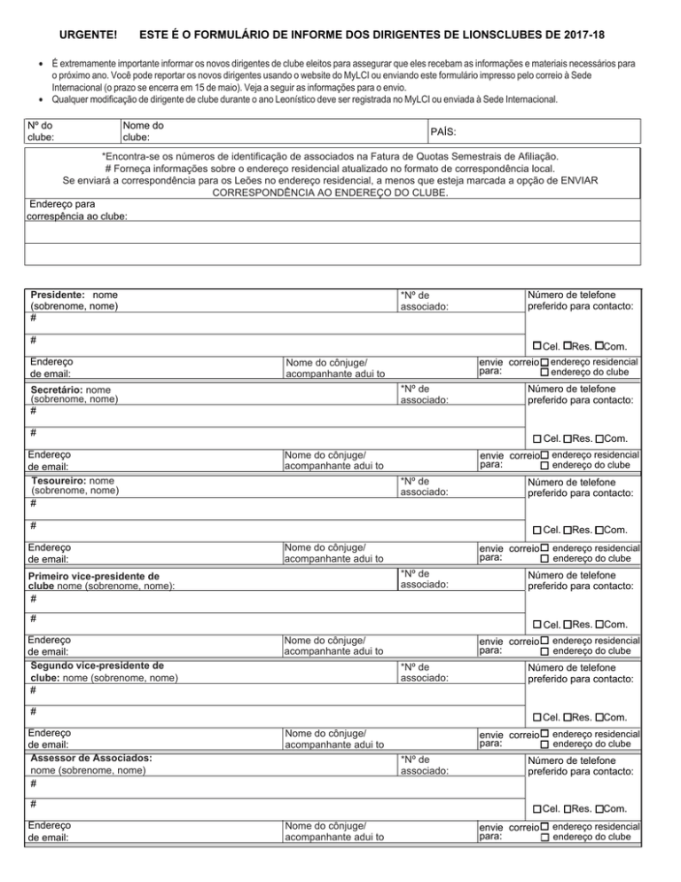URGENTE! ESTE É O FORMULÁRIO DE INFORME DOS DIRIGENTES DE LIONSCLUBES DE 2017-18 • É extremamente importante informar os novos dirigentes de clube eleitos para assegurar que eles recebam as informações e materiais necessários para o próximo ano. Você pode reportar os novos dirigentes usando o website do MyLCI ou enviando este formulário impresso pelo correio à Sede Internacional (o prazo se encerra em 15 de maio). Veja a seguir as informações para o envio. • Qualquer modificação de dirigente de clube durante o ano Leonístico deve ser registrada no MyLCI ou enviada à Sede Internacional. Nº do clube: Nome do clube: PAÍS: *Encontra-se os números de identificação de associados na Fatura de Quotas Semestrais de Afiliação. # Forneça informações sobre o endereço residencial atualizado no formato de correspondência local. Se enviará a correspondência para os Leões no endereço residencial, a menos que esteja marcada a opção de ENVIAR CORRESPONDÊNCIA AO ENDEREÇO DO CLUBE. Endereço para correspência ao clube: Presidente: nome (sobrenome, nome) # *Nº de associado: Número de telefone preferido para contacto: # Endereço de email: Cel. envie correio para: Nome do cônjuge/ acompanhante adui to *Nº de associado: Secretário: nome (sobrenome, nome) # Cel. Nome do cônjuge/ acompanhante adui to envie correio para: *Nº de associado: Cel. Nome do cônjuge/ acompanhante adui to envie correio para: *Nº de associado: Primeiro vice-presidente de clube nome (sobrenome, nome): # envie correio para: *Nº de associado: envie correio para: *Nº de associado: Res. Com. endereço residencial endereço do clube Cel. Nome do cônjuge/ acompanhante adui to Com. Número de telefone preferido para contacto: # Endereço de email: Res. endereço residencial endereço do clube Cel. Nome do cônjuge/ acompanhante adui to Com. Número de telefone preferido para contacto: # Endereço de email: Assessor de Associados: nome (sobrenome, nome) # Res. endereço residencial endereço do clube Cel. Nome do cônjuge/ acompanhante adui to Com. Número de telefone preferido para contacto: # Endereço de email: Segundo vice-presidente de clube: nome (sobrenome, nome) # Res. endereço residencial endereço do clube Número de telefone preferido para contacto: # Endereço de email: Com. Número de telefone preferido para contacto: # Endereço de email: Tesoureiro: nome (sobrenome, nome) # Res. endereço residencial endereço do clube envie correio para: Res. Com. endereço residencial endereço do clube *Nº de associado: Coordenador de clube de LCIF : nome(sobrenome, nome) # Número de telefone preferido para contacto: # Cel. Endereço de email: Nome do cônjuge/ acompanhante adui to envie correio para: Res. Com. endereço residencial endereço do clube INFORMAÇÕES SOBRE AS REUNIÕES DO CLUBE Se houver alguma mudança nas informações relativas às reuniões, indique-as abaixo ou envie-as pelo MyLCI >> Meu Lions Clube >> Info sobre o clube. Dom Seg Ter Qua Sex Qui Sáb A cada semana Local das reuniões: Endereço: 1ª semana Cidade: 2ª semana 3ª semana Se o endereço do website do clube foi alterado: 4ª semana URL do website do clube: Semanas alternadas Horário INSTRUÇÕES PARA O ENVIO A) Este formulário pode ser enviado pelo atual presidente ou secretário do clube Como atual (selecione um) Presidente do clube Secretário do clube Certifico que a informação acima está correta. Meu nome: Meu nº de associado: Assinatura eletrônica: A pessoa enviando esta informação deve enviar este formulário para [email protected] usando o seu endereço de email principal. A respectiva conta de email servirá como assinatura eletrônica. OU Assinatura por escrito: A pessoa enviando esta informação deve imprimir este formulário, assinar abaixo e enviá-lo por fax para 630-571-1687 ou pelo correio para: Lions Clubs International Member Service Center 300 West 22nd Street Oak Brook, IL 60523-8842 EUA B) PU101 3/17 Assinatura: __________________________________________ Como alternativa, pode-se reportar os dirigentes do próximo ano através do website MyLCI. http://mylci.lionsclubs.org