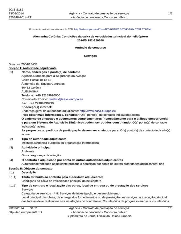 JO/S S182 23/09/2014 320348-2014-PT Agência - Contrato de prestação de serviços - Anúncio de concurso - Concurso público 1/5 O presente anúncio no sítio web do TED: http://ted.europa.eu/udl?uri=TED:NOTICE:320348-2014:TEXT:PT:HTML Alemanha-Colónia: Condições da caixa de velocidades principal do helicóptero 2014/S 182-320348 Anúncio de concurso Serviços Directiva 2004/18/CE Secção I: Autoridade adjudicante I.1) Nome, endereços e ponto(s) de contacto Agência Europeia para a Segurança da Aviação Caixa Postal 10 12 53 À atenção de: Equipa Contratos 50452 Colónia ALEMANHA Telefone: +49 22189990000 Correio electrónico: [email protected] Fax: +49 22189990999 Endereço(s) internet: Endereço geral da autoridade adjudicante: http://www.easa.europa.eu Para obter mais informações, consultar: O(s) ponto(s) de contacto indicado(s) acima O caderno de encargos e documentos complementares (nomeadamente para o diálogo concorrencial e para um Sistema de Aquisição Dinâmico) podem ser obtidos consultando: O(s) ponto(s) de contacto indicado(s) acima As propostas ou pedidos de participação devem ser enviados para: O(s) ponto(s) de contacto indicado(s) acima I.2) Tipo de autoridade adjudicante Instituição/Agência europeia ou organização internacional I.3) Actividade principal Ambiente Outra: segurança da aviação. I.4) O contrato é adjudicado por conta de outras autoridades adjudicantes A autoridade/entidade adjudicante procede à aquisição por conta de outras autoridades adjudicantes: não Secção II: Objecto do contrato II.1) Descrição II.1.1) Título atribuído ao contrato pela autoridade adjudicante: Condições da caixa de velocidades principal do helicóptero. II.1.2) Tipo de contrato e localização das obras, local de entrega ou de prestação dos serviços Serviços Categoria de serviços n.º 8: Serviços de investigação e desenvolvimento Local principal das obras, de entrega dos fornecimentos ou de prestação dos serviços: a execução principal das tarefas deve realizar-se nas instalações do contratante. Os relatórios de progresso mensais, os relatórios 23/09/2014 S182 http://ted.europa.eu/TED Agência - Contrato de prestação de serviços - Anúncio de concurso - Concurso público Suplemento do Jornal Oficial da União Europeia 1/5 JO/S S182 23/09/2014 320348-2014-PT Agência - Contrato de prestação de serviços - Anúncio de concurso - Concurso público 2/5 intercalares bem como o relatório final devem ser apresentados nas instalações da Agência em Colónia/ Alemanha. Código NUTS DEA23 II.1.3) Informação acerca do contrato público, acordo-quadro ou Sistema de Aquisição Dinâmico (SAD) O anúncio implica a celebração de um contrato público II.1.4) Informação sobre o acordo-quadro II.1.5) Descrição resumida do contrato ou da(s) aquisição(ões) Realização de um estudo sobre as condições da caixa de velocidades principal do helicóptero. II.1.6) Vocabulário comum para os contratos públicos (Classificação CPV) 73000000, 73100000, 73200000, 73210000, 73111000, 73110000 II.1.7) Informação relativa ao Acordo sobre Contratos Públicos (ACP) Contrato abrangido pelo Acordo sobre Contratos Públicos (ACP): não II.1.8) Lotes Contrato dividido em lotes: não II.1.9) Informação sobre as variantes São aceites variantes: não II.2) Quantidade ou âmbito do contrato II.2.1) Quantidade total ou âmbito: Valor estimado, sem IVA: Intervalo: entre 120 000 e 150 000 EUR II.2.2) Informação sobre as opções Opções: sim Descrição das opções: a AESA pode, à sua discrição, prolongar a duração e/ou alargar o âmbito do projeto sob reserva de disponibilidade de fundos e do desempenho satisfatório por parte do contratante. II.2.3) Informação sobre as reconduções O contrato é passível de recondução: não II.3) Duração do contrato ou prazo de execução Duração em meses: 10 (a contar da data de adjudicação) Secção III: Informação de carácter jurídico, económico, financeiro e técnico III.1) Condições relativas ao contrato III.1.1) Cauções e garantias exigidas: III.1.2) Principais condições de financiamento e modalidades de pagamento e/ou referência às disposições que as regulam: Consultar a documentação do concurso conexa disponível na página Web de contratos da agência, no seguinte endereço Internet: http://www.easa.europa.eu/the-agency/procurement/calls-for-tender III.1.3) Forma jurídica que deve assumir o agrupamento de operadores económicos ao qual vai ser adjudicado o contrato: Consultar a documentação do concurso conexa disponível na página Web de contratos da agência, no seguinte endereço Internet: http://www.easa.europa.eu/the-agency/procurement/calls-for-tender III.1.4) Outras condições especiais A execução do contrato está sujeita a condições especiais: não III.2) Condições de participação 23/09/2014 S182 http://ted.europa.eu/TED Agência - Contrato de prestação de serviços - Anúncio de concurso - Concurso público Suplemento do Jornal Oficial da União Europeia 2/5 JO/S S182 23/09/2014 320348-2014-PT Agência - Contrato de prestação de serviços - Anúncio de concurso - Concurso público 3/5 III.2.1) Situação pessoal dos operadores económicos, nomeadamente requisitos em matéria de inscrição em registos profissionais ou comerciais Informação e formalidades necessárias para verificar o cumprimento dos requisitos: consultar a documentação do concurso conexa disponível na página Web de contratos da agência, no seguinte endereço Internet: http:// www.easa.europa.eu/the-agency/procurement/calls-for-tender III.2.2) Capacidade económica e financeira Informação e formalidades necessárias para verificar o cumprimento dos requisitos: consultar a documentação do concurso conexa disponível na página Web de contratos da agência, no seguinte endereço Internet: http:// www.easa.europa.eu/the-agency/procurement/calls-for-tender Nível(is) mínim