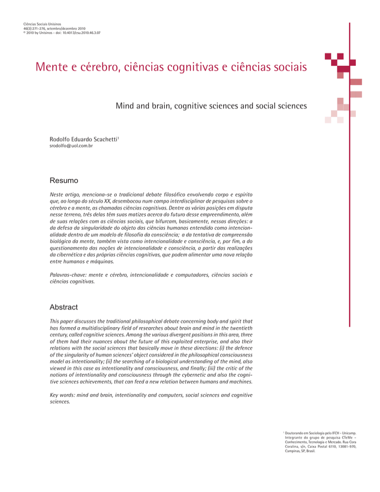 Ciências Sociais Unisinos 46(3):271-276, setembro/dezembro 2010 © 2010 by Unisinos - doi: 10.4013/csu.2010.46.3.07 Mente e cérebro, ciências cognitivas e ciências sociais Mind and brain, cognitive sciences and social sciences Rodolfo Eduardo Scachetti1 [email protected] Resumo Neste artigo, menciona-se o tradicional debate filosófico envolvendo corpo e espírito que, ao longo do século XX, desembocou num campo interdisciplinar de pesquisas sobre o cérebro e a mente, as chamadas ciências cognitivas. Dentre as várias posições em disputa nesse terreno, três delas têm suas matizes acerca do futuro desse empreendimento, além de suas relações com as ciências sociais, que bifurcam, basicamente, nessas direções: a da defesa da singularidade do objeto das ciências humanas entendido como intencionalidade dentro de um modelo de filosofia da consciência; a da tentativa de compreensão biológica da mente, também vista como intencionalidade e consciência, e, por fim, a do questionamento das noções de intencionalidade e consciência, a partir das realizações da cibernética e das próprias ciências cognitivas, que podem alimentar uma nova relação entre humanos e máquinas. Palavras-chave: mente e cérebro, intencionalidade e computadores, ciências sociais e ciências cognitivas. Abstract This paper discusses the traditional philosophical debate concerning body and spirit that has formed a multidisciplinary field of researches about brain and mind in the twentieth century, called cognitive sciences. Among the various divergent positions in this area, three of them had their nuances about the future of this exploited enterprise, and also their relations with the social sciences that basically move in these directions: (i) the defence of the singularity of human sciences’ object considered in the philosophical consciousness model as intentionality; (ii) the searching of a biological understanding of the mind, also viewed in this case as intentionality and consciousness, and finally; (iii) the critic of the notions of intentionality and consciousness through the cybernetic and also the cognitive sciences achievements, that can feed a new relation between humans and machines. Key words: mind and brain, intentionality and computers, social sciences and cognitive sciences. 1 Doutorando em Sociologia pelo IFCH - Unicamp. Integrante do grupo de pesquisa CTeMe – Conhecimento, Tecnologia e Mercado. Rua Cora Coralina, s/n, Caixa Postal 6110, 13081-970, Campinas, SP, Brasil. Mente e cérebro, ciências cognitivas e ciências sociais 272 Introdução A busca das ciências cognitivas por uma teoria geral da mente não pode ser considerada totalmente nova. Obras como as de René Descartes (2004) e as do médico Julien Offray de La Mettrie (1982), por exemplo, reservaram, nos séculos XVII e XVIII, destaque a expressões como “alma” e “espírito” em detrimento de “mente”, traço ainda observável em trabalhos bem mais recentes como os do filósofo Henri Bérgson (1990). Mas, seguramente, há uma certa unidade de preocupação, apesar dessa flutuação de termos, nessa temática que teria sido colocada em pauta, portanto, a partir do século XVII, chegando, na expressão de John R. Searle, a constituir “alguns dos maiores esforços intelectuais do século XX” (Searle, 1984, p. 25). Postular tal unidade encontra abrigo justamente na identificação do propósito, sempre presente nesses esforços, de pensar a relação entre corpo e alma, ou corpo e espírito, ou ainda, empregando uma forma mais ao sabor das ciências cognitivas e dos tempos de hoje, entre cérebro e mente. Muitos já se debruçaram sobre as soluções cartesianas ou as bergsonianas para o problema, e outros prosseguem investindo esforços nesses terrenos. Há também aqueles que decidiram recuperar o trabalho de La Mettrie, mobilizando inclusive sua figura para refletir sobre o momento presente. E, naturalmente, há filósofos e outros especialistas que preferem acompanhar a problemática da relação entre cérebro e mente, tal qual vem se desenvolvendo no bojo das chamadas ciências cognitivas. É sobre alguns destes últimos que se pretende tratar aqui, colocando, com maior destaque, três deles em pauta, visando explorar algumas das bases sobre as quais vem se instalando o debate acerca do futuro das ciências cognitivas e de seus possíveis reflexos para as ciências sociais. Searle, Del Nero e Dupuy: três posições Na década de 80, Searle escreve Mente, cérebro e ciência, no qual combate, com instrumental filosófico, as perspectivas de que as ciências cognitivas, apoiadas no surgimento e desenvolvimento dos computadores, pudessem resolver o “hiato entre o cérebro e a mente” (Searle, 1984, p. 53). Na esteira dessa tarefa, o filósofo extrai as consequências de sua tese central para as ciências sociais. Na década seguinte, Jean-Pierre Dupuy revisa, na obra Nas origens das ciências cognitivas, a história do surgimento da cibernética e propôs que ela esteve, com sua “tentativa fisicalista de conquistar as ciências da mente” (Dupuy, 1996, p. 211), na base do surgimento das ciências cognitivas, potencializada, como já havia destacado Searle, pelo avanço dos computadores. Dupuy constrói um livro sobre a história das ideias, como ele próprio defende, e, por essa razão, não tem como preocupação central apresentar um quadro preciso acerca das chances de sucesso do empreendimento das ciências cognitivas, representa- do pelo desejo de modelização computacional plena da mente. Por isso, pensando a cibernética e as ciências cognitivas como fruto de uma movimentação de ideias nos meios científicofilosóficos por ele inventariados, Dupuy se propõe a investigar as condições de surgimento desse campo interdisciplinar e sua influência, inclusive sobre as ciências sociais e a filosofia (particularmente na França). No final dos anos 90, no contexto brasileiro, o médico