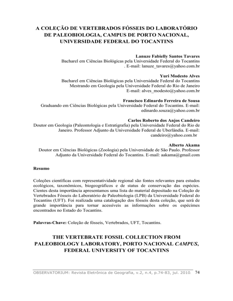 A COLEÇÃO DE VERTEBRADOS FÓSSEIS DO LABORATÓRIO DE PALEOBIOLOGIA, CAMPUS DE PORTO NACIONAL, UNIVERSIDADE FEDERAL DO TOCANTINS Lanuze Fabielly Santos Tavares Bacharel em Ciências Biológicas pela Universidade Federal do Tocantins . E-mail: [email protected] Yuri Modesto Alves Bacharel em Ciências Biológicas pela Universidade Federal do Tocantins Mestrando em Geologia pela Universidade Federal do Rio de Janeiro E-mail: [email protected] Francisco Edinardo Ferreira de Sousa Graduando em Ciências Biológicas pela Universidade Federal do Tocantins. E-mail: [email protected] Carlos Roberto dos Anjos Candeiro Doutor em Geologia (Paleontologia e Estratigrafia) pela Universidade Federal do Rio de Janeiro. Professor Adjunto da Universidade Federal de Uberlândia. E-mail: [email protected] Alberto Akama Doutor em Ciências Biológicas (Zoologia) pela Universidade de São Paulo. Professor Adjunto da Universidade Federal do Tocantins. E-mail: [email protected] Resumo Coleções científicas com representatividade regional são fontes relevantes para estudos ecológicos, taxonômicos, biogeográficos e de status de conservação das espécies. Cientes desta importância apresentamos uma lista do material depositado na Coleção de Vertebrados Fósseis do Laboratório de Paleobiologia (LPB) da Universidade Federal do Tocantins (UFT). Foi realizada uma catalogação dos fósseis desta coleção, que será de grande importância para tornar acessíveis as informações sobre os espécimes encontrados no Estado do Tocantins. Palavras-Chave: Coleção de fósseis, Vertebrados, UFT, Tocantins. THE VERTEBRATE FOSSIL COLLECTION FROM PALEOBIOLOGY LABORATORY, PORTO NACIONAL CAMPUS, FEDERAL UNIVERSITY OF TOCANTINS OBSERVATORIUM: Revista Eletrônica de Geografia, v.2, n.4, p.74-83, jul. 2010. 74 A coleção de vertebrados fósseis do laboratório de paleobiologia, campus de Porto Nacional, Universidade Federal do Tocantins Lanuze Fabielly Santos Tavares et al. Scientific collections with regional representation are important sources for ecological, taxonomic, biogeographic studies and the conservation status of species. Aware of this importance, a list of material deposited in the collection of vertebrate fossils of the Laboratory of Paleobiology (LPB), at Federal University of Tocantins (UFT) is presented. A catalog of this collection of fossils has been created, which should be of great importance to make the information on the specimens found in the state of Tocantins accessible. Introdução A Paleontologia e a geologia sedimentar constituem ciências relativamente novas, e no Brasil são muito recentes. Mesmo assim, existem algumas instituições que se destacam pelas coleções de fósseis e desenvolvimento de estudos e pesquisas sobre a fauna e flora pretéritas do país. O Laboratório de Paleobiologia (LPB) dedica-se ao estudo paleontológico de vertebrados e invertebrados, muitos deles provenientes, da Bacia do Parnaíba, mas também há muitos exemplares coletados em diversas bacias sedimentares do Brasil, e.g., Ceará, Minas Gerais, Rio Grande do Sul e São Paulo. O acervo do LPB foi formado a partir de exemplares já depositados na Universidade Federal do Tocantins (UFT), doados por terceiros, coletados em atividades disciplinares e em trabalhos de conclusão de curso dos alunos de graduação da UFT. Os fósseis já estavam depositados na Universidade Federal do Tocantins, mas o Laboratório de Paleobiologia só foi implantado na UFT no ano de 2007, onde estão representantes de 146 taxa de vertebrados (76 de répteis e 70 de anfíbios), perfazendo o total de 1889 exemplares. O LPB do Curso de Ciências Biológicas, do Campus de Porto Nacional da UFT, possui uma coleção de fósseis que abrange além dos vertebrados, os invertebrados, icnofósseis (de invertebrados) e madeiras fossilizadas, Benício et al. (2008). O Laboratório é responsável pela conservação, preparação e divulgação desse acervo e tem fornecido material para monografias, além do atendimento a pesquisadores de várias partes do Brasil e do Mundo, Candeiro et al. (2007). Em 2004 teve início uma revitalização da coleção, com a melhoria das condições de armazenamento e a revisão da identificação dos espécimes. E em 2007 foi realizado OBSERVATORIUM: Revista Eletrônica de Geografia, v.2, n.4, p.74-83, jul. 2010. 75 A coleção de vertebrados fósseis do laboratório de paleobiologia, campus de Porto Nacional, Universidade Federal do Tocantins Lanuze Fabielly Santos Tavares et al. o levantamento e organização da coleção de vertebrados fósseis do LPB, já que parte deste material era pouco divulgado (TAVARES et al., 2007; TAVARES et al, 2008a). Este inventário tem demonstrado o potencial desta coleção em futuros estudos científicos; particularmente sobre a paleofauna de vertebrados do Estado do Tocantins, já que é fonte para o desenvolvimento de monografias, dissertações e teses. Breve Histórico da Paleontologia e da Geologia Os estudos acerca da evolução da história da Terra são muito recentes. Pitágoras, filósofo e matemático grego, afirmava que os fósseis eram restos de animais ou plantas que viveram há muito tempo. Passou-se muito tempo até começar o estudo para explicar a natureza fossilífera e a evolução do planeta Terra. No século XVIII começaram as primeiras teorias para explicar como os fósseis se formavam e a sua preservação em alguns tipos e camadas de rochas. O anatomista e geólogo, Nicolau Steno (1638-1686), foi um dos pioneiros pesquisadores a analisar a natureza dos fósseis. Ele estudou as posições das rochas sedimentares e também formulou que a acumulação dos sedimentos, em qualquer ambiente sedimentar, origina uma seqüência de camadas ou estratos, onde os estratos mais antigos são cobertos pelos mais recentes – o Princípio da Sobreposição. E desde que os estratos sedimentares não tenham sofrido qualquer modificação na sua horizontalidade acumu