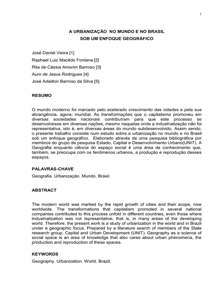 1 A URBANIZAÇÃO NO MUNDO E NO BRASIL SOB UM ENFOQUE GEOGRÁFICO José Daniel Vieira [1] Raphael Luiz Macêdo Fontana [2] Rita de Cássia Amorim Barroso [3] Auro de Jesus Rodrigues [4] José Adailton Barroso da Silva [5] RESUMO O mundo moderno foi marcado pelo acelerado crescimento das cidades e pela sua abrangência, agora, mundial. As transformações que o capitalismo promoveu em diversas sociedades nacionais contribuíram para que este processo se desenvolvesse em diversas nações, mesmo naquelas onde a industrialização não foi representativa, isto é, em diversas áreas do mundo subdesenvolvido. Assim sendo, o presente trabalho consiste num estudo sobre a urbanização no mundo e no Brasil sob um enfoque geográfico. Elaborado através de uma pesquisa bibliográfica por membros do grupo de pesquisa Estado, Capital e Desenvolvimento Urbano(UNIT). A Geografia enquanto ciência do espaço social é uma área de conhecimento que, também, se preocupa com os fenômenos urbanos, a produção e reprodução desses espaços. PALAVRAS-CHAVE Geografia. Urbanização. Mundo. Brasil. ABSTRACT The modern world was marked by the rapid growth of cities and their scope, now worldwide. The transformations that capitalism promoted in several national companies contributed to this process unfold in different countries, even those where industrialization was not representative, that is, in many areas of the developing world. Therefore, the present work is a study of urbanization in the world and in Brazil under a geographic focus. Prepared by a literature search of members of the State research group, Capital and Urban Development (UNIT). Geography as a science of social space is an area of knowledge that also cares about urban phenomena, the production and reproduction of these spaces. KEYWORDS Geography. Urbanization. World. Brazil. 2 1 INTRODUÇÃO Nas últimas décadas, as cidades têm representado uma grande conquista do homem moderno. Hoje em dia são elas que dirigem e organizam o mundo, pois se concentram nas mesmas os grandes centros de decisões político-econômicas e científico-tecnológicas. É importante enfatizar que as sociedades na atualidade apresentam um panorama direcionado ao processo de urbanização. Todavia, apesar dos avanços tecnológicos e científicos, a qualidade de vida das populações urbanas ainda não é satisfatória, pois existem as disparidades socioeconômicas que aumentam cada vez mais nos espaços urbanos. Assim, é necessário um maior aprofundamento dos estudos sobre a questão da urbanização. A Geografia como ciência do espaço social, é uma área de conhecimento que, também se preocupa com os fenômenos urbanos. São temas que preocupam a Geografia: a origem das cidades e os seus diversos momentos histórico-espaciais; a produção e reprodução das cidades contemporâneas; as redes, hierarquia e funções urbanas; o planejamento urbano; a urbanização e a população no Mundo e no Brasil. O presente trabalho consiste num estudo sobre a urbanização no mundo e no Brasil sob um enfoque geográfico. Elaborado através de uma pesquisa bibliográfica por membros do grupo de pesquisa Estado, Capital e Desenvolvimento Urbano(UNIT). 2 O URBANO De modo geral, pode-se dizer que “a urbanização é um processo caracterizado pelo aumento da população urbana devido à migração de pessoas que saem do campo em direção à cidade.” (LUCCI et al, 2005, p. 434). A ideia de urbanização está intimamente associada à concentração de muitas pessoas em um espaço restrito (a cidade) e na substituição das atividades primárias (agropecuária) por atividades secundárias (indústrias) e terciárias (serviços). Entretanto, por se tratar de um processo, costuma-se conceituar a urbanização como sendo "o aumento da população urbana em relação à população rural", e nesse sentido só 3 ocorre urbanização quando o percentual de aumento da população urbana é superior a da população rural. Embora o aumento populacional demográfico seja relevante para caracterizar a urbanização, “ela decorre de mudanças econômicas, impulsionadas por avanços tecnológicos, científicos e administrativos, e as transformações sociais, que envolvem visão de mundo, hábitos e consumo e a formação de uma identidade cultural.” (LUCCI et al, 2005, p. 434). Urbanização é um fenômeno relacionado ao processo de desenvolvimento da esfera urbana em determinadas sociedades, em oposição ao desenvolvimento da esfera rural. Está historicamente ligada à evolução do capitalismo, especialmente em sua fase industrial. A urbanização é estudada por ciências diversas, como a sociologia, a geografia e a antropologia, cada uma delas propondo abordagens diferentes sobre o problema do crescimento das cidades. 3 A CIDADE NA PRÉ-HISTÓRIA O surgimento das cidades ocorreu no fim da pré-história, já que no início a sociedade primitiva não desenvolveu a cidade, pois o homem era nômade. No Paleolítico os pequenos grupos humanos nômades viviam da caça, pesca e coleta de alimentos e por um artesanato rudimentar com fabricação de instrumentos de pedra lascada e ossos. Viviam constantemente se deslocando em busca de alimentos e na dependência da natureza. No Período Neolítico, o homem passou a cultivar o solo, a domesticar os animais, a polir a pedra, a fabricar objetos de cerâmica e a viver em aldeias. Com a agricultura, surgem os primeiros aldeamentos fixos e a terra da aldeia se tornou de uso comum e era lavrada coletivamente. Durante esse período o homem passa ao processo de sedentarização, isto é, deixa de ser coletor nômade e passa a ser um homem sedentário e agricultor. Também, com a agricultura e o aldeamento, a população começa a crescer em números de indivíduos. Por volta de 6000 a.C., principalmente nos vales dos grandes rios como o Nilo, o Tigre, o Eufrates, o Indo e o Ganges, os homens tiveram necessidade de se organizar melhor, a