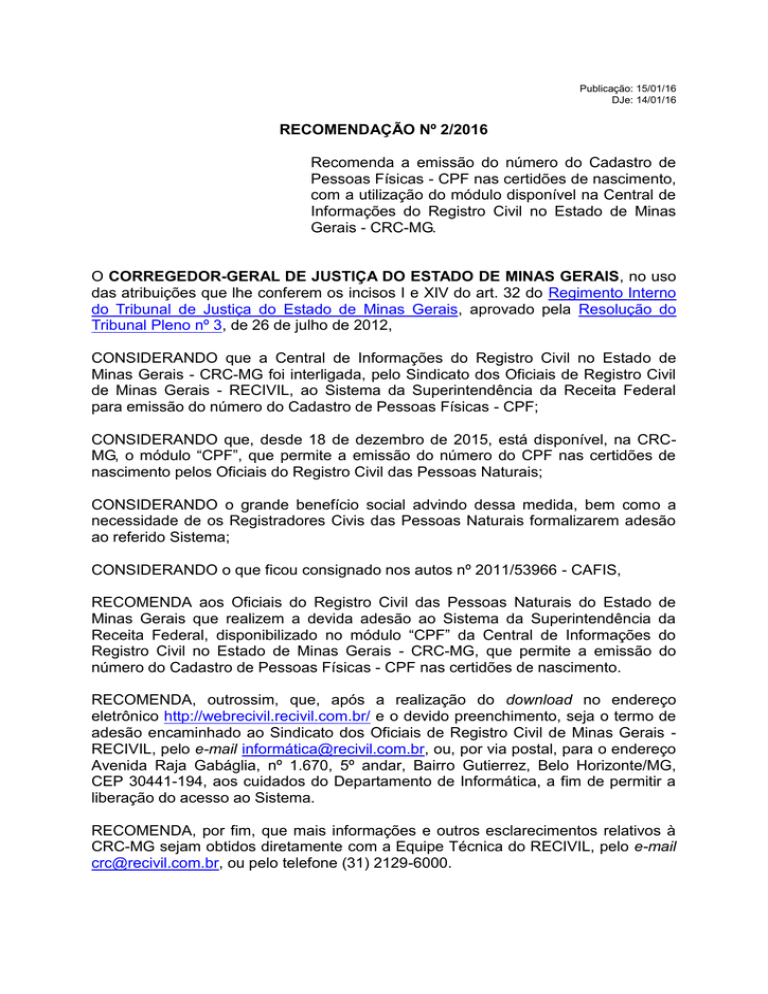 Publicação: 15/01/16 DJe: 14/01/16 RECOMENDAÇÃO Nº 2/2016 Recomenda a emissão do número do Cadastro de Pessoas Físicas - CPF nas certidões de nascimento, com a utilização do módulo disponível na Central de Informações do Registro Civil no Estado de Minas Gerais - CRC-MG. O CORREGEDOR-GERAL DE JUSTIÇA DO ESTADO DE MINAS GERAIS, no uso das atribuições que lhe conferem os incisos I e XIV do art. 32 do Regimento Interno do Tribunal de Justiça do Estado de Minas Gerais, aprovado pela Resolução do Tribunal Pleno nº 3, de 26 de julho de 2012, CONSIDERANDO que a Central de Informações do Registro Civil no Estado de Minas Gerais - CRC-MG foi interligada, pelo Sindicato dos Oficiais de Registro Civil de Minas Gerais - RECIVIL, ao Sistema da Superintendência da Receita Federal para emissão do número do Cadastro de Pessoas Físicas - CPF; CONSIDERANDO que, desde 18 de dezembro de 2015, está disponível, na CRCMG, o módulo “CPF”, que permite a emissão do número do CPF nas certidões de nascimento pelos Oficiais do Registro Civil das Pessoas Naturais; CONSIDERANDO o grande benefício social advindo dessa medida, bem como a necessidade de os Registradores Civis das Pessoas Naturais formalizarem adesão ao referido Sistema; CONSIDERANDO o que ficou consignado nos autos nº 2011/53966 - CAFIS, RECOMENDA aos Oficiais do Registro Civil das Pessoas Naturais do Estado Minas Gerais que realizem a devida adesão ao Sistema da Superintendência Receita Federal, disponibilizado no módulo “CPF” da Central de Informações Registro Civil no Estado de Minas Gerais - CRC-MG, que permite a emissão número do Cadastro de Pessoas Físicas - CPF nas certidões de nascimento. de da do do RECOMENDA, outrossim, que, após a realização do download no endereço eletrônico http://webrecivil.recivil.com.br/ e o devido preenchimento, seja o termo de adesão encaminhado ao Sindicato dos Oficiais de Registro Civil de Minas Gerais RECIVIL, pelo e-mail informá[email protected], ou, por via postal, para o endereço Avenida Raja Gabáglia, nº 1.670, 5º andar, Bairro Gutierrez, Belo Horizonte/MG, CEP 30441-194, aos cuidados do Departamento de Informática, a fim de permitir a liberação do acesso ao Sistema. RECOMENDA, por fim, que mais informações e outros esclarecimentos relativos à CRC-MG sejam obtidos diretamente com a Equipe Técnica do RECIVIL, pelo e-mail [email protected], ou pelo telefone (31) 2129-6000. Belo Horizonte, 12 de janeiro de 2016. Desembargador ANTÔNIO SÉRVULO DOS SANTOS Corregedor-Geral de Justiça
