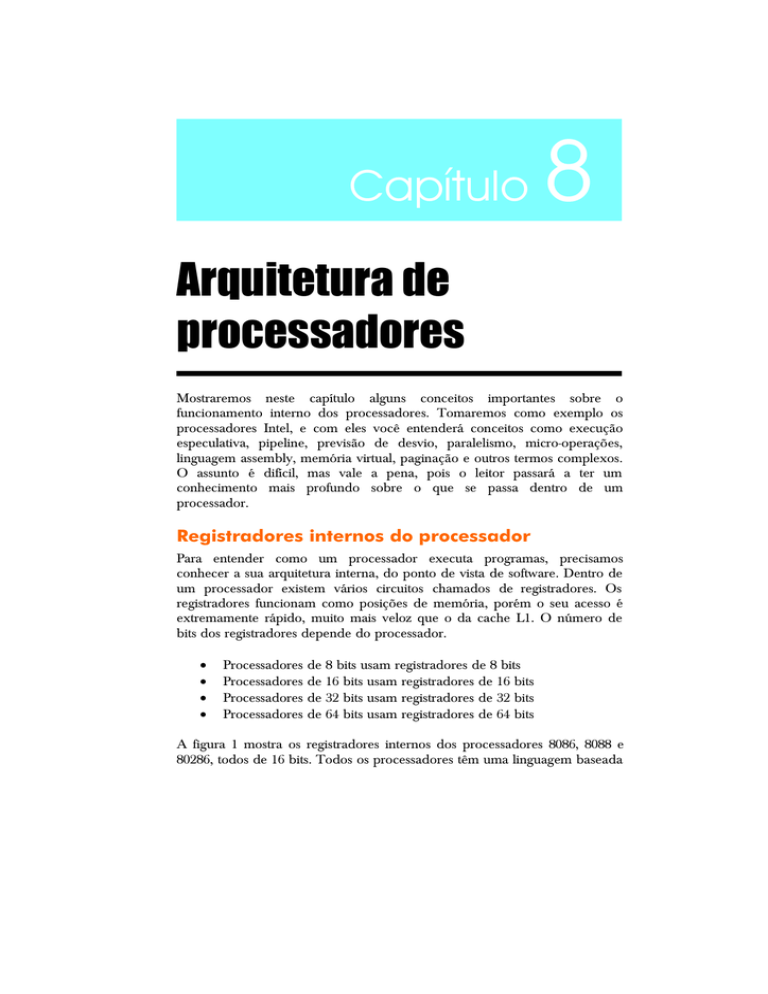 Capítulo 8 Arquitetura de processadores Mostraremos neste capítulo alguns conceitos importantes sobre o funcionamento interno dos processadores. Tomaremos como exemplo os processadores Intel, e com eles você entenderá conceitos como execução especulativa, pipeline, previsão de desvio, paralelismo, micro-operações, linguagem assembly, memória virtual, paginação e outros termos complexos. O assunto é difícil, mas vale a pena, pois o leitor passará a ter um conhecimento mais profundo sobre o que se passa dentro de um processador. Registradores internos do processador Para entender como um processador executa programas, precisamos conhecer a sua arquitetura interna, do ponto de vista de software. Dentro de um processador existem vários circuitos chamados de registradores. Os registradores funcionam como posições de memória, porém o seu acesso é extremamente rápido, muito mais veloz que o da cache L1. O número de bits dos registradores depende do processador. Processadores Processadores Processadores Processadores de 8 bits usam registradores de 8 bits de 16 bits usam registradores de 16 bits de 32 bits usam registradores de 32 bits de 64 bits usam registradores de 64 bits A figura 1 mostra os registradores internos dos processadores 8086, 8088 e 80286, todos de 16 bits. Todos os processadores têm uma linguagem baseada 8-2 Hardware Total em códigos numéricos na memória. Cada código significa uma instrução. Por exemplo, podemos ter uma instrução para somar o valor de AX com o valor de BX e guardar o resultado em AX. As instruções do processador que encontramos na memória são o que chamamos de linguagem de máquina. Nenhum programador consegue criar programas complexos usando a linguagem de máquina, pois ela é formada por códigos numéricos. É verdade que alguns programadores conseguem fazer isso, mas não para programas muito longos, pois tornam-se difíceis de entender e de gerenciar. Ao invés disso, são utilizados códigos representados por siglas. As siglas são os nomes das instruções, e os operandos dessas instruções são os registradores, valores existentes na memória e valores constantes. Figura 8.1 Registradores internos do processador 8086. Por exemplo, a instrução que acabamos de citar, que soma o valor dos registradores AX e BX e guarda o resultado em AX, é representada por: ADD AX,BX Esta instrução é representada na memória pelo seguinte código de máquina: 01 D8 Portanto a instrução ADD AX,BX é representada na memória por dois bytes, com valores 01 e D8 (em hexadecimal). Os bytes na memória que formam os programas são o que chamamos de linguagem de máquina. Esse códigos são lidos e executados pelo processador. Já as representações por siglas, como “ADD AX,BX”, formam o que chamamos de linguagem assembly. Quando programamos em linguagem assembly, estamos utilizando Capítulo 8 – Arquitetura de processadores 8-3 as instruções nativas do processador. A linguagem assembly é usada para escrever programas que têm contato direto com o hardware, como o BIOS e drivers. O assembly também é chamado linguagem de baixo nível, pois interage intimamente com o hardware. Programas que não necessitam deste contato direto com o hardware não precisam ser escritos em assembly, e são em geral escritos em linguagens como C, Pascal, Delphi, Basic e diversas outras. Essas são chamadas linguagens de alto nível. Nas linguagens de alto nível, não nos preocupamos com os registradores do processador, nem com a sua arquitetura interna. Os programas pensam apenas em dados, matrizes, arquivos, telas, etc. Apresentamos abaixo um pequeno trecho de um programa em linguagem assembly. Em cada linha deste programa temos na parte esquerda, os endereços, formados por duas partes (segmento e offset). A seguir temos as instruções em códigos de máquina, e finalmente as instruções em assembly. Endereço --------1B8D:0100 1B8D:0102 1B8D:0103 1B8D:0104 1B8D:0106 1B8D:010A 1B8D:010C 1B8D:0110 1B8D:0113 1B8D:0117 1B8D:011A 1B8D:011D Código ------------01D8 C3 16 B03A 380685D5 750E 804E0402 BF86D5 C6460000 E85F0B 8B7E34 007C1B Assembly -----------------------------ADD AX,BX RET PUSH SS MOV AL,3A CMP [D585],AL JNZ 011A OR BYTE PTR [BP+04],02 MOV DI,D586 MOV BYTE PTR [BP+00],00 CALL 0C79 MOV DI,[BP+34] ADD [SI+1B],BH Quando estamos programando em linguagem assembly, escrevemos apenas os nomes das instruções. Depois de escrever o programa, usando um editor de textos comum, usamos um programa chamado compilador de linguagem assembly, ou simplesmente, Assembler. O que este programa faz é ler o arquivo com as instruções (arquivo fonte) e gerar um arquivo contendo apenas os códigos das instruções, em linguagem de máquina (arquivo objeto). O arquivo objeto passa ainda por um processo chamado link edição, e finalmente se transforma em um programa, que pode ser executado pelo processador. O Assembler também gera um arquivo de impressão, contendo os endereços, códigos e instruções em assembly, como no trecho de listagem que mostramos acima. O programador pode utilizar esta listagem para depurar o programa, ou seja, testar o seu funcionamento. 8-4 Hardware Total Os códigos hexadecimais que representam as instruções do processador são chamados de opcodes. As siglas que representam essas instruções são chamadas de mnemônicos. Daremos neste capítulo, noções básicas da linguagem assembly dos processadores modernos. Não ensinaremos a linguagem a fundo, mas o suficiente para você entender como os processadores trabalham. Como a programação nos processadores modernos é relativamente complexa, começaremos com o 8080, de 8 bits. A arquitetura do 8080 deu origem à do 8086, que por sua vez deu origem ao 386 e aos processadores modernos. Entendendo o 8080, que é bem mais simples, será mais fácil entender os processadores modernos. Linguagem Assembly 8080 Aprender assembly do 8080 não é uma inutilidade, por duas razões.
