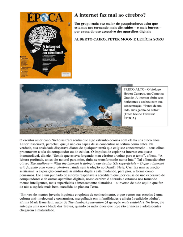 A internet faz mal ao cérebro? Um grupo cada vez maior de pesquisadores acha que estamos nos tornando mais distraídos – e mais burros – por causa do uso excessivo dos aparelhos digitais ALBERTO CAIRO, PETER MOON E LETÍCIA SORG PREÇO ALTO - O biólogo Hebert Campos, em Campina Grande. A internet abriu seus horizontes e acabou com sua concentração. “Perco de um lado, mas ganho do outro” (Foto: Kleide Teixeira/ ÉPOCA) O escritor americano Nicholas Carr sentiu que algo estranho ocorria com ele há uns cinco anos. Leitor insaciável, percebeu que já não era capaz de se concentrar na leitura como antes. Na verdade, sua ansiedade disparava diante de qualquer tarefa que exigisse concentração – seus olhos procuravam a tela do computador ou do celular. O impulso de espiar na internet era quase incontrolável, diz ele. “Sentia que estava forçando meu cérebro a voltar para o texto”, afirma. “A leitura profunda, antes tão natural para mim, tinha se transformado numa luta.” Tal afirmação abre o livro The shallows – What the internet is doing to our brains (Os superficiais – O que a internet está fazendo com nossos cérebros, ainda sem tradução no Brasil). Nele, Carr faz uma acusação seriíssima: a exposição constante às mídias digitais está mudando, para pior, a forma como pensamos. Ele e um punhado de autores respeitáveis acreditam que, por causa do uso excessivo de computadores e de outros aparelhos digitais, nosso cérebro é alterado e estamos nos tornando menos inteligentes, mais superficiais e imensamente distraídos – o inverso de tudo aquilo que fez de nós a espécie mais bem-sucedida do planeta Terra. “Em vez de mentes juvenis inquietas e repletas de conhecimento, o que vemos nas escolas é uma cultura anti-intelectual e consumista, mergulhada em infantilidades e alheia à realidade adulta”, afirma Mark Bauerlein, autor de The dumbest generation (A geração mais estúpida). No livro, ele antecipa uma nova Idade das Trevas, quando os indivíduos que hoje são crianças e adolescentes chegarem à maturidade. Bauerlein, professor na Universidade Emory, na Geórgia, supervisiona estudos sobre a vida cultural americana. Ele acredita que as novas gerações, educadas sob a influência das mídias digitais, são formadas por narcisistas despreparados para pensar em profundidade sobre qualquer assunto. Ele diz que uma pesquisa de 2006 com mais de 81 mil estudantes americanos de ensino médio detectou que 90% deles “leem ou estudam” menos de cinco horas por semana – embora passem “pelo menos” seis horas navegando na internet e um período equivalente assistindo à TV ou jogando videogame. “Indivíduos que não sabem praticamente nada de história, que nunca leram um livro nem visitaram um museu não têm mais do que se envergonhar. Tornaram-se comuns”, afirma. Carr e Bauerlein não estão sozinhos. A jornalista Maggie Jackson, outra autora crítica da tecnologia, sugere que os mais jovens estão acostumados, por culpa da internet e do uso de celulares, à leitura desatenta de textos cada dia mais breves e estilisticamente mais pobres. Os 140 caracteres que se podem escrever no Twitter, ela acredita, geram pensamentos máximos de 140 caracteres. Parece exagero, mas alguns estudos mostram que há motivos para preocupação. Uma consultoria chamada Genera divulgou um estudo alarmante sobre os efeitos do uso da internet entre os jovens. A empresa entrevistou 6 mil pessoas da geração que cresceu usando a internet e concluiu que as coisas estão mudando radicalmente. “A imersão digital afetou até mesmo a forma como eles absorvem informação”, afirmam os pesquisadores. “Eles não leem uma página necessariamente da esquerda para a direita e de cima para baixo. Pulam de uma palavra para outra, atrás de informação pertinente.” Um efeito disso já foi notado por um professor da Universidade Duke. Ele reclamou com o autor de The shallows que não consegue mais que seus alunos leiam um único livro do começo ao fim, mesmo nos cursos de literatura. GERAÇÃO VELOZ Jovens chineses jogam online e navegam na internet num cibercafé na província de Hubei. O cérebro parece se adaptar ao ritmo do computador (Foto: Imaginechina/Corbis). Se as críticas ao uso dos computadodores partissem apenas de intelectuais preocupados com a ruptura de padrões tradicionais, não haveria problemas. Professores se queixando da preguiça de seus alunos era comum nos séculos XX e XIX e, certamente, antes disso. Esse tipo de evidência circunstancial pode ser facilmente contestado por exemplos contrários, que existem abundantemente, mostrando que há milhões de jovens concentrados que leem e estudam com afinco. Mas os críticos vão além das velhas reclamações. Experimentos como o do professor de comunicação Clifford Nass, da Universidade Stanford, são mais difíceis de rechaçar. Eles sugerem que pessoas acostumadas ao funcionamento multitarefa do computador – que permite fazer várias coisas ao mesmo tempo – tendem a imitar a máquina, tocando várias atividades ao mesmo tempo. Escrevem, falam ao telefone, consultam a internet, ouvem música. Tudo simultaneamente, ou quase. As consequências são perversas. Elas erram, ficam irritadas por quase nada e qualquer estímulo as distrai. O estudo mostra que, quanto mais a pessoa se julga eficiente fazendo várias coisas ao mesmo tempo, pior ela as faz. E, quando é necessário que se concentrem numa única atividade por longo tempo, elas precisam de muito mais esforço. A Associação Americana de Psicologia define multitarefa como “a tendência a fazer mais de um trabalho que precise de atenção ao mesmo tempo, como falar ao telefone e escrever uma mensagem eletrônica”. Ela diz que esse hábito promovido pelas novas tecnologias tornou-se um problema. Sério. O motivo é simples: nossa capacidade de atenção é limitada. Quanto mais ela é fracionada, menos funciona. É um problema qu