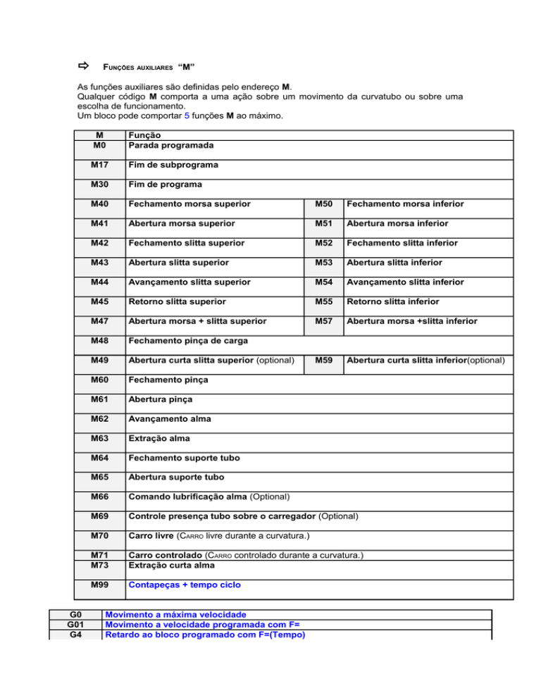 ð FUNÇÕES AUXILIARES “M” As funções auxiliares são definidas pelo endereço M. Qualquer código M comporta a uma ação sobre um movimento da curvatubo ou sobre uma escolha de funcionamento. Um bloco pode comportar 5 funções M ao máximo. G0 G01 G4 M M0 Função Parada programada M17 Fim de subprograma M30 Fim de programa M40 Fechamento morsa superior M50 Fechamento morsa inferior M41 Abertura morsa superior M51 Abertura morsa inferior M42 Fechamento slitta superior M52 Fechamento slitta inferior M43 Abertura slitta superior M53 Abertura slitta inferior M44 Avançamento slitta superior M54 Avançamento slitta inferior M45 Retorno slitta superior M55 Retorno slitta inferior M47 Abertura morsa + slitta superior M57 Abertura morsa +slitta inferior M48 Fechamento pinça de carga M49 Abertura curta slitta superior (optional) M59 Abertura curta slitta inferior(optional) M60 Fechamento pinça M61 Abertura pinça M62 Avançamento alma M63 Extração alma M64 Fechamento suporte tubo M65 Abertura suporte tubo M66 Comando lubrificação alma (Optional) M69 Controle presença tubo sobre o carregador (Optional) M70 Carro livre (CARRO livre durante a curvatura.) M71 M73 Carro controlado (CARRO controlado durante a curvatura.) Extração curta alma M99 Contapeças + tempo ciclo Movimento a máxima velocidade Movimento a velocidade programada com F= Retardo ao bloco programado com F=(Tempo) G90 (AC) G91 (IC) Movimento absoluto Movimento relativo ð PARÂMETROS Em um programa os parametros substituem o valor numérico de um endereço. O programador atribui os valores no interior do programa em maneira de poder utilizar o mesmo programa em diversas aplicações similares. Os parâmetros se compõe de um endereço R e de um número ao máximo de três cifras. Exêmplos : R 123 Um parâmetro pode, no lugar de um valor, ser associado a todos os endereços . Exemplo : X = R34 Combinação possível dos parâmetros : Definição Assinalação Negação Adição Subtração Multiplicação Divisão R1 = 100 R1 = R2 R1 = -R2 R1 = R2 + R3 R1 = R2 - R3 R1 = R2* R3 R1 = R2 / R3 Pode-se combinar todas as operações. Exemplo : R10 = 10 + R11 R1 = R2 + R3 - R4 * R5 / R6 (10 parâmetros no máximo) ð PARÂMETROS R STANDARD UTILIZADOS NO SUBPROGRAMMA DE “CARGA” PAR R R0* Funçào em geral R1 Quota eixo Y para presa tubo em pinça de Carga R2 Comprimento Slitta R3* R4 Preset pinça inicial R6 Comprimento do Tubo R10 R11 R12 R13 R14 R15 R21 R23 R31 R33 R55* Campo de trabalho negativo eixo Y (Fim de curso Y) Raio de Curvatura (quota Eixo X) Primeira parte reta do tubo (quota Eixo Y) Altura da Canal da matriz (quota eixo Z) Rotação de Referência eixo B Quota Asse C (angulo de curvatura) Quota eixo X para alinhamento tubo pinça-pinça Quota eixo Z para Alinhamento Tubo Pinça-Pinça Quota Eixo X para Carga Tubo Quota Eixo Z para Carga Tubo Contapeças N.B.: Os Parâmetros sinalizados pelo * não necessitam de inserimento mas são calculados AUTOMATICAMENTE durante la execução do programa.