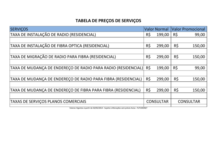TABELA DE PREÇOS DE SERVIÇOS SERVIÇOS TAXA DE INSTALAÇÃO DE RADIO (RESIDENCIAL) Valor Normal Valor Promocional R$ 199,00 R$ 99,00 TAXA DE INSTALAÇÃO DE FIBRA OPTICA (RESIDENCIAL) R$ 299,00 R$ 150,00 TAXA DE MIGRAÇÃO DE RADIO PARA FIBRA (RESIDENCIAL) R$ 299,00 R$ 150,00 TAXA DE MUDANÇA DE ENDEREÇO DE RADIO PARA RADIO (RESIDENCIAL) R$ 199,00 R$ 99,00 TAXA DE MUDANÇA DE ENDEREÇO DE RADIO PARA FIBRA (RESIDENCIAL) R$ 299,00 R$ 150,00 TAXA DE MUDANÇA DE ENDEREÇO DE FIBRA PARA FIBRA (RESIDENCIAL) R$ 299,00 R$ 150,00 TAXAS DE SERVIÇOS PLANOS COMERCIAIS CONSULTAR CONSULTAR Valores Vigentes à partir de 02/05/2014 -­‐ Sujeito à Alterações sem prévio Aviso -­‐ FUTURONET