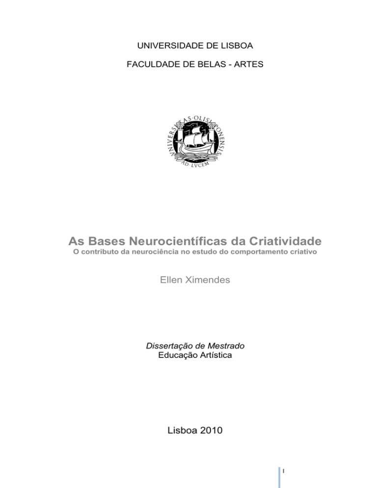 UNIVERSIDADE DE LISBOA FACULDADE DE BELAS - ARTES As Bases Neurocientíficas da Criatividade O contributo da neurociência no estudo do comportamento criativo Ellen Ximendes Dissertação de Mestrado Educação Artística Lisboa 2010 I UNIVERSIDADE DE LISBOA FACULDADE DE BELAS - ARTES As Bases Neurocientíficas da Criatividade O contributo da neurociência no estudo do comportamento criativo Ellen Ximendes Dissertação de Mestrado Educação Artística Dissertação orientada pela Professora Doutora Ana Belas Mendes Lisboa 2010 II Resumo Este trabalho irá discutir e apresentar os possíveis mecanismos cerebrais subjacentes ao comportamento criativo divulgados e mensurados pela neurociência cognitiva. O comportamento humano e a criatividade são interesses recentes da neurociência cognitiva, que toma emprestado termos e conceitos de diversas áreas como a psicologia e a neuropsicologia, pensadas como complementares e não como competitivas. Um dos objectivos da Educação artística é o desenvolvimento da criatividade, porém para que isto ocorra são necessários mais do que aspectos cognoscitivos. Esforços recentes têm-se centrado nos processos cognitivos que poderão ser importantes na manifestação da novidade e da sua adequação dentro de um determinado contexto, sendo a inteligência e o pensamento divergente os que têm merecido maior destaque e até alguma exclusividade por parte dos cientistas. No início do século XIX houve uma grande tendência em relacionar determinados comportamentos com áreas cerebrais específicas, que nos dias de hoje podem ser confirmados através de técnicas avançadíssimas de visualização do cérebro. Esta pesquisa envolve alguns princípios, tais como a plasticidade, o comportamento e a personalidade que se interligam com a manifestação criativa do sujeito e para a qual tentamos evidenciar através da neurociência cognitiva as suas bases científicas. Com esta abordagem pensamos contribuir para o desvanecimento do pré-conceito de que a criatividade não é necessariamente apanágio dos génios, mas que é bem uma actividade comum do nosso equipamento biológico. Palavras-chave: neurociência, educação artística. criatividade, inteligência, percepção, III cognição, Abstract This work will discuss and present the possible mind proceedings underlying the creative behaviour, revealed and measured by cognitive neuroscience. Human behaviour and creativity are cognitive neurosciences’ recent interests, which appropriate terms and concepts belonging to several areas, such as psychology and neuropsychology, thought as complementary instead of competitors. One of the goals of art education is the development of creativity. However, in order this to occur, by far more than cognitive aspects are needed. Recent efforts have been keeping their focus on the cognitive processes that might be important by expressing novelty and for the appropriate use of it in a particular context. Thereby intelligence as well as divergent thinking being those to have been selected an even to have obtained some exclusiveness by scientists. In the beginning of the twentieth century, there was a huge tendency to relate determined behaviours to specific brain areas, which now a days can be confirmed through fostered techniques of brain visualisation. This research implies some principles, such as plasticity, behaviour, personality, which interconnect with the creative manifestation of the subject. We intent to put in evidence its scientific basis through cognitive neuroscience. With this approach, we hope to dissipate the prejudice about creativity being a matter of geniuses, but instead that it belongs to our biological equipment. Keywords: neuroscience, creativity, intelligence, perception, cognition, art education. IV Agradecimentos O meu desejo em realizar o mestrado fora do meu país natal se originou ainda na licenciatura, especificamente na altura da defesa da minha dissertação de término de licenciatura, onde fui incentivada pelos professores a prosseguir com os meus estudos e interesses. É claro que hoje, lembrando desses momentos, percebo que o grau de dificuldade aumenta muito por se tratar de um curso de pós-graduação e pela distância e afastamento que o percurso provoca. Em todo este percurso (desde a admissão ao mestrado até a fase final da tese) encontrei pessoas que me incentivaram e outras que nem tanto, mas que acenderam em mim uma vontade de continuar e seguir a minha “intuição”. O contacto com os meus colegas de curso foi fundamental para a propiciação de uma ambiente descontraído e, especialmente alguns, a troca de informações realizadas até hoje e uma consolidação de amizade. Faço um agradecimento particular para a Professora Ana Bela Mendes, que aceitou orientar este estudo, ainda que a neurociência não fizesse parte de seu repertório académico, soube conduzir e intervir muito bem na orientação deste estudo e sobretudo no seu profundo conhecimento da criatividade. Ao Doutor Luís Gamito pelos préstimos conhecimentos prestados. Directa e indirectamente, foram muitos que contribuíram para a conclusão deste percurso. Em especial à minha família e todos aqueles que asseguraram a minha autoconfiança e exilaram as minhas inseguranças. Dedico este trabalho ao meu querido avô, que partiu antes de entender porque eu precisava viajar para tão longe para realizar um desejo e que por ele pensei em desistir e por ele consegui continuar… V Índice INTRODUÇÃO .................................................................................................................... 9 1. NEUROCIÊNCIA : UMA BREVE DEFINIÇÃO .................................................................. 16 1.1 Estruturação do Sistema Nervoso ........................................................................ 17 1.1.1 Organização anatómica do Sistema Nervoso Central (SNC) ......................... 20 1.1.2 O SNP (Sistema 
