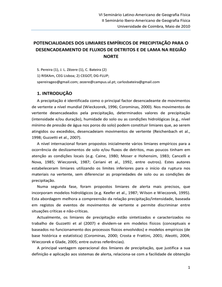VI Seminário Latino-Americano de Geografia Física II Seminário Ibero-Americano de Geografia Física Universidade de Coimbra, Maio de 2010 POTENCIALIDADES DOS LIMIARES EMPÍRICOS DE PRECIPITAÇÃO PARA O DESENCADEAMENTO DE FLUXOS DE DETRITOS E DE LAMA NA REGIÃO NORTE S. Pereira (1), J. L. Zêzere (1), C. Bateira (2) 1) RISKAm, CEG Lisboa; 2) CEGOT, DG-FLUP; [email protected]; [email protected]; [email protected] 1. INTRODUÇÃO A precipitação é identificada como o principal factor desencadeante de movimentos de vertente a nível mundial (Wieckzorek, 1996; Corominas, 2000). Nos movimentos de vertente desencadeados pela precipitação, determinados valores de precipitação (intensidade e/ou duração), humidade do solo ou as condições hidrológicas (e.g., nível mínimo de pressão de água nos poros do solo) podem constituir limiares que, ao serem atingidos ou excedidos, desencadeiam movimentos de vertente (Reichenbach et al., 1998; Guzzetti et al., 2007). A nível internacional foram propostos inicialmente vários limiares empíricos para a ocorrência de deslizamentos de solo e/ou fluxos de detritos, mas poucos tinham em atenção as condições locais (e.g. Caine, 1980; Moser e Hohensim, 1983; Cancelli e Nova, 1985; Wieczorek, 1987; Ceriani et al., 1992, entre outros). Estes autores estabeleceram limiares utilizando os limites inferiores para o início da ruptura nos materiais na vertente, sem diferenciar as propriedades de solo ou as condições de precipitação. Numa segunda fase, foram propostos limiares de alerta mais precisos, que incorporam modelos hidrológicos (e.g. Keefer et al., 1987; Wilson e Wieczorek, 1995). Esta abordagem melhora a compreensão da relação precipitação/intensidade, baseada em registos de eventos de movimentos de vertente e permite discriminar entre situações críticas e não-críticas. Actualmente, os limiares de precipitação estão sintetizados e caracterizados no trabalho de Guzzetti et al (2007) e dividem-se em modelos físicos (conceptuais e baseados no funcionamento dos processos físicos envolvidos) e modelos empíricos (de base histórica e estatística) (Corominas, 2000; Crosta e Frattini, 2001; Aleotti, 2004; Wieczorek e Glade, 2005; entre outras referências). A principal vantagem operacional dos limiares de precipitação, que justifica a sua definição e aplicação aos sistemas de alerta, relaciona-se com a facilidade de obtenção 1 Tema 4 - Riscos naturais e a sustentabilidade dos territórios dos dados de precipitação a baixo custo e para áreas extensas. No entanto, existem algumas limitações na definição de limiares de precipitação empíricos, principalmente a disponibilidade de informação com qualidade adequada, resolução espacial, intervalo dos dados e número de anos de registo. Para cada evento de precipitação é necessária uma rede de estações meteorológicas densa e um inventário detalhado dos movimentos de vertente desencadeados. Os limiares baseados em eventos extremos, com longos períodos de retorno, podem não ser representativos das condições locais de instabilidade, subestimando a probabilidade de rupturas (Reichenbach et al., 1998). Por isso, é conveniente analisar séries longas com registos de precipitação e da actividade dos movimentos de vertente, abarcando diferentes condições meteorológicas de desencadeamento, para a definição de limiares de precipitação mais fiáveis. Na mesma região podem ainda ser desencadeados diferentes tipos de movimentos de vertente, resultantes de distintas condições hidrológicas e, por isso, associados a padrões de precipitação distintos (Zêzere, 2000; Trigo et al., 2005; Zêzere et al., 2008). Neste contexto, qualquer limiar proposto deve ser validado com novos eventos de instabilidade, para minimizar o número de falsos positivos e permitir alertas mais fiáveis (Zêzere et al., 2008). Em Portugal, as condições de precipitação responsáveis pelo desencadeamento de movimentos de vertente já foram caracterizadas para a Região a Norte de Lisboa (Zêzere et al., 1999, 2005; Zêzere, 2000; Zêzere & Rodrigues, 2002) e para a área da Povoação, na Ilha de S. Miguel nos Açores (Marques et al., 2008). Na Região Norte, até ao momento, está publicado um estudo com os resultados preliminares da determinação de limiares empíricos de precipitação responsáveis pelo desencadeamento de fluxos de detritos e de lama (Pereira et al., 2009). Neste artigo, temos como objectivos principais testar diferentes métodos empíricos para estabelecer limiares de precipitação regionais responsáveis pelo desencadeamento de fluxos de detritos e de lama e avaliar o funcionamento dos limiares de intensidade/duração para o evento de instabilidade de vertentes de Janeiro de 2001 na área do Douro. 2. ÁREA DE ESTUDO A área de estudo corresponde à região Norte de Portugal (NUT II Norte), caracterizada por uma paisagem de relevo acidentado com sistemas geomorfológicos diversificados: plataforma litoral, vales amplos do NW, relevo intermédio, montanhas VI Seminário Latino-Americano de Geografia Física II Seminário Ibero-Americano de Geografia Física Universidade de Coimbra, Maio de 2010 do NW, Vale do Douro e Planalto transmontano. As Montanhas do NW e o Vale do Douro são as áreas mais susceptíveis à ocorrência de movimentos de vertente, sobretudo a fluxos de lama e de detritos. A altimetria da Região Norte varia entre os 0 metros na Plataforma Litoral e os 1544 metros na Serra do Gerês. O substrato geológico é constituído, principalmente, por rochas graníticas e metamórficas. Estas rochas encontram-se bastante fracturadas e são abundantes os mantos de alteração graníticos com espessuras variáveis. Como já foi referido, o principal factor desencadeante da instabilidade de vertentes é a precipitação. A distribuição da precipitação média anual (PMA) (Fig. 1) revela um forte contraste entre o litoral e o interior. O rel