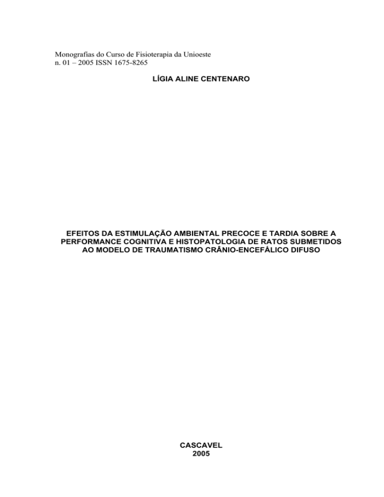 Monografias do Curso de Fisioterapia da Unioeste n. 01 – 2005 ISSN 1675-8265 LÍGIA ALINE CENTENARO EFEITOS DA ESTIMULAÇÃO AMBIENTAL PRECOCE E TARDIA SOBRE A PERFORMANCE COGNITIVA E HISTOPATOLOGIA DE RATOS SUBMETIDOS AO MODELO DE TRAUMATISMO CRÂNIO-ENCEFÁLICO DIFUSO CASCAVEL 2005 Monografias do Curso de Fisioterapia da Unioeste n. 01 – 2005 ISSN 1675-8265 LÍGIA ALINE CENTENARO EFEITOS DA ESTIMULAÇÃO AMBIENTAL PRECOCE E TARDIA SOBRE A PERFORMANCE COGNITIVA E HISTOPATOLOGIA DE RATOS SUBMETIDOS AO MODELO DE TRAUMATISMO CRÂNIO-ENCEFÁLICO DIFUSO Trabalho de Conclusão de Curso Curso de Fisioterapia do Centro Ciências Biológicas e da Saúde Universidade Estadual do Oeste Paraná – Campus Cascavel. Orientador: Prof. Amâncio Aragão CASCAVEL 2005 Ms. do de da do Fernando Monografias do Curso de Fisioterapia da Unioeste n. 01 – 2005 ISSN 1675-8265 TERMO DE APROVAÇÃO LÍGIA ALINE CENTENARO EFEITOS DA ESTIMULAÇÃO AMBIENTAL PRECOCE E TARDIA SOBRE A PERFORMANCE COGNITIVA E HISTOPATOLOGIA DE RATOS SUBMETIDOS AO MODELO DE TRAUMATISMO CRÂNIO ENCEFÁLICO DIFUSO Trabalho de Conclusão de Curso aprovado como requisito parcial para obtenção do título graduado em Fisioterapia, na Universidade Estadual do Oeste do Paraná. ..................................................................................... Orientador: Prof. Ms. Fernando Amâncio Aragão Colegiado de Fisioterapia – UNIOESTE ..................................................................................... Profª. Ms. Fabíola Giordani Cano Colegiado de Fisioterapia – UNIOESTE .................................................................................... Profª. Ms. Sara Sagae Colegiado de Fisioterapia – UNIOESTE Cascavel, 23/11/05. Monografias do Curso de Fisioterapia da Unioeste n. 01 – 2005 ISSN 1675-8265 DEDICATÓRIA Dedico este trabalho a todas as pessoas que possuem algum tipo de deficiência física ou mental, seja ela congênita ou adquirida. Espero que, mesmo indiretamente, este trabalho possa auxiliar de alguma forma na melhora da qualidade de vida dessas pessoas tão especiais, que geralmente são grandes exemplos para nossas vidas. Monografias do Curso de Fisioterapia da Unioeste n. 01 – 2005 ISSN 1675-8265 AGRADECIMENTOS Agradeço em especial à minha família, luz da minha vida, que me guiou desde os primeiros passos até a conclusão de mais essa etapa. Ao meu Pai, sincero e honesto, que me ensinou desde pequena que eu era capaz de realizar todos os meus sonhos, bastava apenas acreditar e lutar. À minha querida Mãe, que sempre esteve ao meu lado, incentivando a minha caminhada e se preocupando com a minha felicidade. Ao Leandro, meu anjo da guarda, que me estendeu a mão em todos os momentos de dificuldades, sempre me acolhendo de braços abertos e com um sorriso nos lábios. Agradeço também ao Prof. Ms. Fernando Amâncio Aragão, por ter me ensinado não somente os passos a seguir na execução desse trabalho, mas também por ter me mostrado que a vida é cheia de escolhas e que não existe apenas uma correta, mas várias. Obrigada pela amizade, pelas críticas e por todo o crescimento que me proporcionou. A todos os professores do curso de Fisioterapia, agradeço os ensinamentos que me foram passados e que vou levar comigo na minha caminhada profissional. De modo especial gostaria de agradecer à Prof. Ms. Sara Sagae pelo auxílio na busca de novos caminhos e também pelo carinho com que sempre me acolheu. Aos meus amigos do coração, Jane, Núbia e Everson, pela paciência e pela amizade em todos os momentos que passamos juntos nesses quatro anos de jornada. Por fim, agradeço em especial a Deus pela minha vida e principalmente por ter me dado forças para alcançar esse objetivo. Monografias do Curso de Fisioterapia da Unioeste n. 01 – 2005 ISSN 1675-8265 “A arte da Ciência consiste em ver o que todos vêem, mas pensar no que ninguém pensou”. (National Institutes of Health) Monografias do Curso de Fisioterapia da Unioeste n. 01 – 2005 ISSN 1675-8265 RESUMO Desde o início de sua aplicação a estimulação ambiental (EA) vem sendo explorada com sucesso como ferramenta para o estudo da plasticidade cerebral e constitui-se na intervenção experimental mais próxima da realidade humana no que diz respeito ao tipo de estimulação proposta em um processo de reabilitação neurológica convencional. Nesse estudo buscou-se verificar a influência da EA sobre a performance cognitiva de ratos submetidos ao modelo de traumatismo crânioencefálico (TCE) e caracterizar a melhor janela terapêutica para sua aplicação. 33 ratos Wistar foram divididos em 4 grupos: (G1) animais submetidos à EA por 31 dias consecutivos no dia seguinte à indução do TCE, com sobrevida de 132 dias; (G2) ratos submetidos a isolamento por 31 dias consecutivos no dia seguinte a indução do TCE, com sobrevida de 132 dias; (G3) ratos submetidos a EA por 31 dias consecutivos, 35 dias após a realização do TCE, com sobrevida de 166 dias; (G4) ratos submetidos ao isolamento por 31 dias consecutivos, 35 dias após a realização do TCE, com sobrevida de 166 dias. A memória operacional dos animais foi avaliada através do Labirinto Aquático de Morris. Os resultados conclusivos indicam que nos grupos de menor sobrevida G1 e G2, a EA não influenciou a performance cognitiva (p>0,05); foi encontrada melhora na performance cognitiva do grupo G3, com intervenção tardia, em relação ao grupo G4 (p<0,05). A EA mostrou-se eficaz em melhorar a performance cognitiva dos animais submetidos ao TCE quando aplicada de forma tardia (35 dias após a lesão). Palavras-chave: Traumatismo crânio-encefálico; Estimulação Ambiental; Cognição. Monografias do Curso de Fisioterapia da Unioeste n. 01 – 2005 ISSN 1675-8265 ABSTRACT Since the beginning of it’s employment the environmental enrichment has been successful explored as a valuable tool for the study of the neural plasticity, it’s reliability has al
