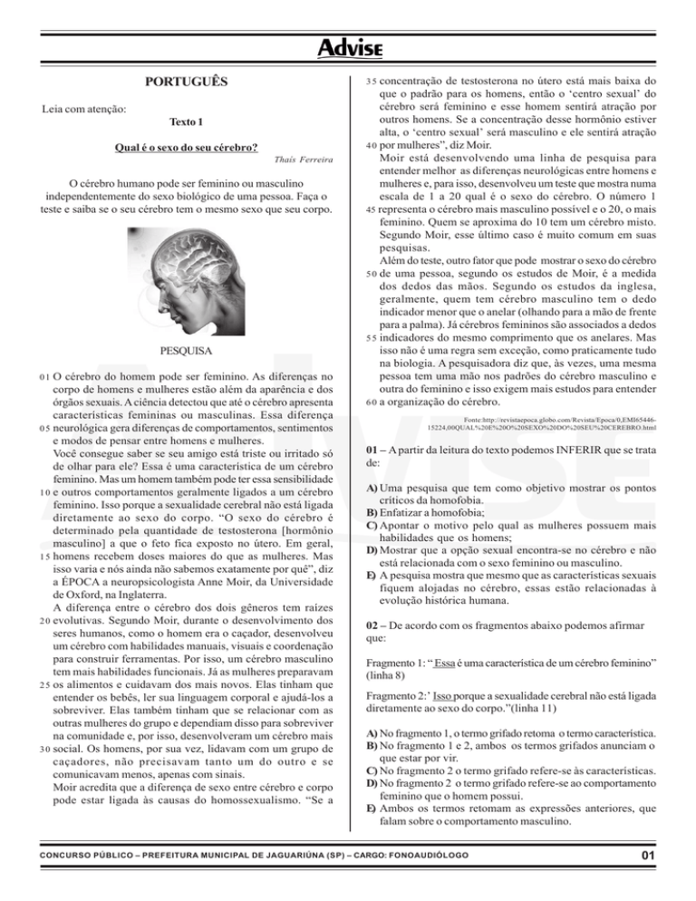 3 5 concentração PORTUGUÊS Leia com atenção: Texto 1 Qual é o sexo do seu cérebro? Thaís Ferreira O cérebro humano pode ser feminino ou masculino independentemente do sexo biológico de uma pessoa. Faça o teste e saiba se o seu cérebro tem o mesmo sexo que seu corpo. PESQUISA 01 O cérebro do homem pode ser feminino. As diferenças no corpo de homens e mulheres estão além da aparência e dos órgãos sexuais. A ciência detectou que até o cérebro apresenta características femininas ou masculinas. Essa diferença 0 5 neurológica gera diferenças de comportamentos, sentimentos e modos de pensar entre homens e mulheres. Você consegue saber se seu amigo está triste ou irritado só de olhar para ele? Essa é uma característica de um cérebro feminino. Mas um homem também pode ter essa sensibilidade 1 0 e outros comportamentos geralmente ligados a um cérebro feminino. Isso porque a sexualidade cerebral não está ligada diretamente ao sexo do corpo. “O sexo do cérebro é determinado pela quantidade de testosterona [hormônio masculino] a que o feto fica exposto no útero. Em geral, 1 5 homens recebem doses maiores do que as mulheres. Mas isso varia e nós ainda não sabemos exatamente por quê”, diz a ÉPOCA a neuropsicologista Anne Moir, da Universidade de Oxford, na Inglaterra. A diferença entre o cérebro dos dois gêneros tem raízes 2 0 evolutivas. Segundo Moir, durante o desenvolvimento dos seres humanos, como o homem era o caçador, desenvolveu um cérebro com habilidades manuais, visuais e coordenação para construir ferramentas. Por isso, um cérebro masculino tem mais habilidades funcionais. Já as mulheres preparavam 2 5 os alimentos e cuidavam dos mais novos. Elas tinham que entender os bebês, ler sua linguagem corporal e ajudá-los a sobreviver. Elas também tinham que se relacionar com as outras mulheres do grupo e dependiam disso para sobreviver na comunidade e, por isso, desenvolveram um cérebro mais 3 0 social. Os homens, por sua vez, lidavam com um grupo de caçadores, não precisavam tanto um do outro e se comunicavam menos, apenas com sinais. Moir acredita que a diferença de sexo entre cérebro e corpo pode estar ligada às causas do homossexualismo. “Se a de testosterona no útero está mais baixa do que o padrão para os homens, então o ‘centro sexual’ do cérebro será feminino e esse homem sentirá atração por outros homens. Se a concentração desse hormônio estiver alta, o ‘centro sexual’ será masculino e ele sentirá atração 4 0 por mulheres”, diz Moir. Moir está desenvolvendo uma linha de pesquisa para entender melhor as diferenças neurológicas entre homens e mulheres e, para isso, desenvolveu um teste que mostra numa escala de 1 a 20 qual é o sexo do cérebro. O número 1 45 representa o cérebro mais masculino possível e o 20, o mais feminino. Quem se aproxima do 10 tem um cérebro misto. Segundo Moir, esse último caso é muito comum em suas pesquisas. Além do teste, outro fator que pode mostrar o sexo do cérebro 5 0 de uma pessoa, segundo os estudos de Moir, é a medida dos dedos das mãos. Segundo os estudos da inglesa, geralmente, quem tem cérebro masculino tem o dedo indicador menor que o anelar (olhando para a mão de frente para a palma). Já cérebros femininos são associados a dedos 5 5 indicadores do mesmo comprimento que os anelares. Mas isso não é uma regra sem exceção, como praticamente tudo na biologia. A pesquisadora diz que, às vezes, uma mesma pessoa tem uma mão nos padrões do cérebro masculino e outra do feminino e isso exigem mais estudos para entender 6 0 a organização do cérebro. Fonte:http://revistaepoca.globo.com/Revista/Epoca/0,EMI6544615224,00QUAL%20E%20O%20SEXO%20DO%20SEU%20CEREBRO.html 01 – A partir da leitura do texto podemos INFERIR que se trata de: A) Uma pesquisa que tem como objetivo mostrar os pontos críticos da homofobia. B) Enfatizar a homofobia; C) Apontar o motivo pelo qual as mulheres possuem mais habilidades que os homens; D) Mostrar que a opção sexual encontra-se no cérebro e não está relacionada com o sexo feminino ou masculino. E) A pesquisa mostra que mesmo que as características sexuais fiquem alojadas no cérebro, essas estão relacionadas à evolução histórica humana. 02 – De acordo com os fragmentos abaixo podemos afirmar que: Fragmento 1: “ Essa é uma característica de um cérebro feminino” (linha 8) Fragmento 2:’ Isso porque a sexualidade cerebral não está ligada diretamente ao sexo do corpo.”(linha 11) A) No fragmento 1, o termo grifado retoma o termo característica. B) No fragmento 1 e 2, ambos os termos grifados anunciam o que estar por vir. C) No fragmento 2 o termo grifado refere-se às características. D) No fragmento 2 o termo grifado refere-se ao comportamento feminino que o homem possui. E) Ambos os termos retomam as expressões anteriores, que falam sobre o comportamento masculino. CONCURSO PÚBLICO – PREFEITURA MUNICIPAL DE JAGUARIÚNA (SP) – CARGO: FONOAUDIÓLOGO 01 03 – Analise atentamente o uso do POR QUÊ na frase abaixo e, marque a alternativa correta. Fragmento: “Mas isso varia e nós ainda não sabemos exatamente por quê...” D) Em ambos os casos ele é índice de indeterminação do sujeito. E) No primeiro caso é índice de indeterminação do sujeito, e, no segundo indica condição. Leia atentamente o texto abaixo para responder as questões que seguem: A) O termo em destaque está correto devido ao acento. B) O Por quê deveria está junto e sem acento, já que é uma conjunção explicativa. C) O termo deveria está antecedido por um artigo definido masculino, substantivando-o já que possui o valor semântico de motivo, causa. D) O termo está grafado corretamente, já que está referindo-se a pergunta. E) O termo está grafado corretamente, já que “a preposição por + pronome relativo que, possuirá o significado de “pelo qual”. Texto 2 Linda Rosa (Maria Gadú) Composição: 