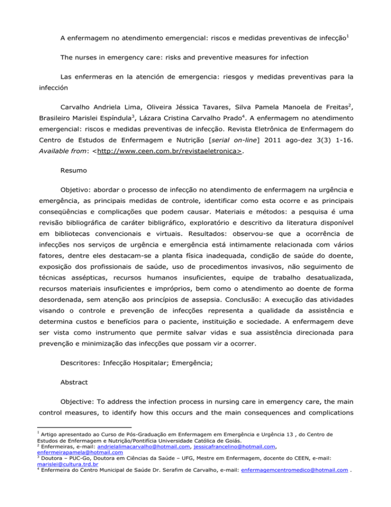 A enfermagem no atendimento emergencial: riscos e medidas preventivas de infecção1 The nurses in emergency care: risks and preventive measures for infection Las enfermeras en la atención de emergencia: riesgos y medidas preventivas para la infección Carvalho Andriela Lima, Oliveira Jéssica Tavares, Silva Pamela Manoela de Freitas2, Brasileiro Marislei Espíndula3, Lázara Cristina Carvalho Prado4. A enfermagem no atendimento emergencial: riscos e medidas preventivas de infecção. Revista Eletrônica de Enfermagem do Centro de Estudos de Enfermagem e Nutrição [serial on-line] 2011 ago-dez 3(3) 1-16. Available from: <http://www.ceen.com.br/revistaeletronica>. Resumo Objetivo: abordar o processo de infecção no atendimento de enfermagem na urgência e emergência, as principais medidas de controle, identificar como esta ocorre e as principais conseqüências e complicações que podem causar. Materiais e métodos: a pesquisa é uma revisão bibliográfica de caráter bibligráfico, exploratório e descritivo da literatura disponível em bibliotecas convencionais e virtuais. Resultados: observou-se que a ocorrência de infecções nos serviços de urgência e emergência está intimamente relacionada com vários fatores, dentre eles destacam-se a planta física inadequada, condição de saúde do doente, exposição dos profissionais de saúde, uso de procedimentos invasivos, não seguimento de técnicas assépticas, recursos humanos insuficientes, equipe de trabalho desatualizada, recursos materiais insuficientes e impróprios, bem como o atendimento ao doente de forma desordenada, sem atenção aos princípios de assepsia. Conclusão: A execução das atividades visando o controle e prevenção de infecções representa a qualidade da assistência e determina custos e benefícios para o paciente, instituição e sociedade. A enfermagem deve ser vista como instrumento que permite salvar vidas e sua assistência direcionada para prevenção e minimização das infecções que possam vir a ocorrer. Descritores: Infecção Hospitalar; Emergência; Abstract Objective: To address the infection process in nursing care in emergency care, the main control measures, to identify how this occurs and the main consequences and complications 1 Artigo apresentado ao Curso de Pós-Graduação em Enfermagem em Emergência e Urgência 13 , do Centro de Estudos de Enfermagem e Nutrição/Pontifícia Universidade Católica de Goiás. 2 Enfermeiras, e-mail: [email protected], [email protected], [email protected] 3 Doutora – PUC-Go, Doutora em Ciências da Saúde – UFG, Mestre em Enfermagem, docente do CEEN, e-mail: [email protected] 4 Enfermeira do Centro Municipal de Saúde Dr. Serafim de Carvalho, e-mail: [email protected] . 2 that can cause. Materials and methods: The research is a literature review bibligráfico character, exploratory and descriptive literature available in conventional and virtual libraries. Results: we observed that the occurrence of infections in emergency rooms and emergency is closely related to several factors, among which we highlight the inadequate physical plant, health condition of the patient, exposure of health professionals, use of invasive procedures, Failure to follow aseptic techniques, insufficient human resources, teamwork outdated, inadequate and unsuitable material resources, as well as the treatment of patients in a disorderly way, without regard to principles of asepsis. Conclusion: The activities for the control and prevention of infections is the quality of care and determine costs and benefits to the patient, institution and society. Nursing must be seen as an enabling tool to save lives and targeted assistance for prevention and minimization of infections that may occur. Keywords: Infection; Emergency; Resumen Objetivo: Conocer el proceso de infección en la atención de enfermería en la atención de emergencia, las principales medidas de control, para identificar cómo se produce y las principales consecuencias y complicaciones que pueden causar. Materiales y métodos: La investigación es una revisión de la literatura bibligráfico carácter exploratorio y descriptivo, la literatura disponible en las bibliotecas convencionales y virtuales. Resultados: Se observó que la ocurrencia de infecciones en las salas de emergencia y de emergencia está estrechamente relacionado con varios factores, entre los que destacan la inadecuada condición de la planta física, la salud del paciente, la exposición de los profesionales de la salud, el uso de procedimientos invasivos, Si no se siguen las técnicas de asepsia, la insuficiencia de recursos humanos, trabajo en equipo de recursos materiales obsoletos, inadecuados e inapropiados, así como el tratamiento de los pacientes de una manera desordenada, sin tener en cuenta los principios de la asepsia. Conclusión: Las actividades para el control y la prevención de las infecciones es la calidad de la atención y determinar los costos y beneficios para el paciente, la institución y la sociedad. Enfermería debe ser visto como una herramienta que permite salvar vidas y asistencia específica para la prevención y minimización de infecciones que pueden ocurrir. Palabras clave: Infección; de emergencia; 1 Introdução O interesse da pesquisa é demonstrar que é possível realizar a assistência de enfermagem no atendimento de urgência e emergência baseada no controle de infecção e que isto pode influenciar positivamente na qualidade da assistência e refletir em benefícios para a equipe, pacientes e instituição. 3 No Brasil as Unidades de Urgência e Emergência, contrariando o que para elas havia sido planejado tornaram-se, principalmente a partir da última década do século passado, as principais portas de entrada no sistema de atenção à saúde, eleitas pela população como o melhor local para a obtenção de diagnóstico e tratamento dos problemas de saúde, independentemente do nível de urgênc