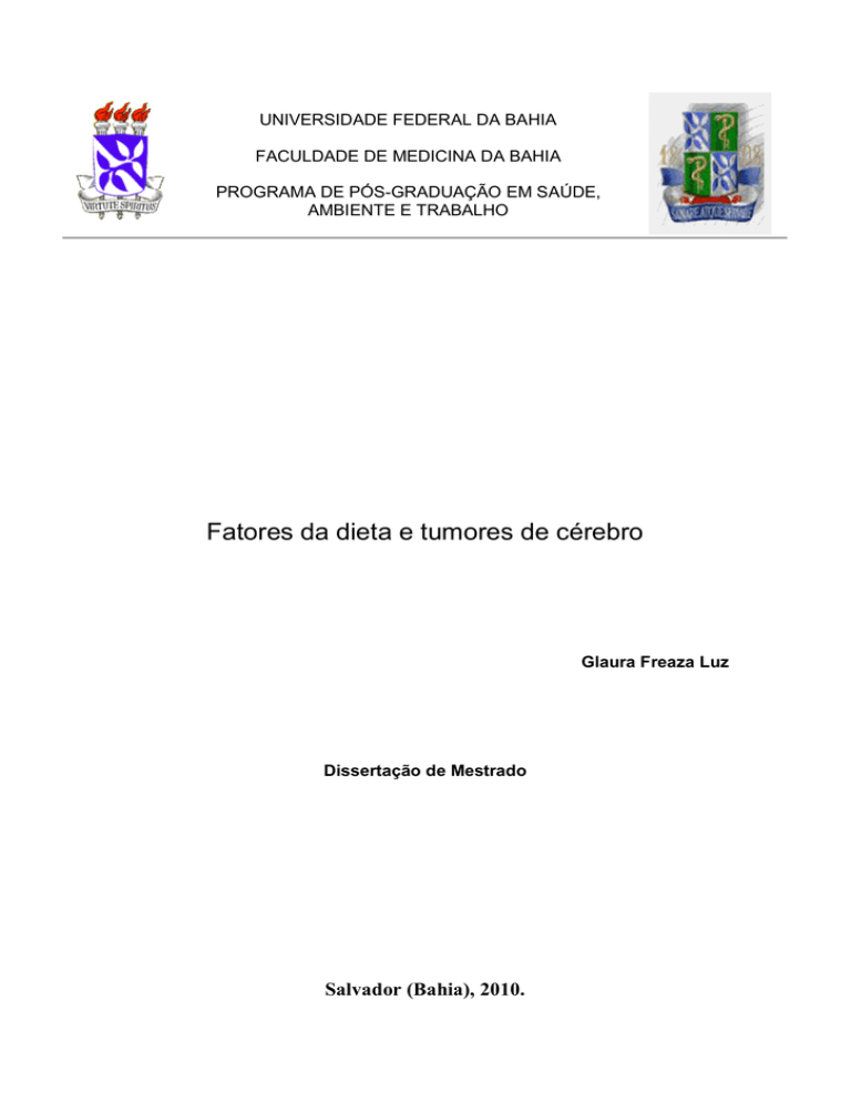 UNIVERSIDADE FEDERAL DA BAHIA FACULDADE DE MEDICINA DA BAHIA PROGRAMA DE PÓS-GRADUAÇÃO EM SAÚDE, AMBIENTE E TRABALHO Fatores da dieta e tumores de cérebro Glaura Freaza Luz Dissertação de Mestrado Salvador (Bahia), 2010. ii Ficha catalográfica. Universidade Federal da Bahia - Faculdade de Medicina – Biblioteca Luz, Glaura Freaza. L979f Fatores da dieta e tumores de cérebro. / Glaura Freaza Luz. Salvador, 2010. iv, 69f. Orientador: Prof. Marco Antônio Vasconcelos Rego. Dissertação (Mestre) Universidade Federal da Bahia. Faculdade de Medicina. Curso de Pós-Graduação em Saúde, Ambiente e Trabalho 1. Neoplasias Encefálicas 2. dieta. 3. Compostos Nitrosos. 4. Antioxidantes I. Universidade Federal da Bahia II. Título. CDU: 613.24:616.831(043.3) iii UNIVERSIDADE FEDERAL DA BAHIA FACULDADE DE MEDICINA DA BAHIA PROGRAMA DE PÓS-GRADUAÇÃO EM SAÚDE, AMBIENTE E TRABALHO Fatores da dieta e tumores de cérebro Glaura Freaza Luz Professor-orientador: Marco Antônio Vasconcelos Rêgo Dissertação apresentada ao Colegiado do Curso de Pós-graduação em Saúde, Ambiente e Trabalho da Faculdade de Medicina da Bahia da Universidade Federal da Bahia, como pré-requisito obrigatório para a obtenção do grau de Mestre em Saúde, Ambiente e Trabalho. Salvador (Bahia), 2010. iv COMISSÃO EXAMINADORA Membros Titulares: Iracema Santos Veloso, professora titular do Departamento da Ciência dos Alimentos; Doutora em Saúde Pública. Fernando Martins Carvalho, professor titular do Departamento de Medicina Preventiva e Social da Universidade Federal da Bahia; Doutor em Occupational Health -University of London e Pós-doutorado - Universidade de Massachusetts em Lowell. Marco Antônio Vasconcelos Rêgo (professor-orientador), professor adjunto do Departamento de Medicina Preventiva e Social da Universidade Federal da Bahia, Doutor em Saúde Pública - Universidade Federal da Bahia. v EQUIPE Marco Antônio Vasconcelos Rêgo – DMPS/UFBA (Médico, Especialista em Saúde Ocupacional, Doutor em Saúde Pública, ISC/UFBA, Professor Adjunto de Epidemiologia) Fernando Martins Carvalho – Professor Titular do DMPS/UFBA (Médico, Doutor em Saúde Ocupacional UL/Inglaterra) Paulo Sérgio de Andrade Conceição – (Médico Sanitarista e do Trabalho, Doutorando em Saúde Pública ISC-UFBA) Jussara Cristina Vasconcelos Rêgo - (Bióloga, Mestra em Geografia, UFBA) Glaura Freaza Luz - (Nutricionista, Mestranda em Saúde, Ambiente e Trabalho FMB-UFBA). COLABORADORES Carolina Espírito Santo Matos, estudante de nutrição da UFBA Fernanda F. Sampaio, estudante de nutrição da UFBA Alline Gabrielle Flores Lima, estudante de nutrição da UFBA Luce Alves da Silva, estudante de nutrição da UFBA Marise Maia Xavier, estudante de nutrição da UFBA Laís Selma Lima Mendonça, estudante de nutrição da UFBA vi INSTITUIÇÃO PARTICIPANTE Universidade Federal da Bahia/Faculdade de Medicina da Departamento de Medicina Preventiva e Social - instituição executora Bahia/ FONTES DE FINANCIAMENTO Bolsa de Estudos da Fundação de Amparo à Pesquisa do Estado da Bahia (FAPESB). Bolsa de Iniciação Científica do Programa Institucional de Bolsas de Iniciação Científica (PIBIC). CNPQ Edital 02/2006. vii AGRADECIMENTOS A minha família que sempre está presente e unida. Meus pais, Jairo e Dolores, meus incentivadores e parceiros. A minha mãe pelos conselhos, preocupações e paciência, sempre dedicada e atenciosa comigo e meus irmãos. Ao meu pai que sempre acreditou e incentivou os filhos para o estudo, estando presente nos momentos difíceis. A minha irmã Emiliana e Marcelo pelo apoio e por nos presentearmos, em 2009, com Ana Sophia, que tem o sorriso mais bonito e animador. O melhor presente que nossa família recebeu! Meus irmãos, Ivaldo e Jairo, pela união e apoio. Agradeço a meu orientador, professor Marco Antônio V. Rêgo, por sempre demonstrar confiança, por estar acessível e pelo empenho para o desenvolvimento deste trabalho, inclusive por conseguir uma bolsista PIBIC o que me tranqüilizou e ajudou especialmente na formação do banco de dados. Ao professor Fernando Carvalho pela dedicação, preocupação e orientação aos mestrandos e pela grande pessoa que é. A querida Solange Xavier, secretária do Mestrado em Saúde, Ambiente e Trabalho (SAT), pela dedicação e competência. Grande companheira, sempre disposta a colaborar para o bom andamento das atividades administrativas. Agradeço a Paulo Conceição e a Jussara Rêgo, pela grande colaboração e assistência no acesso aos dados dos indivíduos estudados. Aos colegas do mestrado, especialmente à turma 2008, caracterizada pela diversidade de profissionais e personalidades que se complementam e com os quais muito aprendi. Meus grandes companheiros, unidos nos estudos, principalmente em bioestatística. Um agradecimento especial ao colega Adauto Mascarenhas, com quem realizei boa parte dos trabalhos desenvolvidos no mestrado, que sempre disponibilizava materiais para estudo e que muito me ajudou com seus conselhos, inclusive quando exerci a representação estudantil. viii Aos professores, grandes pesquisadores sempre prontos e dispostos a colaborar com os discentes, especialmente Lauro Porto que colaborou com as análises estatísticas, e Verônica Lima. À professora Maria do Carmo Freitas que me orientou a fazer a seleção do mestrado no SAT. Aos colegas das turmas 2007 e 2009, especialmente Paula Amaral, Ana Lima, Suerda Souza e Natália Fonseca, pela troca de experiências. A Marivalda, “Inha”, colaboradora do SAT, sempre sorridente e bem disposta, mesmo nos momentos difíceis. Às estudantes da graduação em Nutrição da UFBA - Alline Gabrielle Flores Lima, Carolina Espírito Santo Matos, Fernanda F. Sampaio, Laís Selma Lima Mendonça, Luce Alves da Silva e Marise Maia Xavier -, sem as quais não teria conseguido, em tão pouco tempo, realizar as entrevistas. Especialmente a Carolina por trabalhar comigo há 03 anos e a Al
