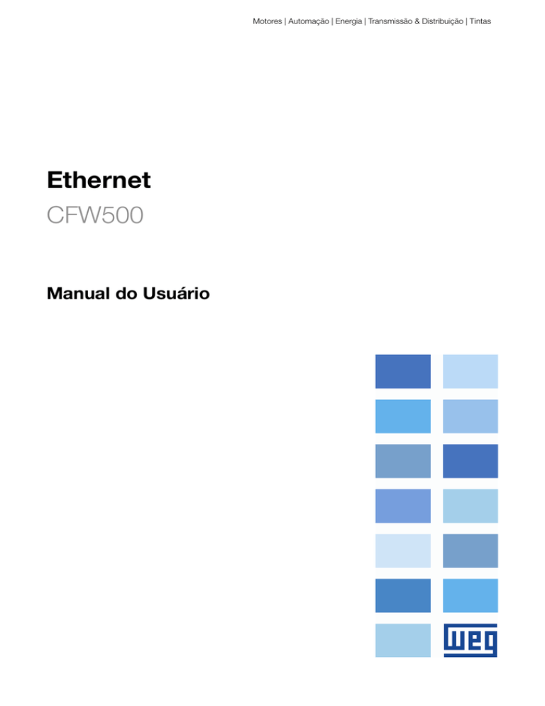 Motores | Automação | Energia | Transmissão & Distribuição | Tintas Ethernet CFW500 Manual do Usuário Manual do Usuário - Ethernet Série: CFW500 Idioma: Português Nº do Documento: 10003256298 / 00 Build 323 Data de publicação: 12/2014 Sumário Sumário Sobre o Manual . . . . . . . . . . . . . . . . . . . . . . . . . . . . . . . . . . . . . . . . . . . . . . . . . . . . . . . . . . . . . . . . . . . . . . . . . . . . . . . . . . . . . . . . . . . . . . . . . . . . . . . . 5 1 Características do Equipamento em Rede Ethernet . . . . . . . . . . . . . . . . . . . . . . . . . . . . . . . . . . . . . . . . . . . . . . . . . . . . . . . . . 7 1.1 Características específicas para Modbus TCP . . . . . . . . . . . . . . . . . . . . . . . . . . . . . . . . . . . . . . . . . . . . . . . . . . . . . . . . . . . . . 7 1.2 Características específicas para EtherNet/IP . . . . . . . . . . . . . . . . . . . . . . . . . . . . . . . . . . . . . . . . . . . . . . . . . . . . . . . . . . . . . . . 7 1.3 Características específicas para PROFINET . . . . . . . . . . . . . . . . . . . . . . . . . . . . . . . . . . . . . . . . . . . . . . . . . . . . . . . . . . . . . . . . 7 Visão Geral sobre Ethernet . . . . . . . . . . . . . . . . . . . . . . . . . . . . . . . . . . . . . . . . . . . . . . . . . . . . . . . . . . . . . . . . . . . . . . . . . . . . . . . . . . . . . 8 2.1 Tecnologia Ethernet . . . . . . . . . . . . . . . . . . . . . . . . . . . . . . . . . . . . . . . . . . . . . . . . . . . . . . . . . . . . . . . . . . . . . . . . . . . . . . . . . . . . . . . . . 8 Descrição da Interface . . . . . . . . . . . . . . . . . . . . . . . . . . . . . . . . . . . . . . . . . . . . . . . . . . . . . . . . . . . . . . . . . . . . . . . . . . . . . . . . . . . . . . . . . . 9 3.1 Módulo Plug-in para Interface Ethernet . . . . . . . . . . . . . . . . . . . . . . . . . . . . . . . . . . . . . . . . . . . . . . . . . . . . . . . . . . . . . . . . . . . . . 9 3.2 Conectores . . . . . . . . . . . . . . . . . . . . . . . . . . . . . . . . . . . . . . . . . . . . . . . . . . . . . . . . . . . . . . . . . . . . . . . . . . . . . . . . . . . . . . . . . . . . . . . . . . 9 3.3 LEDs de Indicação . . . . . . . . . . . . . . . . . . . . . . . . . . . . . . . . . . . . . . . . . . . . . . . . . . . . . . . . . . . . . . . . . . . . . . . . . . . . . . . . . . . . . . . . . . 9 2 3 4 5 Instalação em Rede . . . . . . . . . . . . . . . . . . . . . . . . . . . . . . . . . . . . . . . . . . . . . . . . . . . . . . . . . . . . . . . . . . . . . . . . . . . . . . . . . . . . . . . . . . . . . . 11 4.1 Endereço IP . . . . . . . . . . . . . . . . . . . . . . . . . . . . . . . . . . . . . . . . . . . . . . . . . . . . . . . . . . . . . . . . . . . . . . . . . . . . . . . . . . . . . . . . . . . . . . . . . . 11 4.2 Taxa de Comunicação . . . . . . . . . . . . . . . . . . . . . . . . . . . . . . . . . . . . . . . . . . . . . . . . . . . . . . . . . . . . . . . . . . . . . . . . . . . . . . . . . . . . . . . 11 4.3 Cabo . . . . . . . . . . . . . . . . . . . . . . . . . . . . . . . . . . . . . . . . . . . . . . . . . . . . . . . . . . . . . . . . . . . . . . . . . . . . . . . . . . . . . . . . . . . . . . . . . . . . . . . . . 11 4.4 Topologia da Rede . . . . . . . . . . . . . . . . . . . . . . . . . . . . . . . . . . . . . . . . . . . . . . . . . . . . . . . . . . . . . . . . . . . . . . . . . . . . . . . . . . . . . . . . . . . 12 4.5 Recomendações para Aterramento e Passagem dos Cabos . . . . . . . . . . . . . . . . . . . . . . . . . . . . . . . . . . . . . . . . . . . . . 12 Parametrização . . . . . . . . . . . . . . . . . . . . . . . . . . . . . . . . . . . . . . . . . . . . . . . . . . . . . . . . . . . . . . . . . . . . . . . . . . . . . . . . . . . . . . . . . . . . . . . . . . . 13 5.1 Símbolos para Descrição das Propriedades . . . . . . . . . . . . . . . . . . . . . . . . . . . . . . . . . . . . . . . . . . . . . . . . . . . . . . . . . . . . . . . 13 P0105 – Seleção 1ª/2ª Rampa . . . . . . . . . . . . . . . . . . . . . . . . . . . . . . . . . . . . . . . . . . . . . . . . . . . . . . . . . . . . . . . . . . . . . . . . . . . . . . . . . . . . . 13 P0220 – Seleção Fonte Local/Remoto . . . . . . . . . . . . . . . . . . . . . . . . . . . . . . . . . . . . . . . . . . . . . . . . . . . . . . . . . . . . . . . . . . . . . . . . . . . . 13 P0221 – Seleção Referência Local . . . . . . . . . . . . . . . . . . . . . . . . . . . . . . . . . . . . . . . . . . . . . . . . . . . . . . . . . . . . . . . . . . . . . . . . . . . . . . . . . 13 P0222 – Seleção Referência Remota . . . . . . . . . . . . . . . . . . . . . . . . . . . . . . . . . . . . . . . . . . . . . . . . . . . . . . . . . . . . . . . . . . . . . . . . . . . . . . 13 P0223 – Seleção Giro Local . . . . . . . . . . . . . . . . . . . . . . . . . . . . . . . . . . . . . . . . . . . . . . . . . . . . . . . . . . . . . . . . . . . . . . . . . . . . . . . . . . . . . . . . 13 P0224 – Seleção Gira/Para Local . . . . . . . . . . . . . . . . . . . . . . . . . . . . . . . . . . . . . . . . . . . . . . . . . . . . . . . . . . . . . . . . . . . . . . . . . . . . . . . . . . 13 P0225 – Seleção Jog Local . . . . . . . . . . . . . . . . . . . . . . . . . . . . . . . . . . . . . . . . . . . . . . . . . . . . . . . . . . . . . . . . . . . . . . . . . . . . . . . . . . . . . . . . 13 P0226 – Seleção Giro Remoto . . . . . . . . . . . . . . . . . . . . . . . . . . . . . . . . . . . . . . . . . . . . . . . . . . . . . . . . . . . . . . . . . . . . . . . . . . . . . . . . . . . . . 13 P0227 – Seleção Gira/Para Remoto . . . . . . . . . . . . . . . . . . . . . . . . . . . . . . . . . . . . . . . . . . . . . . . . . . . . . . . . . . . . . . . . . . . . . . . . . . . . . . . 13 P0228 – Seleção Jog Remoto . . . . . . . . . . . . . . . . . . . . . . . . . . . . . . . . . . . . . . . . . . . . . . . . . . . . . . . . . . . . . . . 