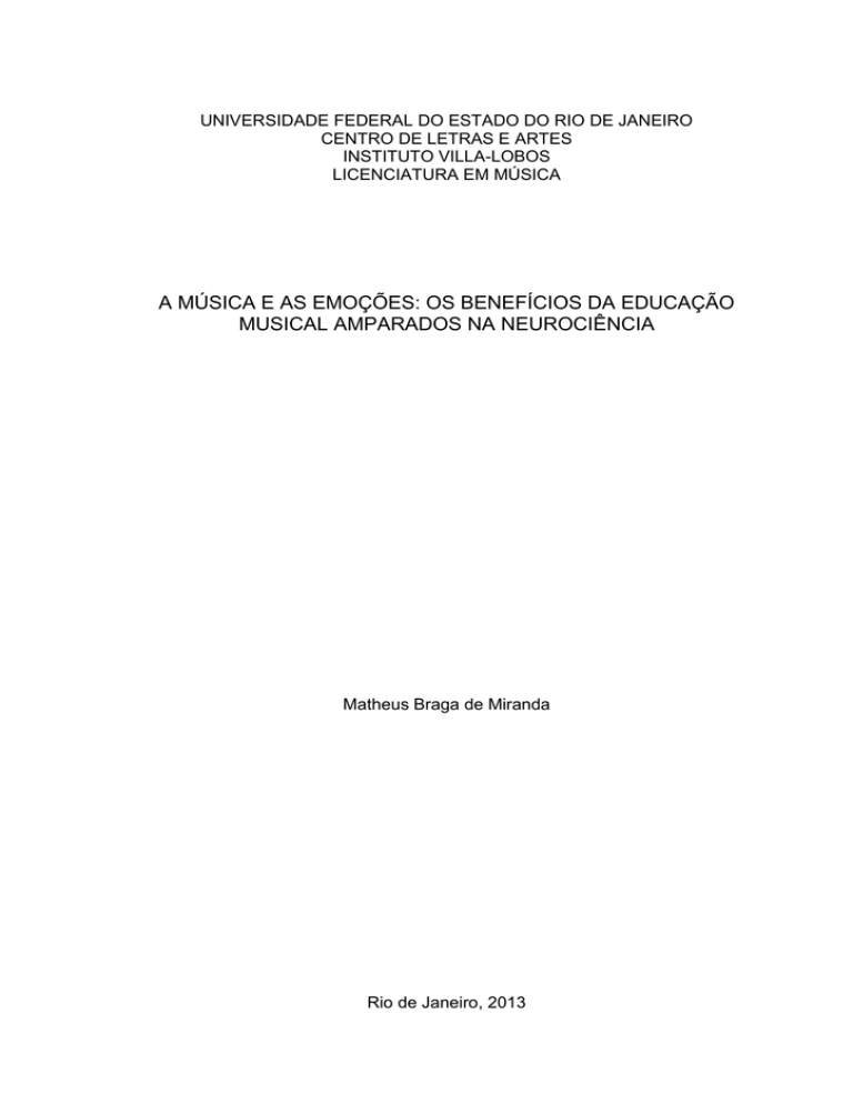 UNIVERSIDADE FEDERAL DO ESTADO DO RIO DE JANEIRO CENTRO DE LETRAS E ARTES INSTITUTO VILLA-LOBOS LICENCIATURA EM MÚSICA A MÚSICA E AS EMOÇÕES: OS BENEFÍCIOS DA EDUCAÇÃO MUSICAL AMPARADOS NA NEUROCIÊNCIA Matheus Braga de Miranda Rio de Janeiro, 2013 Matheus Braga de Miranda A MÚSICA E AS EMOÇÕES: OS BENEFÍCIOS DA EDUCAÇÃO MUSICAL AMPARADOS NA NEUROCIÊNCIA Monografia apresentada como exigência para obtenção do grau de Licenciatura Plena em Educação Artística– Habilitação em Música – Instituto VillaLobos, Centro de Letras e Artes da Universidade Federal do Estado do Rio de Janeiro—UNIRIO Orientadora: Ana Sheila Tangarife Rio de Janeiro 2013 AGRADECIMENTOS Primeiramente, gostaria de agradecer à todo corpo docente do IVL. Cada professor com sua metodologia, sua forma pessoal de expor seus conhecimentos, suas virtudes e defeitos, colaborou para a minha formação. Não apenas no âmbito acadêmico, mas também na minha formação pessoal, como ser humano, cidadão e educador musical. Em especial, gostaria de agradecer à Professora Mônica Duarte, que esclareceu minhas dúvidas, sempre de forma solícita e com sugestões de grande valia. Ao professor José Nunes, que foi uma pessoa fundamental na escolha do tema, na sugestão de biografias, na condução do TCC e nas eventuais dúvidas que tive pelo caminho. Agradeço também, minha orientadora, Ana Sheila Tangarife Sempre com observações claras e objetivas, fez com que o caminho se tornasse menos tortuoso, indicando material teórico que será de extrema importância para o resto de minha carreira. Para finalizar, um agradecimento especial à minha família, pois sempre obtive um respaldo moral e afetivo, um apoio que todo estudante de música deseja. A união, os valores e princípios que neles prevalecem, me tornaram uma pessoa melhor, mais humana e segura em relação às escolhas e metas. MIRANDA, Matheus Braga. A Música e as Emoções: Os benefícios da educação musical amparados na neurociência, 2013. Monografia (Licenciatura Plena em Educação Artística – Habilitação em Música) – Instituto Villa-Lobos, Centro de Letras e Artes da Universidade Federal do Estado do Rio de Janeiro—UNIRIO RESUMO O presente trabalho tem como objetivo elucidar alguns aspectos que tangem a educação musical, respaldados em diversos artigos científicos e livros de cunho filosófico, estético, neurológico e psicológico relacionados à música, e amparadas na própria literatura, clássica e atual acerca do ensino musical. Esse estudo monográfico aborda os conceitos das emoções musicais, o significado da música e suas vertentes filosóficas e estéticas, assim como suas possibilidades como uso terapêutico, além de ilustrar impactos positivos, tanto de natureza emocional, quanto de natureza sociocomportamental, causados em pessoas expostas à educação musical, analisando os efeitos benéficos que a música causa ao cérebro sob o respaldo da Neurociência. Palavras-chave: cérebro dos músicos -- emoção musical – música no cérebro SUMÁRIO INTRODUÇÃO..................................................................................................................5 CAPÍTULO 1- A BUSCA POR UM SIGNIFICADO NA MÚSICA...........................7 1.1 Diferentes opiniões entre Absolutistas e Referencialistas.......................7 1.2 As visões de Formalistas e Expressionistas............................................10 1.2.1 Expressionistas absolutos e referenciais...............................11 CAPÍTULO 2 – A MÚSICA E AS EMOÇÕES.............................................................12 2.1 Emoção musical........................................................................................15 2.2 Emoção musical, os movimentos e o cerebelo... ....................................18 2.3 Emoção estética na educação musical..................................................... 20 CAPÍTULO 3- O QUE DIZ A NEUROCIÊNCIA......................................................23 3.1 A música no cérebro.................................................................................... 23 3.2 O cérebro dos músicos.................................................................................26 3.3 A música como elemento terapêutico: Musicoterapia..........................28 3.3.1 Música e Alzheimer.................................................................30 CONSIDERAÇÕES FINAIS...........................................................................................32 REFERÊNCIAS BIBLIOGRÁFICAS.............................................................................34 5 INTRODUÇÃO Esse trabalho monográfico tem como objetivo investigar os benefícios que o uso da música pode propiciar em vários campos e circunstâncias, desde o seu uso como elemento terapêutico, seus benefícios sociais e comportamentais, às respostas do cérebro aos estímulos musicais e à questões de natureza psicológica, fisiológica relacionadas à emoção musical. Um dos pontos centrais da pesquisa, é a tentativa de elucidar os motivos pelo qual a música exerce um grande impacto nas emoções humanas, e assim, poder usá-las como aliadas à educação musical. Diversas pessoas já vivenciaram alguma situação onde a música teve um papel crucial de desencadear estados emotivos, conscientes ou inconscientes, controláveis ou totalmente fora de controle. A emoção musical é um tema que abrange uma ampla discussão nos mais variados campos de pesquisa, sendo assim, o presente trabalho se aprofundou em questões de natureza filosófica, psicológica, neurológica e fisiológica. Ao tratar de um assunto tão profundo, foi necessário que se buscasse um referencial teórico acerca do significado musical. O que as principais vertentes defendem à respeito de seu significado e suas consequências. Veremos a divergência de opinião filosófica de Absolutistas e Referencialistas, assim