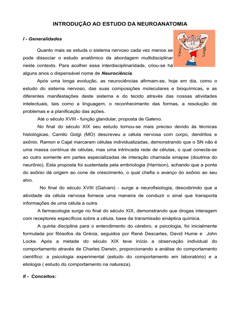 INTRODUÇÃO AO ESTUDO DA NEUROANATOMIA I - Generalidades Quanto mais se estuda o sistema nervoso cada vez menos se pode dissociar o estudo anatômico da abordagem multidisciplinar neste contexto. Para acolher essa interdisciplinaridade, criou-se há alguns anos o dispensável nome de Neurociência. Após uma longa evolução, as neurociências afirmam-se, hoje em dia, como o estudo do sistema nervoso, das suas composições moleculares e bioquímicas, e as diferentes manifestações deste sistema e do tecido através das nossas atividades intelectuais, tais como a linguagem, o reconhecimento das formas, a resolução de problemas e a planificação das ações. Até o século XVIII - função glandular, proposta de Galeno. No final do século XIX seu estudo tornou-se mais preciso devido às técnicas histológicas, Camilo Golgi (MO) descreveu a célula nervosa com corpo, dendritos e axônio. Ramon e Cajal marcaram células individualizadas, demonstrando que o SN não é uma massa contínua de células, mas uma intrincada rede de células, o qual conecta-se ao outro somente em partes especializadas de interação chamada sinapse (doutrina do neurônio). Esta proposta foi sustentada pela embriologia (Harrison), achando que a ponta do axônio dá origem ao cone de crescimento, o qual chefia o avanço do axônio ao seu alvo. No final do século XVIII (Galvani) - surge a neurofisiologia, descobrindo que a atividade da célula nervosa fornece uma maneira de conduzir o sinal que transporta informações de uma célula a outra. A farmacologia surge no final do século XIX, demonstrando que drogas interagem com receptores específicos sobre a célula, base da transmissão sináptica química. A quinta disciplina para o entendimento do cérebro, a psicologia, foi inicialmente formulada por filósofos da Grécia, seguidos por René Descartes, David Hume e John Locke. Após a metade do século XIX teve início a observação individual do comportamento através de Charles Darwin, proporcionando a análise do comportamento científico: a psicologia experimental (estudo do comportamento em laboratório) e a etiologia ( estudo do comportamento na natureza). II - Conceitos: 2.1 - Sistema Nervoso: É um conjunto de órgãos responsáveis pela coordenação e integração dos demais sistemas orgânicos, relacionando o organismo com as variações do meio externo e controlando o funcionamento visceral. 2.2 - Neuroanatomia: É à parte da Anatomia que estuda o sistema nervoso. VIII Alguns conceitos importantes em neuroanatomia: III - Alguns conceitos importantes em neuroanatomia: 1. Célula Nervosa (neurônio): são células altamente excitáveis, comunicam-se entre si ou com células efetuadoras usando basicamente uma linguagem elétrica. Nos vertebrados após a diferenciação os neurônios não se dividem, ou seja, após o nascimento não são mais produzidos novos neurônios. 1.1 - Constituição: 1.1.1 - Corpo celular ou soma - tem tamanho muito variado, geralmente triangular ou piramidal; parte da célula que contém o núcleo-centro metabólico do neurônio. É rico em organelas citoplasmáticas. 1.1.2 - Prolongamentos: a) Dendritos - geralmente são curtos e ramificamse em prolongamentos cada vez mais fino. São especializados em receber o estímulo. b) Axônio (fibra nervosa) - tem diâmetro de 0,2 a 20 µm e estende-se até 1 metro; é especializado em gerar e conduzir o estímulo, é a unidade condutora, mantém a capacidade de um transiente elétrico que quando modificado determina o potencial de ação. c) Bainha de mielina: é uma bainha de tecido gorduroso que envolve as fibras nervosas agindo como meio isolante 2 - Tipos de células: 2.1 - Quanto à função: 2.1.1 - Neurônio sensitivo: levam informações ao sistema nervoso central. 2.1.2 - Neurônio motor: levam a resposta elaborada ao orgão efetuador da resposta. 2.1.3 - Neurônio de associação: analisa as informações, armazena sob a forma de memória, elabora padrões de resposta ou geram respostas espontâneas. Quanto maior o número de neurônio de associação participando melhor o padrão da resposta. 2.2 - Quanto à morfologia: 2.2.1 - Pseudo-unipolar - tem o corpo celular localizado no gânglio (neurônios sensitivos) 2.2.2 - Bi-polar - possui dois prolongamentos que deixam o corpo celular (dendrito e axônio) São encontrados na retina e no gânglio espiral do ouvido interno (neurônios sensitivos). 2..2.3 - Multi-polar - Possui vários dendritos e apenas um axônio (neurônios motores). 3 - Sinapses: 1.3.1 - Elétricas 1.3.2 - Químicas 4 - Cadeia neuronal: é a disposição dos neurônios no circuito ou vias nervosas. 5 - Neuróglia: tem como funções sustentação, revestimento ou isolamento, modulação da atividade neural e defesa (fagocitose). Conserva a capacidade de realizar mitose (crescimento) 5.1 - No sistema nervoso central: Oligodendrócitos (produzem a bainha de mielina) 5.2 - No sistema nervoso periférico: Células de Schwann (produzem a bainha de mielina) 6 - Substância branca e cinzenta: 6.1 - Substância branca: formada pelo predomínio de fibras nervosas envolvidas por bainha de mielina. 6.2 - Substância cinzenta: formada pelo predomínio de corpos celulares dos neurônios. IV - Considerações sobre algumas propriedades fundamentais das células: 3.1 - Irritabilidade 3.2 - Conductibilidade 3.3 Contratilidade V - Filogênese do sistema nervoso: 1 - Seres unicelulares (protozoários) - possuem apenas reações rudimentares, não se especializaram. 2 - Fibras neuromusculares primitivas (espongiários) 3 - Neurônios primitivos (celenterados) - células especializadas em irritabilidade ou excitabilidade e condutibilidade 3.1 - Receptores 4 - Centralização do sistema nervoso (anelídeos): 4.1 - Neurônios sensitivos 4.2 - Neurônios motores 4.3 - Neurônios de associação 4.4 - Arcos reflexos: 4.4.1 - Intra-segmentares 4.4.2 - Inter-segmentares 5 - Evolução dos três neurônios fundamentais: 5.1 - Ne
