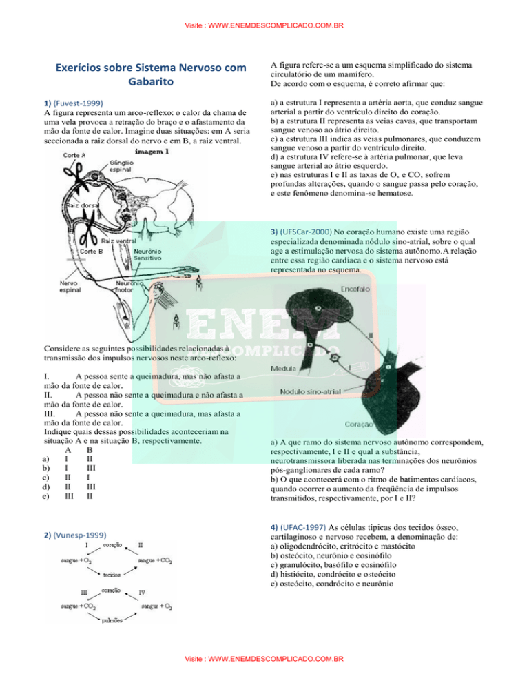 Visite : WWW.ENEMDESCOMPLICADO.COM.BR Exerícios sobre Sistema Nervoso com Gabarito 1) (Fuvest-1999) A figura representa um arco-reflexo: o calor da chama de uma vela provoca a retração do braço e o afastamento da mão da fonte de calor. Imagine duas situações: em A seria seccionada a raiz dorsal do nervo e em B, a raiz ventral. A figura refere-se a um esquema simplificado do sistema circulatório de um mamífero. De acordo com o esquema, é correto afirmar que: a) a estrutura I representa a artéria aorta, que conduz sangue arterial a partir do ventrículo direito do coração. b) a estrutura II representa as veias cavas, que transportam sangue venoso ao átrio direito. c) a estrutura III indica as veias pulmonares, que conduzem sangue venoso a partir do ventrículo direito. d) a estrutura IV refere-se à artéria pulmonar, que leva sangue arterial ao átrio esquerdo. e) nas estruturas I e II as taxas de O‚ e CO‚ sofrem profundas alterações, quando o sangue passa pelo coração, e este fenômeno denomina-se hematose. 3) (UFSCar-2000) No coração humano existe uma região especializada denominada nódulo sino-atrial, sobre o qual age a estimulação nervosa do sistema autônomo.A relação entre essa região cardíaca e o sistema nervoso está representada no esquema. Considere as seguintes possibilidades relacionadas à transmissão dos impulsos nervosos neste arco-reflexo: I. A pessoa sente a queimadura, mas não afasta a mão da fonte de calor. II. A pessoa não sente a queimadura e não afasta a mão da fonte de calor. III. A pessoa não sente a queimadura, mas afasta a mão da fonte de calor. Indique quais dessas possibilidades aconteceriam na situação A e na situação B, respectivamente. A B a) I II b) I III c) II I d) II III e) III II 2) (Vunesp-1999) a) A que ramo do sistema nervoso autônomo correspondem, respectivamente, I e II e qual a substância, neurotransmissora liberada nas terminações dos neurônios pós-ganglionares de cada ramo? b) O que acontecerá com o ritmo de batimentos cardíacos, quando ocorrer o aumento da freqüência de impulsos transmitidos, respectivamente, por I e II? 4) (UFAC-1997) As células típicas dos tecidos ósseo, cartilaginoso e nervoso recebem, a denominação de: a) oligodendrócito, eritrócito e mastócito b) osteócito, neurônio e eosinófilo c) granulócito, basófilo e eosinófilo d) histiócito, condrócito e osteócito e) osteócito, condrócito e neurônio Visite : WWW.ENEMDESCOMPLICADO.COM.BR Visite : WWW.ENEMDESCOMPLICADO.COM.BR 5) (FaZU-2001) A região de encontro entre os neurônios e entre neurônios e órgãos, onde ocorre a transmissão química de impulsos elétricos, é denominada: a) desmossomos b) axônio c) neuroglia d) bainha de mielina e) sinapse 6) (Fuvest-1995) Qual dos seguintes comportamentos envolve maior número de órgãos do sistema nervoso? a) Salivar ao sentir o aroma de comida gostosa. b) Levantar a perna quando o médico toca com martelo no joelho do paciente. c) Piscar com a aproximação brusca de um objeto. d) Retirar bruscamente a mão ao tocar um objeto muito quente. e) Preencher uma ficha de identificação. 7) (Fuvest-1997) Examine a seguinte lista de eventos que ocorrem durante a propagação de um impulso nervoso: I. Neurotransmissores atingem os dendritos. II. Neurotransmissores são liberados pelas extremidades do axônio. III. O impulso se propaga pelo axônio. IV. O impulso se propaga pelos dendritos. V. O impulso chega ao corpo celular. Que alternativa apresenta a seqüência temporal correta desses eventos? a) V - III - I - IV - II. b) I - IV - V - III - II. c) I - IV - III - II - V. d) II - I - IV - III - V. e) II - III - I - IV - V. 8) (UFMG-1994) a) I - 4 b) II - 3 c) III - 2 d) III - 4 e) IV - 1. 9) (FaZU-2002) ‘Os impulsos nervosos, provenientes de fibras nervosas de certa divisão (D1) do sistema nervoso autônomo, inibem os batimentos do coração humano através da liberação de um mediador químico (M) nas junções neuromusculares. Por outro lado, impulsos provenientes de fibras de outra divisão (D2) do mesmo sistema nervoso aceleram os batimentos cardíacos.’ Neste texto, D1, D2 e M correspondem aos seguintes termos: a) D1= simpático, D2= passimpático, M= acetilcolina b) D1=parassimpático, D2= simpático, M= noradrenalina c) D1= simpático, D2= parassimpático, M= colinesterase d) D1= parassimpático, D2= simpático, M= acetilcolina e) D1= simpático, D2= parassimpático, M= noradrenalina 10) (UniFor-2000) Considere a frase abaixo. "No homem, o nervo vago produz I que provoca II da freqüência cardíaca e os nervos cardíacos produzem III que provocam IV da freqüência cardíaca." Para completá-la corretamente, basta substituir I, II, III e IV respectivamente, por a) acetilcolina - diminuição - adrenalina aceleração b) acetilcolina - aceleração - adrenalina diminuição c) acetilcolina - diminuição - adrenalina diminuição d) adrenalina - diminuição - acetilcolina aceleração e) adrenalina - aceleração - acetilcolina diminuição 11) (UFRN-1999) Um motorista infrator, ao dirigir, na Via Costeira, em alta velocidade, perdeu o controle do carro numa curva, sofrendo um acidente. Ao chegar ao prontosocorro, diagnosticou-se uma isquemia cerebral (bloqueio da circulação nas artérias que fornecem sangue ao encéfalo) no lobo frontal do cérebro. Como conseqüência, poderá haver comprometimento da capacidade do motorista para Observe o quadro qrepresentação do sistema nervoso e do coração de alguns grupos de vertebrados. Essa representação foi feita de forma aleatória, não mostrando correspondência entre sistema nervoso e coração para cada grupo nem apresentando seqüência evolutiva. (ver imagem) A alternativa que apresenta a associação correta encontrada em peixes é : a) piscar sob o estímulo de uma luz intensa. b) salivar ao sentir o aroma de uma comida. c) preencher uma ficha de identificação. d) sentir dor ao encostar num f