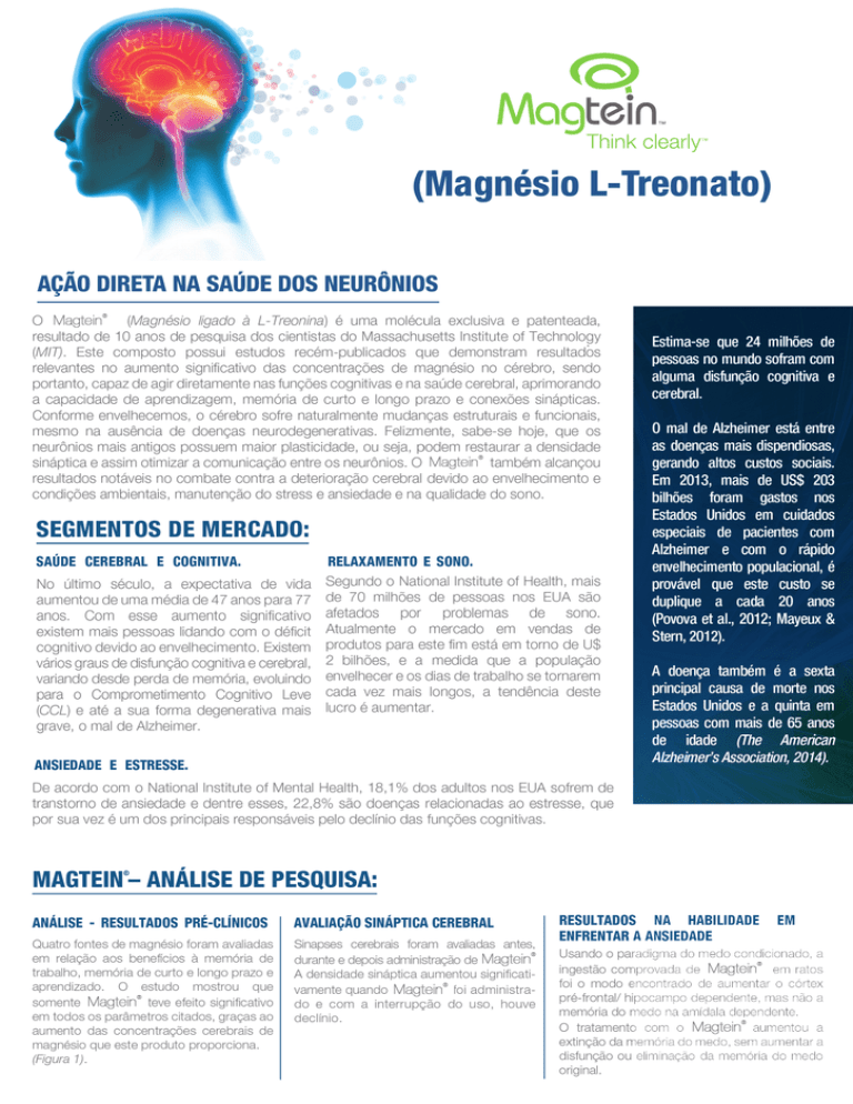 (Magnésio L-Treonato) AÇÃO DIRETA NA SAÚDE DOS NEURÔNIOS Figura 1-Avaliação da concentração de diferentes compostos de magnésio no cérebro: 120 [Mg]csf (%) 110 Magtein Control MgCI2 MgG+milk 100 90 80 02 12 4 Time (Days) Magnesium concentration in the cerebrospinal fluid following diferent magnesium compound intake were measured before (day0), 12, and 24 days after magnesium treatment. Only Magtein was shown to have a significant effect (*** p<0.001). 0800 940 3210 +55 (11) 3508-0300 [email protected] www.aticaquimica.com.br