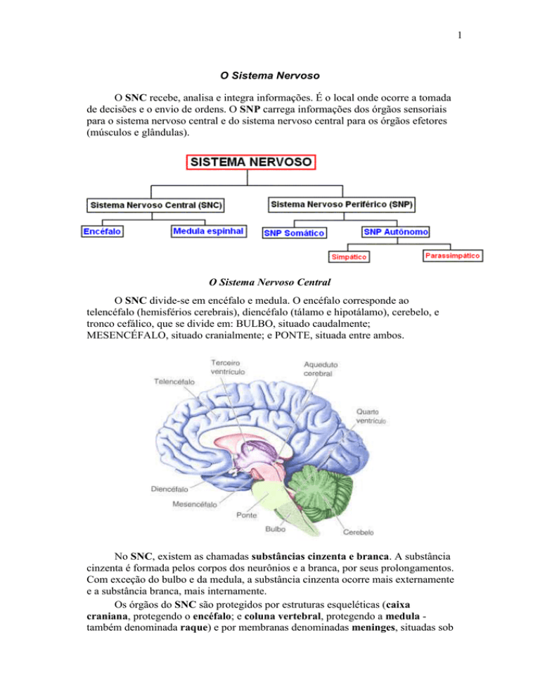 1 O Sistema Nervoso O SNC recebe, analisa e integra informações. É o local onde ocorre a tomada de decisões e o envio de ordens. O SNP carrega informações dos órgãos sensoriais para o sistema nervoso central e do sistema nervoso central para os órgãos efetores (músculos e glândulas). O Sistema Nervoso Central O SNC divide-se em encéfalo e medula. O encéfalo corresponde ao telencéfalo (hemisférios cerebrais), diencéfalo (tálamo e hipotálamo), cerebelo, e tronco cefálico, que se divide em: BULBO, situado caudalmente; MESENCÉFALO, situado cranialmente; e PONTE, situada entre ambos. No SNC, existem as chamadas substâncias cinzenta e branca. A substância cinzenta é formada pelos corpos dos neurônios e a branca, por seus prolongamentos. Com exceção do bulbo e da medula, a substância cinzenta ocorre mais externamente e a substância branca, mais internamente. Os órgãos do SNC são protegidos por estruturas esqueléticas (caixa craniana, protegendo o encéfalo; e coluna vertebral, protegendo a medula também denominada raque) e por membranas denominadas meninges, situadas sob 2 a proteção esquelética: dura-máter (a externa), aracnóide (a do meio) e pia-máter (a interna). Entre as meninges aracnóide e pia-máter há um espaço preenchido por um líquido denominado líquido cefalorraquidiano ou líquor. O TELENCÉFALO O encéfalo humano contém cerca de 35 bilhões de neurônios e pesa aproximadamente 1,4 kg. O telencéfalo ou cérebro é dividido em dois hemisférios cerebrais bastante desenvolvidos. Nestes, situam-se as sedes da memória e dos nervos sensitivos e motores. Entre os hemisférios, estão os VENTRÍCULOS CEREBRAIS (ventrículos laterais e terceiro ventrículo); contamos ainda com um quarto ventrículo, localizado mais abaixo, ao nível do tronco encefálico. São reservatórios do LÍQUIDO CÉFALO-RAQUIDIANO, (LÍQÜOR), participando na nutrição, proteção e excreção do sistema nervoso. Em seu desenvolvimento, o córtex ganha diversos sulcos para permitir que o cérebro esteja suficientemente compacto para caber na calota craniana, que não acompanha o seu crescimento. Por isso, no cérebro adulto, apenas 1/3 de sua superfície fica "exposta", o restante permanece por entre os sulcos. O córtex cerebral está dividido em mais de quarenta áreas funcionalmente distintas, sendo a maioria pertencente ao chamado neocórtex. 3 Cada uma das áreas do córtex cerebral controla uma atividade específica. 1. hipocampo: região do córtex que está dobrada sobre si e possui apenas três camadas celulares; localiza-se medialmente ao ventrículo lateral. 2. córtex olfativo: localizado ventral e lateralmente ao hipocampo; apresenta duas ou três camadas celulares. 3. neocórtex: córtex mais complexo; separa-se do córtex olfativo mediante um sulco chamado fissura rinal; apresenta muitas camadas celulares e várias áreas sensoriais e motoras. As áreas motoras estão intimamente envolvidas com o controle do movimento voluntário. A região superficial do telencéfalo, que acomoda bilhões de corpos celulares de neurônios (substância cinzenta), constitui o córtex cerebral, formado a partir da fusão das partes superficiais telencefálicas e diencefálicas. O córtex recobre um grande centro medular branco, formado por fibras axonais (substância branca). Em meio a este centro branco (nas profundezas do telencéfalo), há agrupamentos de corpos celulares neuronais que formam os núcleos (gânglios) da base ou núcleos (gânglios) basais - CAUDATO, PUTAMEN, GLOBO PÁLIDO e NÚCLEO SUBTALÂMICO, envolvidos em conjunto, no controle do movimento. Parece que os gânglios da base participam também de um grande número de circuitos paralelos, 4 sendo apenas alguns poucos de função motora. Outros circuitos estão envolvidos em certos aspectos da memória e da função cognitiva. Algumas das funções mais específicas dos gânglios basais relacionadas aos movimentos são: 1. núcleo caudato: controla movimentos intencionais grosseiros do corpo (isso ocorre a nível sub-consciente e consciente) e auxilia no controle global dos movimentos do corpo. 2. putamen: funciona em conjunto com o núcleo caudato no controle de movimentos intensionais grosseiros. Ambos os núcleos funcionam em associação com o córtex motor, para controlar diversos padrões de movimento. 3. globo pálido: provavelmente controla a posição das principais partes do corpo, quando uma pessoa inicia um movimento complexo, Isto é, se uma pessoa deseja executar uma função precisa com uma de suas mãos, deve primeiro colocar seu corpo numa posição apropriada e, então, contrair a musculatura do braço. Acredita-se que essas funções sejam iniciadas, principalmente, pelo globo pálido. 4. núcleo subtalâmico e áreas associadas: controlam possivelmente os movimentos da marcha e talvez outros tipos de motilidade grosseira do corpo. Evidências indicam que a via motora direta funciona para facilitar a iniciação de movimentos voluntários por meio dos gânglios da base. Essa via origina-se com uma conexão excitatória do córtex para as células do putamen. Estas células estabelecem sinapses inibitórias em neurônios do globo pálido, que, por sua vez, faz conexões inibitórias com células do tálamo (núcleo ventrolateral - VL). A conexão do tálamo com a área motora do córtex é excitatória. Ela facilita o disparo de células 5 relacionadas a movimentos na área motora do córtex. Portanto, a conseqüência funcional da ativação cortical do putâmen é a excitação da área motora do córtex pelo núcleo ventrolateral do tálamo. O DIENCÉFALO (tálamo e hipotálamo) Todas as mensagens sensoriais, com exceção das provenientes dos receptores do olfato, passam pelo tálamo antes de atingir o córtex cerebral. Esta é uma região de substância cinzenta localizada entre o tronco encefálico e o cérebro. O tálamo atua como estação retransmissora de impulsos nervosos par