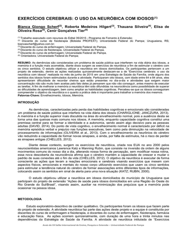 EXERCÍCIOS CEREBRAIS: O USO DA NEURÓBICA COM IDOSOS(1) Bianca Giongo Scherf(2), Roberta Medeiros Hilgert(3), Thauana Silveira(4), Elisa de Oliveira Rosa(5), Cenir Gonçalves Tier(6) (1) Trabalho executado com recursos do Edital 35/2015 - Programa de Fomento à Extensão; Discente do curso de fisioterapia (Bolsista PROFEXT); Universidade Federal do Pampa; Uruguaiana, RS; [email protected]; (3) Discente do curso de enfermagem; Universidade Federal do Pampa. (4) Discente do curso de fisioterapia, Universidade Federal do Pampa. (5) Discente do curso de enfermagem; Universidade Federal do Pampa. (6) Orientadora; Universidade Federal do Pampa; (2) RESUMO: As demências são consideradas um problema de saúde pública que interferem na vida diária dos idosos, a memória é a função mais acometida, diante disso surgem os exercícios de neuróbica a fim de estimular o cérebro com os cinco sentidos. O estudo objetivou utilizar a neuróbica em idosos domiciliados. Os participantes pertencem a um projeto de extensão, dentre as ações realizadas quinzenalmente destacam-se a de “Exercícios cerebrais: o uso da neuróbica com idosos” realizada no mês de junho de 2015 em uma Estratégia de Saúde da Família, onde alguns dos sentidos dos idosos foram estimulados durante a atividade. Participaram oito idosos, com idade entre 64 e 84 anos, eles apresentaram dificuldade de recordar cheiros que estão presentes no dia-a-dia e atividades que exigem maior concentração não são muito bem aceitas pelo fato deles já pensarem que não vão conseguir, antes mesmo de executar as tarefas. A fim de melhorar a memória a neuróbica têm sido difundidas na neurociência como possibilidade de superar as dificuldades de aprendizagem, bem como ampliar as habilidades cognitivas. Percebeu-se que os idosos conseguiram compreender o objetivo da neuróbica e o quanto a prática dela é importante para trabalhar a memória dos mesmos. Palavras-Chave: Envelhecimento, Idosos, Memória. INTRODUÇÃO As demências, caracterizadas pela perda das habilidades cognitivas e emocionais são consideradas um problema de saúde pública que interfere na vida diária dos idosos (CHARIGLIONE; JANCZURA, 2013). A memória é a função superior mais discutida na área do envelhecimento normal, pois a ausência desta se torna uma das queixas mais comuns nos idosos. A memória, enquanto capacidade cognitiva constitui uma premissa central para se formar a identidade e a autonomia, sendo assim algo decisivo para as pessoas adultas (DAVID, 2014). Do ponto de vista cognitivo, o envelhecimento normal é caracterizado por déficit na memória episódica verbal e prejuízo nas funções executivas, bem como pela diminuição na velocidade de processamento de informações (OLIVEIRA et al., 2013). Com o envelhecimento os neurônios do cérebro vão reduzindo a capacidade de formar novas sinapses, e ainda, por falta de estímulos, há o risco de perder as sinapses antigas (CHELLES, 2012). Diante desse contexto, surgem os exercícios de neuróbica, criada nos EUA no ano 2000 pelos neurocientistas americanos Lawrence Katz e Manning Rubin, que consiste na inversão da ordem de alguns movimentos comuns do nosso dia a dia, alterando nossa forma de percepção, sem modificar nossa rotina, essa nova descoberta da neurociência afirma que o cérebro mantém a capacidade de crescer e mudar o padrão de suas conexões até o fim da vida (CHELLES, 2012). O objetivo da neuróbica é executar de forma consciente as ações que levam a reações emocionais e cerebrais visando exercícios que mexem com aspectos físicos, emocionais e mentais do nosso corpo utilizando exercícios que usam os cinco sentidos para estimular a tendência natural do cérebro de formar associações entre diferentes tipos de informações, colocando assim os sentidos em sinal de alerta para uma nova situação (KATZ; RUBIN, 2000). O estudo objetivou utilizar a neuróbica em idosos domiciliados do município de Uruguaiana que participam do projeto de extensão “Ações de saúde para idosos domiciliados em uma Região do Oeste do Rio Grande do Sul/Brasil”, visando assim, auxiliar na minimização dos prejuízos que a memória pode ocasionar na pessoa idosa. METODOLOGIA Estudo exploratório-descritivo de caráter qualitativo. Os participantes foram os idosos que fazem parte do projeto de extensão. A atividade neuróbica faz parte das ações deste projeto e a equipe é constituída por discentes do curso de enfermagem e fisioterapia, e docentes do curso de enfermagem, fisioterapia, farmácia e educação física. As ações ocorrem quinzenalmente, com duração de uma hora e trinta minutos nas dependências da Estratégia de Saúde da Família. A atividade de neuróbica intitulada de “Exercícios Anais do VII Salão Internacional de Ensino, Pesquisa e Extensão – Universidade Federal do Pampa cerebrais: o uso da neuróbica com idosos” foi realizada no mês de junho de 2015 e teve início no momento em que uma das integrantes da equipe apresentou aos idosos como seria esta atividade e, neste momento, abriu-se para discussão e para sanar dúvidas dos idosos a respeito das dinâmicas. Na segunda etapa, os idosos sortearam uma palavra da caixa de palavras e falaram outras cinco palavras que iniciavam com a mesma letra da palavra sorteada, sem receber a ajuda dos outros idosos. Na terceira etapa, os idosos foram vendados, e deveriam realizar a identificação tátil e olfativa de objetos. Na tátil eles deveriam identificar uma caneta, uma bola, uma banana, uma laranja e uma maça somente com o tato. Na identificação olfativa eles deveriam identificar o cheiro de cravo, salsa, alecrim, bergamota e de canela. Na quarta e última etapa, os idosos formaram duas filas, onde o último idoso de cada fila era orientado a desenhar nas costas do idoso a sua frente que estivesse na sua frente. Em uma das filas a orientação foi para desenhar uma flor, já na outra fila uma casa,