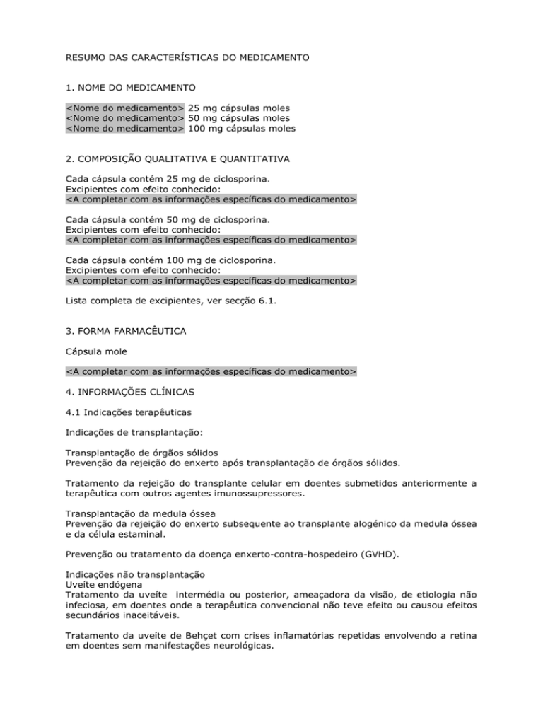 RESUMO DAS CARACTERÍSTICAS DO MEDICAMENTO 1. NOME DO MEDICAMENTO <Nome do medicamento> 25 mg cápsulas moles <Nome do medicamento> 50 mg cápsulas moles <Nome do medicamento> 100 mg cápsulas moles 2. COMPOSIÇÃO QUALITATIVA E QUANTITATIVA Cada cápsula contém 25 mg de ciclosporina. Excipientes com efeito conhecido: <A completar com as informações específicas do medicamento> Cada cápsula contém 50 mg de ciclosporina. Excipientes com efeito conhecido: <A completar com as informações específicas do medicamento> Cada cápsula contém 100 mg de ciclosporina. Excipientes com efeito conhecido: <A completar com as informações específicas do medicamento> Lista completa de excipientes, ver secção 6.1. 3. FORMA FARMACÊUTICA Cápsula mole <A completar com as informações específicas do medicamento> 4. INFORMAÇÕES CLÍNICAS 4.1 Indicações terapêuticas Indicações de transplantação: Transplantação de órgãos sólidos Prevenção da rejeição do enxerto após transplantação de órgãos sólidos. Tratamento da rejeição do transplante celular em doentes submetidos anteriormente a terapêutica com outros agentes imunossupressores. Transplantação da medula óssea Prevenção da rejeição do enxerto subsequente ao transplante alogénico da medula óssea e da célula estaminal. Prevenção ou tratamento da doença enxerto-contra-hospedeiro (GVHD). Indicações não transplantação Uveíte endógena Tratamento da uveíte intermédia ou posterior, ameaçadora da visão, de etiologia não infeciosa, em doentes onde a terapêutica convencional não teve efeito ou causou efeitos secundários inaceitáveis. Tratamento da uveíte de Behçet com crises inflamatórias repetidas envolvendo a retina em doentes sem manifestações neurológicas. Síndrome nefrótico Síndrome nefrótico esteroide-dependente e esteroide-resistente devido a doenças glomerulares primárias, tais como alteração nefropática mínima, glomerulo-esclerose focal e segmentar ou glomerulonefrite membranosa. <Nome do medicamento> pode ser utilizado para indução e manutenção de remissões. Pode também ser utilizado para a manutenção da remissão induzida por esteroides, permitindo a suspensão dos esteroides. Artrite reumatoide Tratamento da artrite reumatoide ativa grave. Psoríase Tratamento da psoríase grave em doentes nos quais a terapêutica convencional se mostrou ineficaz ou inadequada. Dermatite atópica <Nome do medicamento> está indicado em doentes com dermatite atópica grave quando é necessária terapêutica sistémica. 4.2 Posologia e modo de administração Posologia Os intervalos de dose indicados para a administração oral têm como objetivo serem apenas uma orientação. As doses diárias de <Nome do medicamento> devem ser divididas em 2 administrações distribuídas igualmente ao longo do dia. Recomenda-se que o <Nome do medicamento> seja administrado num horário consistente tendo em conta a altura do dia e relativamente às refeições. <A completar com as informações específicas do medicamento> <Nome do medicamento> deve ser apenas prescrito por, ou em colaboração próxima com, um médico com experiência em terapêutica imunossupressora e/ou transplante de órgãos. Transplantação Transplantação de órgãos sólidos O tratamento com <Nome do medicamento> deve iniciar-se no intervalo de 12 horas antes da cirurgia numa dose de 10 a 15 mg/kg dividida em duas administrações. Esta dose deverá ser mantida diariamente durante 1 ou 2 semanas do pós-operatório antes de ser gradualmente reduzida de acordo com os níveis sanguíneos segundo protocolos imunossupressivos locais, até que se atinja uma dose de manutenção recomendada de cerca de 2 a 6 mg/kg/dia dividida em 2 administrações. Quando <Nome do medicamento> é administrado simultaneamente com outros imunossupressores (por ex. corticosteroides ou como parte de uma terapêutica imunossupressora tripla ou quádrupla), podem ser utilizadas doses menores (por ex. 3 a 6 mg/kg/dia divididos em 2 administrações para o início do tratamento). Transplantação de medula óssea A dose inicial deverá ser administrada no dia anterior à transplantação. Na maior parte dos casos o concentrado para solução para perfusão é preferível para esta finalidade. A dose intravenosa recomendada é de 3 a 5 mg/kg/dia. A perfusão é mantida continuamente nesta dose durante o período pós-transplante imediato até 2 semanas, previamente à alteração para terapêutica oral de manutenção com <Nome do medicamento>, numa dose de cerca de 12,5 mg/kg dividida em 2 administrações. O tratamento de manutenção deverá ser mantido durante pelo menos 3 meses (de preferência durante 6 meses) antes da redução gradual da dose até zero, cerca de 1 ano após a transplantação. Se for usado <Nome do medicamento> para iniciar o tratamento, a dose diária recomendada é de 12,5 a 15 mg/kg em 2 administrações, com início um dia antes da transplantação. Poderão ser necessárias doses superiores de <Nome do medicamento>, ou a utilização de terapêutica intravenosa, no caso de distúrbios gastrointestinais os quais podem reduzir a absorção do fármaco. Em alguns doentes ocorre doença enxerto-contra-hospedeiro (GVHD) após interrupção do tratamento com ciclosporina, mas normalmente esta situação responde favoravelmente à reintrodução da terapêutica. Nestes casos deve ser administrada por via oral uma dose de carga inicial de 10 a 12,5 mg/kg, seguida de uma administração oral diária da dose de manutenção que foi previamente considerada ser satisfatória. Devem ser utilizadas doses baixas de <Nome do medicamento>para tratar a doença enxerto-contra-hospedeiro (GVHD) crónica ligeira. Indicações não transplantação Quando se utiliza <Nome do medicamento> para qualquer uma das indicações não transplantação, devem ser seguidas as seguintes regras gerais: Antes de iniciar o tratamento, deve-se estabelecer com 
