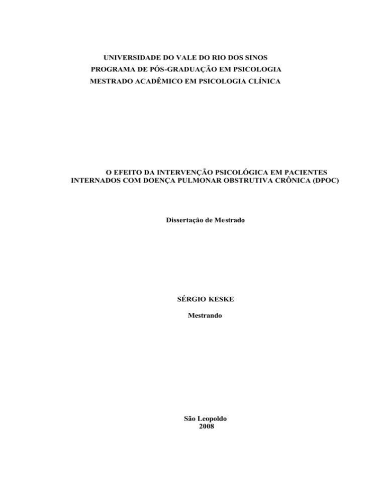 UNIVERSIDADE DO VALE DO RIO DOS SINOS PROGRAMA DE PÓS-GRADUAÇÃO EM PSICOLOGIA MESTRADO ACADÊMICO EM PSICOLOGIA CLÍNICA O EFEITO DA INTERVENÇÃO PSICOLÓGICA EM PACIENTES INTERNADOS COM DOENÇA PULMONAR OBSTRUTIVA CRÔNICA (DPOC) Dissertação de Mestrado SÉRGIO KESKE Mestrando São Leopoldo 2008 O EFEITO DA INTERVENÇÃO PSICOLÓGICA EM PACIENTES INTERNADOS COM DOENÇA PULMONAR OBSTRUTIVA CRÔNICA (DPOC) SÉRGIO KESKE Dissertação de Mestrado apresentada no Programa de Pós Graduação em Psicologia, Área de concentração Psicologia Clínica, da Universidade do Vale do Rio dos Sinos como requisito parcial para a obtenção do título de Mestre em Psicologia. Orientador: Prof. Dr. Maycoln L. M. Teodoro São Leopoldo, 2008 2 Universidade do Vale do Rio dos Sinos - UNISINOS Programa de Pós -Graduação em Psicologia O EFEITO DA INTERVENÇÃO PSICOLÓGICA EM PACIENTES INTERNADOS COM DOENÇA PULMONAR OBSTRUTIVA CRÔNICA (DPOC) Monografia (Dissertação) apresentada ao programa de Pós-Graduação em Psicologia da Universidade do Vale do Rio dos Sinos – UNISINOS, como requisito parcial para obtenção do grau de Mestre em Psicologia Clínica. Elaborado por Sérgio Keske São Leopoldo, 2008 3 Ficha catalográfica elaborada pela Biblioteca da Universidade do Vale do Rio dos Sinos K42e Keske, Sérgio. O efeito da intervenção psicológica em pacientes internados com doença pulmonar obstrutiva crônica (DPOC) / Sérgio Keske. – 2008. 119 f. : il. ; 30 cm. Dissertação (mestrado) – Universidade do Vale do Rio dos Sinos, Programa de Pós-Graduação em Psicologia, 2008. “Orientador: Prof. Dr. Maycoln L. M. Teodoro”. 1. Pulmões – Doenças – Pacientes. 2. Terapia cognitiva. 3. Depressão. 4. Psicologia educacional. 5. Psicologia clínica. 6. Ansiedade. I. Título. CDU-159.9:616.24 Catalogação na publicação: Bibliotecário Flávio Nunes – CRB 10/1298 4 À minha querida esposa Raquele cujo apoio afetivo foi essencial ao término desse trabalho e ao meu filho Renato 5 AGRADECIMENTOS Todo trabalho só existe com a colaboração de alguém. Muitos dos quais anônimos, mas não por isso de menor importância. Agradeço a toda equipe de enfermagem do Hospital Sapiranga, que me auxiliou na busca dos pacientes com DPOC e na aferição do peso dos mesmos. Um obrigado aos estudantes da graduação de Psicologia da UNISINOS. Tamires, que auxiliou na coleta de dados e Elisa que organizou de forma primorosa os dados no SPSS. Um especial obrigado ao amigo e também estudante de Psicologia, mas na Faculdade de Taquara (FACAT), Jadir, que completou o trabalho inicial da Tamires, mesmo estando sempre muito atarefado. Aos professores Taís e Jardim que gentilmente cederam o questionário Saint George’s Respiratory Questionnaire (SGRQ) e ao professor Paulo Zimmermann do Centro Universitário Feevale que, sem me conhecer, emprestou seu espirômetro para que essa pesquisa fosse viabilizada. A minha esposa que pacientemente ajudou-me na difícil tarefa de selecionar os artigos de revisão e me apoiou nos momentos de desânimo. Ao professor e primeiro orientador Christian Haag Kristensen que norteou a pesquisa, organizando as idéias, estabelecendo metas, e montando o protocolo com Técnicas Cognitivocomportamentais com maestria. Ao professor e orientador Maycoln Teodoro que muito me ensinou, da forma mais educada e afetiva, o trabalhar das idéias. Admiro a sua capacidade de pesquisa e sua abnegação aos mestrandos que orientou. Aos pacientes, sem os quais nada disso seria possível. A família, início de tudo. Muito Obrigado! 6 Sumário Resumo............................................................................................................... 9 Abstract.............................................................................................................. 10 Apresentação....……………………………………………………………….. 11 Seção I – Relatório de Pesquisa ........................................................................ 12 Histórico e Prevalência da DPOC...................................................................... 12 Ansiedade, Depressão e Qualidade de Vida na DPOC...................................... 19 Intervenções em DPOC...................................................................................... 23 DPOC e Programas de Reabilitação.................................................................. 24 Objetivo Geral.................................................................................................... 26 Objetivos Específicos e Hipóteses..................................................................... 26 Materiais e Método............................................................................................ 27 Delineamento..................................................................................................... 27 Amostra.............................................................................................................. 27 Instrumentos....................................................................................................... 30 Procedimentos de Pesquisa e Éticos.................................................................. 31 Procedimentos de Intervenção........................................................................... 33 Técnicas de Terapia Cognitivo-Comportamental (TCC)................................... 33 Psicoeducação.................................................................................................... 34 Análise dos Dados.............................................................................................. 34 Resultados.......................................................................................................... 34 Discussão........................................................................................................... 38 Seção II – artigo teórico.....................