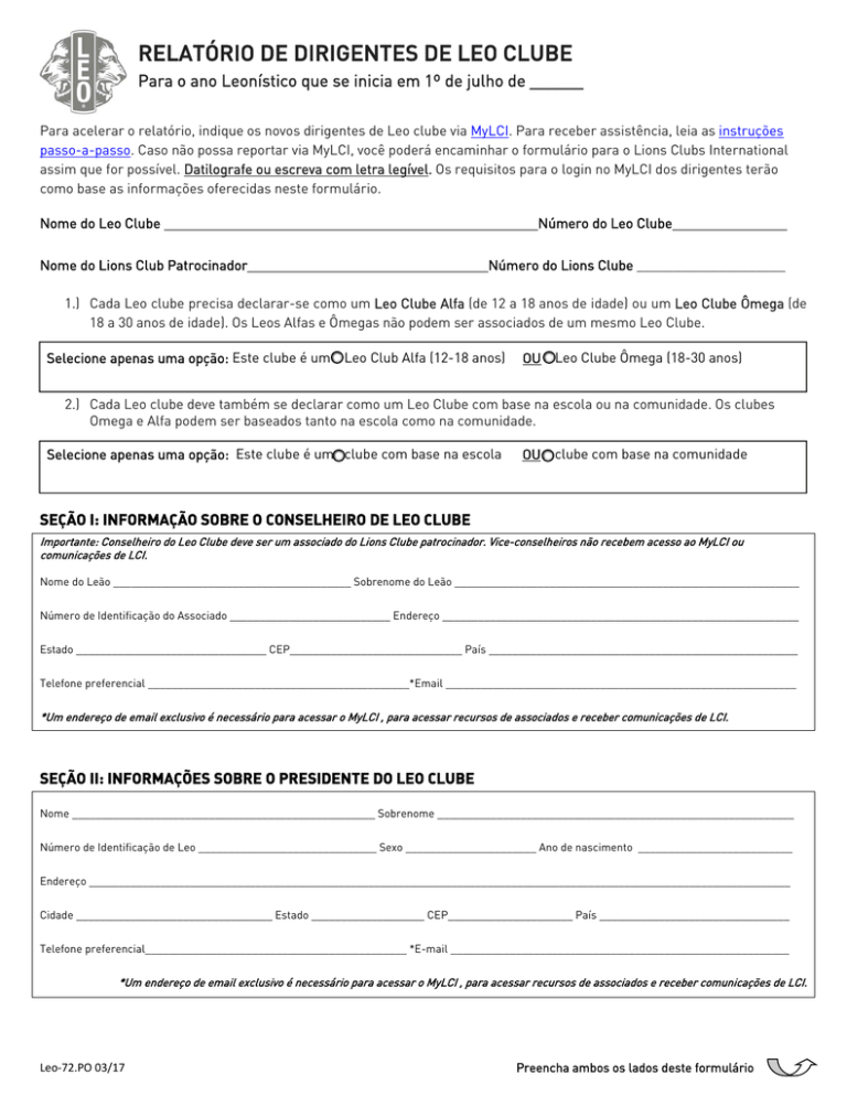 RELATÓRIO DE DIRIGENTES DE LEO CLUBE Para o ano Leonístico que se inicia em 1º de julho de ______ Para acelerar o relatório, indique os novos dirigentes de Leo clube via MyLCI. Para receber assistência, leia as instruções passo-a-passo. Caso não possa reportar via MyLCI, você poderá encaminhar o formulário para o Lions Clubs International assim que for possível. Datilografe ou escreva com letra legível. Os requisitos para o login no MyLCI dos dirigentes terão como base as informações oferecidas neste formulário. Nome do Leo Clube Nome do Lions Club Patrocinador Número do Leo Clube Número do Lions Clube ____________________ 1.) Cada Leo clube precisa declarar-se como um Leo Clube Alfa (de 12 a 18 anos de idade) ou um Leo Clube Ômega (de 18 a 30 anos de idade). Os Leos Alfas e Ômegas não podem ser associados de um mesmo Leo Clube. Selecione apenas uma opção: Este clube é um Leo Club Alfa (12-18 anos) OU Leo Clube Ômega (18-30 anos) 2.) Cada Leo clube deve também se declarar como um Leo Clube com base na escola ou na comunidade. Os clubes Omega e Alfa podem ser baseados tanto na escola como na comunidade. Selecione apenas uma opção: Este clube é um clube com base na escola OU clube com base na comunidade SEÇÃO I: INFORMAÇÃO SOBRE O CONSELHEIRO DE LEO CLUBE Importante: Conselheiro do Leo Clube deve ser um associado do Lions Clube patrocinador. Vice-conselheiros não recebem acesso ao MyLCI ou comunicações de LCI. Nome do Leão ________________________________________ Sobrenome do Leão __________________________________________________________ Número de Identificação do Associado ___________________________ Endereço ____________________________________________________________ Estado ________________________________ CEP_____________________________ País ____________________________________________________ Telefone preferencial ____________________________________________*Email ___________________________________________________________ *Um endereço de email exclusivo é necessário para acessar o MyLCI , para acessar recursos de associados e receber comunicações de LCI. SEÇÃO II: INFORMAÇÕES SOBRE O PRESIDENTE DO LEO CLUBE Nome ___________________________________________________ Sobrenome ____________________________________________________________ Número de Identificação de Leo ______________________________ Sexo ______________________ Ano de nascimento __________________________ Endereço ______________________________________________________________________________________________________________________ Cidade _________________________________ Estado ___________________ CEP_____________________ País ________________________________ Telefone preferencial____________________________________________ *E-mail _________________________________________________________ *Um endereço de email exclusivo é necessário para acessar o MyLCI , para acessar recursos de associados e receber comunicações de LCI. Leo‐72.PO 03/17 Preencha ambos os lados deste formulário SEÇÃO III: CONSENTIMENTO DOS PAIS/TUTORES OU ASSOCIADO É da responsabilidade do Lions clube patrocinador manter os registros de consentimento referentes a todos os jovens que se associarem a um Leo clube. O Formulário de Afiliação ao Leo Clube Alfa (Leo50-A) deve ser analisado e preenchido por um dos pais ou tutor dos associados do Leo clube abaixo da maioridade legal e guardado nos arquivos do Lions clube patrocinador. O Formulário de Afiliação ao Leo Clube Ômega (Leo50-O) deve ser analisado e preenchido pelo novo associado do Leo clube com maioridade legal e guardado nos arquivos do Lions clube patrocinador. Ao assinar abaixo, confirmo que um formulário preenchido de Afiliação ao Leo Clube (Leo50-A ou Leo50-O) foi recebido para todos os dirigentes e associados de Leo clube, incluindo o presidente do Leo clube listado acima. O formulário Leo50 preenchido indica consentimento para a entrada de dados pessoais do Leo no banco de dados dos associados de LCI para serem usados para facilitar as comunicações com e entre os associados. Entendo que as informações pessoais fornecidas acima devem ser usadas exclusivamente para avançar os propósitos de LCI incluindo: “unir os clubes em laços de amizade, bom companheirismo e compreensão mútua" e realizar atividades operacionais de acordo com a norma de privacidade de LCI. ______________________________ Assinatura do Presidente do Lions clube, Secretário do Lions clube ou Conselheiro de Leo clube ___________________________ Nome do assinante/dirigente _____________________________ Cargo ______________________________ Número de Identificação do Associado _____________________________ Data ******************************************************************************************************************** Queira enviar o formulário preenchido usando uma das opções abaixo: Email: [email protected] Fax: +1 630 571 1692 Lions Clubs International, Centro de Atendimento aos Associados| 300 W. 22nd Street, Oak Brook, Illinois 60523-8842, EUA Leo‐72.PO 03/17