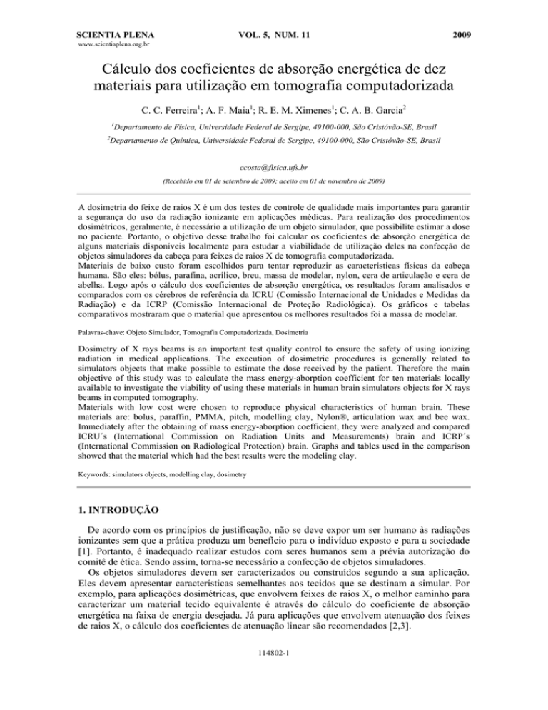 SCIENTIA PLENA VOL. 5, NUM. 11 2009 www.scientiaplena.org.br Cálculo dos coeficientes de absorção energética de dez materiais para utilização em tomografia computadorizada C. C. Ferreira1; A. F. Maia1; R. E. M. Ximenes1; C. A. B. Garcia2 1 Departamento de Física, Universidade Federal de Sergipe, 49100-000, São Cristóvão-SE, Brasil 2 Departamento de Química, Universidade Federal de Sergipe, 49100-000, São Cristóvão-SE, Brasil [email protected] (Recebido em 01 de setembro de 2009; aceito em 01 de novembro de 2009) A dosimetria do feixe de raios X é um dos testes de controle de qualidade mais importantes para garantir a segurança do uso da radiação ionizante em aplicações médicas. Para realização dos procedimentos dosimétricos, geralmente, é necessário a utilização de um objeto simulador, que possibilite estimar a dose no paciente. Portanto, o objetivo desse trabalho foi calcular os coeficientes de absorção energética de alguns materiais disponíveis localmente para estudar a viabilidade de utilização deles na confecção de objetos simuladores da cabeça para feixes de raios X de tomografia computadorizada. Materiais de baixo custo foram escolhidos para tentar reproduzir as características físicas da cabeça humana. São eles: bólus, parafina, acrílico, breu, massa de modelar, nylon, cera de articulação e cera de abelha. Logo após o cálculo dos coeficientes de absorção energética, os resultados foram analisados e comparados com os cérebros de referência da ICRU (Comissão Internacional de Unidades e Medidas da Radiação) e da ICRP (Comissão Internacional de Proteção Radiológica). Os gráficos e tabelas comparativos mostraram que o material que apresentou os melhores resultados foi a massa de modelar. Palavras-chave: Objeto Simulador, Tomografia Computadorizada, Dosimetria Dosimetry of X rays beams is an important test quality control to ensure the safety of using ionizing radiation in medical applications. The execution of dosimetric procedures is generally related to simulators objects that make possible to estimate the dose received by the patient. Therefore the main objective of this study was to calculate the mass energy-aborption coefficient for ten materials locally available to investigate the viability of using these materials in human brain simulators objects for X rays beams in computed tomography. Materials with low cost were chosen to reproduce physical characteristics of human brain. These materials are: bolus, paraffin, PMMA, pitch, modelling clay, Nylon®, articulation wax and bee wax. Immediately after the obtaining of mass energy-aborption coefficient, they were analyzed and compared ICRU´s (International Commission on Radiation Units and Measurements) brain and ICRP´s (International Commission on Radiological Protection) brain. Graphs and tables used in the comparison showed that the material which had the best results were the modeling clay. Keywords: simulators objects, modelling clay, dosimetry 1. INTRODUÇÃO De acordo com os princípios de justificação, não se deve expor um ser humano às radiações ionizantes sem que a prática produza um benefício para o indivíduo exposto e para a sociedade [1]. Portanto, é inadequado realizar estudos com seres humanos sem a prévia autorização do comitê de ética. Sendo assim, torna-se necessário a confecção de objetos simuladores. Os objetos simuladores devem ser caracterizados ou construídos segundo a sua aplicação. Eles devem apresentar características semelhantes aos tecidos que se destinam a simular. Por exemplo, para aplicações dosimétricas, que envolvem feixes de raios X, o melhor caminho para caracterizar um material tecido equivalente é através do cálculo do coeficiente de absorção energética na faixa de energia desejada. Já para aplicações que envolvem atenuação dos feixes de raios X, o cálculo dos coeficientes de atenuação linear são recomendados [2,3]. 114802-1 2 C. C. Ferreira et al., Scientia Plena 5, 114802, 2009 Diversos trabalhos têm descrito o uso de materiais tecido equivalente para uso em dosimetria e controle de qualidade, desde a área de radiodiagnóstico até a área de radioterapia [4,5,6]. Em 2003, Jones et. al. desenvolveram materiais tecido equivalente para simular o tecido ósseo, tecido mole e tecido pulmonar em pacientes recém-nascidos, crianças e adultos em exames de tomografia computadorizada (TC) [4]. Em particular, os coeficientes de absorção energética mostraram que esses materiais são bons substitutos desses tecidos para uso em dosimetria de TC [4]. Em 2005, Kinase et. al conduziram um estudo similar, onde desenvolveram materiais tecido equivalente para simular vários órgãos e tecidos do corpo humano, inclusive o cérebro, para uso em aplicações com radionuclídeos [5]. A validação foi conduzida através do cálculo dos coeficientes de atenuação linear na faixa de energia de 8 keV a 10 MeV [5]. Em 2009, Zachary et. al. caracterizaram uma espuma muito utilizada em construção de aeronaves, automóveis e outros produtos do gênero, para uso como material tecido equivalente do tecido pulmonar em exames de TC [6]. Tal material foi caracterizado em termos da sua Unidade Hounsfield (ou HU em inglês) [6]. O objetivo deste trabalho é caracterizar materiais de baixo custo e fácil acesso para a confecção de objetos simuladores do cérebro humano para dosimetria em feixes de tomografia computadorizada. Para determinar qual material é o melhor tecido equivalente do cérebro humano, os coeficientes de absorção energética foram calculados e comparados aos coeficientes de absorção energética dos tecidos cerebrais de referência dados pela Comissão Internacional de Unidades e Medidas da Radiação (ICRU) e também pela Comissão Internacional de Proteção Radiológica (ICRP). Os materiais usados foram: cera de abelha, massa de modelar, cera de articulação vermelha, cera de articulação lara
