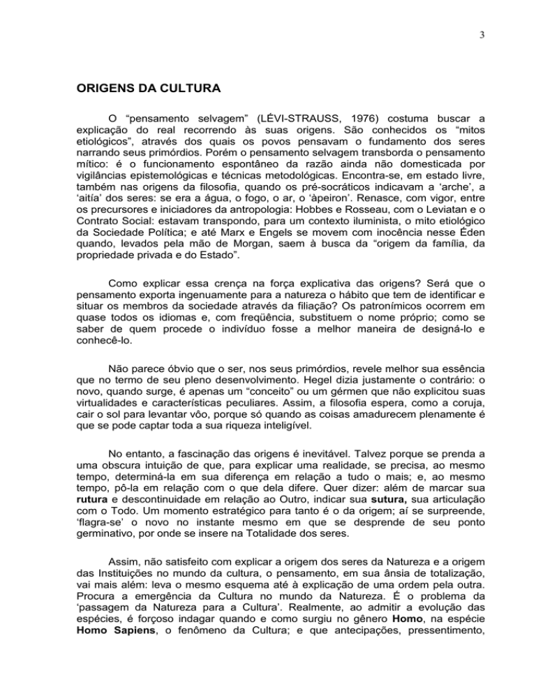 3 ORIGENS DA CULTURA O “pensamento selvagem” (LÉVI-STRAUSS, 1976) costuma buscar a explicação do real recorrendo às suas origens. São conhecidos os “mitos etiológicos”, através dos quais os povos pensavam o fundamento dos seres narrando seus primórdios. Porém o pensamento selvagem transborda o pensamento mítico: é o funcionamento espontâneo da razão ainda não domesticada por vigilâncias epistemológicas e técnicas metodológicas. Encontra-se, em estado livre, também nas origens da filosofia, quando os pré-socráticos indicavam a ‘arche’, a ‘aitía’ dos seres: se era a água, o fogo, o ar, o ‘àpeiron’. Renasce, com vigor, entre os precursores e iniciadores da antropologia: Hobbes e Rosseau, com o Leviatan e o Contrato Social: estavam transpondo, para um contexto iluminista, o mito etiológico da Sociedade Política; e até Marx e Engels se movem com inocência nesse Éden quando, levados pela mão de Morgan, saem à busca da “origem da família, da propriedade privada e do Estado”. Como explicar essa crença na força explicativa das origens? Será que o pensamento exporta ingenuamente para a natureza o hábito que tem de identificar e situar os membros da sociedade através da filiação? Os patronímicos ocorrem em quase todos os idiomas e, com freqüência, substituem o nome próprio; como se saber de quem procede o indivíduo fosse a melhor maneira de designá-lo e conhecê-lo. Não parece óbvio que o ser, nos seus primórdios, revele melhor sua essência que no termo de seu pleno desenvolvimento. Hegel dizia justamente o contrário: o novo, quando surge, é apenas um “conceito” ou um gérmen que não explicitou suas virtualidades e características peculiares. Assim, a filosofia espera, como a coruja, cair o sol para levantar vôo, porque só quando as coisas amadurecem plenamente é que se pode captar toda a sua riqueza inteligível. No entanto, a fascinação das origens é inevitável. Talvez porque se prenda a uma obscura intuição de que, para explicar uma realidade, se precisa, ao mesmo tempo, determiná-la em sua diferença em relação a tudo o mais; e, ao mesmo tempo, pô-la em relação com o que dela difere. Quer dizer: além de marcar sua rutura e descontinuidade em relação ao Outro, indicar sua sutura, sua articulação com o Todo. Um momento estratégico para tanto é o da origem; aí se surpreende, ‘flagra-se’ o novo no instante mesmo em que se desprende de seu ponto germinativo, por onde se insere na Totalidade dos seres. Assim, não satisfeito com explicar a origem dos seres da Natureza e a origem das Instituições no mundo da cultura, o pensamento, em sua ânsia de totalização, vai mais além: leva o mesmo esquema até à explicação de uma ordem pela outra. Procura a emergência da Cultura no mundo da Natureza. É o problema da ‘passagem da Natureza para a Cultura’. Realmente, ao admitir a evolução das espécies, é forçoso indagar quando e como surgiu no gênero Homo, na espécie Homo Sapiens, o fenômeno da Cultura; e que antecipações, pressentimento, 4 esboços, pontos de inserção encontra na ordem da Natureza, nas instâncias biológicas e pulsionais que o homem tem em comum com os outros primatas. Entendida desse modo com as ressalvas epistemológicas necessárias à questão, embora conservando um sabor saudosista de mito etiológico, pode adquirir um conteúdo científico, - ou pelo menos ser um artifício metodológico para pensar as relações entre as duas ordens, a Natureza e a Cultura. Com efeito, a passagem da Natureza para a Cultura, ou do “estado de Natureza para o de Sociedade”, não deve ser entendida como uma arqueologia que procurasse o que veio nos primórdios em primeiro lugar, e o que foi aparecendo depois, e assim sucessivamente. Não se trata de uma genealogia, mas antes de uma gênese. A sociedade humana, o padrão cultural básico, teve de ser produzido simultaneamente em seus elementos essenciais: a comunicação ou intercâmbio humano que está subjacente às relações de família, à linguagem, à produção em comum de seus meios de subsistência e troca de bens, se explica pelo que o homem tem de específico: ‘O homem é um ser natural, mas um ser natural humano’. (Marx) A consciência e a comunicação das consciências são dadas com o homem, pois são sua própria humanidade. Quando essa se destacou entre os grupos de primatas sub-humanos, o acasalamento entre adultos e criação de filhotes, a comunicação pela troca de sinais, as atividades comuns em busca da subsistência ganharam nova dimensão e conteúdo. Aludimos assim às três coordenadas que definem – ou se preferem, aos três pilares que fundam – a vida do homem em sociedade: a comunicação de mulheres entre famílias, tecendo as relações de parentesco e de aliança; a comunicação de palavras, efetivando a comunicação e tradição cumulativa de conhecimentos; a produção e a circulação de bens entre indivíduos e grupos, pelo trabalho, o dom e a troca, tecendo relações sociais através de relações com a natureza. Com a ressalva prévia de que esses pontos de vista diversos não se excluem mas completam, - fornecendo, por assim dizer, uma visão estereoscópica do fenômeno social total – apresentamos a versão de Lévi-Strauss, de Monod e de Marx sobre as origens. Lévi-Strauss, na introdução a ‘Estruturas elementares do Parentesco’, enfoca mais diretamente a origem da Sociedade; Monod, em ‘O Acaso e a Necessidade’, visa especialmente à gênese da Cultura; Marx, na ‘Ideologia alemã’, refere-se ao que chama de ‘fato histórico primordial’. Assim, o primeiro quer identificar o fundamento das relações de parentesco e de aliança que caracterizam e constituem a sociedade humana mais elementar; o segundo analisa as condições de possibilidade da vida cultural; o terceiro descobre uma atividade que transforma a relação homem-natureza por sua mediação, 