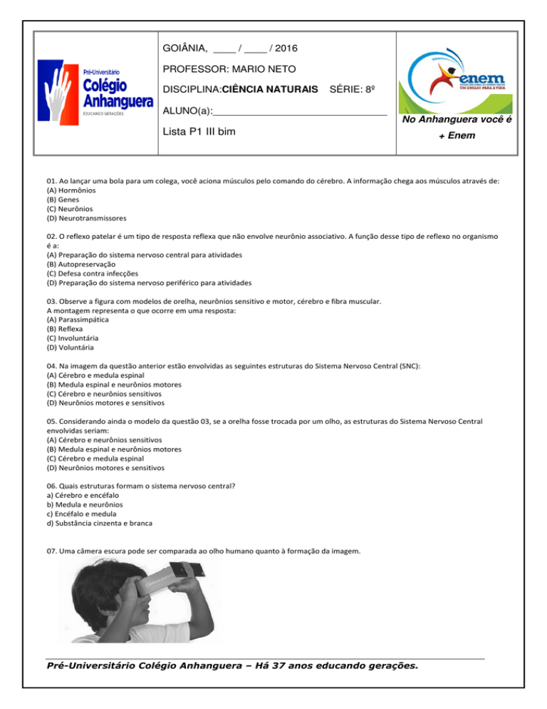 GOIÂNIA, ____ / ____ / 2016 PROFESSOR: MARIO NETO DISCIPLINA:CIÊNCIA NATURAIS SÉRIE: 8º ALUNO(a):_______________________________ No Anhanguera você é Lista P1 III bim + Enem 01. Ao lançar uma bola para um colega, você aciona músculos pelo comando do cérebro. A informação chega aos músculos através de: (A) Hormônios (B) Genes (C) Neurônios (D) Neurotransmissores 02. O reflexo patelar é um tipo de resposta reflexa que não envolve neurônio associativo. A função desse tipo de reflexo no organismo é a: (A) Preparação do sistema nervoso central para atividades (B) Autopreservação (C) Defesa contra infecções (D) Preparação do sistema nervoso periférico para atividades 03. Observe a figura com modelos de orelha, neurônios sensitivo e motor, cérebro e fibra muscular. A montagem representa o que ocorre em uma resposta: (A) Parassimpática (B) Reflexa (C) Involuntária (D) Voluntária 04. Na imagem da questão anterior estão envolvidas as seguintes estruturas do Sistema Nervoso Central (SNC): (A) Cérebro e medula espinal (B) Medula espinal e neurônios motores (C) Cérebro e neurônios sensitivos (D) Neurônios motores e sensitivos 05. Considerando ainda o modelo da questão 03, se a orelha fosse trocada por um olho, as estruturas do Sistema Nervoso Central envolvidas seriam: (A) Cérebro e neurônios sensitivos (B) Medula espinal e neurônios motores (C) Cérebro e medula espinal (D) Neurônios motores e sensitivos 06. Quais estruturas formam o sistema nervoso central? a) Cérebro e encéfalo b) Medula e neurônios c) Encéfalo e medula d) Substância cinzenta e branca 07. Uma câmera escura pode ser comparada ao olho humano quanto à formação da imagem. Pré-Universitário Colégio Anhanguera – Há 37 anos educando gerações. Quando a imagem se forma na câmera, ela aparece invertida no papel vegetal. No olho ocorre: (A) A formação da imagem normal que é enviada ao cérebro (B) A formação da imagem invertida que é corrigida pelo nervo óptico (C) A formação da imagem invertida que é corrigida pelo cérebro (D) A formação da imagem invertida que é corrigida no globo ocular 08. Considerando ainda a figura da questão anterior, a lente da câmera escura corresponde à lente do olho, o cartão com orifícios corresponde à pupila e o papel vegetal, sobre o qual se forma a imagem, corresponde à(ao): (A) Retina (B) Córnea (C) Nervo óptico (D) Músculo do globo ocular 9. O neurônio é uma célula especializada na captação e condução de estímulos. Observe o esquema abaixo, que demonstra seu funcionamento. No neurônio, os estímulos seguem do: A) Corpo celular para dendritos B) Do axônio para dendritos C) Do dendrito para dendritos D) Do corpo celular para axônio 10. O arco reflexo é uma reação que envolve nervos e músculos que tem como finalidade: A) Aumentar a queima de calorias no organismo B) Proteger o organismo de agentes agressores C) Aumentar o tamanho dos neurônios para melhorar sua função D) Aumentar o tamanho dos músculos 11. Um neurônio pode se comunicar com outros neurônios ou com músculos e glândulas por meio de: A) Neurotransmissores B) Neurônios C) Genes D) Hormônios 12. Os sentidos – visão, audição, tato, paladar e olfato – dependem da captação de estímulos e sua condução ao Sistema Nervoso Central para sua interpretação. Nesse processo estão envolvidos: A) Neurônios conectores, neurônios motores e cérebro B) Células sensoriais, neurônios conectores e cérebro C) Células sensoriais, neurônios motores e neurônios conectores D) Células sensoriais, neurônios motores e cérebro 13. Que nome recebe a capa de gordura encontrada no axônio dos neurônios? a) Nodo de ranvier b) Bainha de mielina c) Oligodendróglia d) Micróglia 14. Correlacione: (1) Neurônios sensitivos Pré-Universitário Colégio Anhanguera – Há 37 anos educando gerações. (2) Neurônios motores (3) Interneurônios ( ) São neurônios que se situam inteiramente dentro do SNC. ( ) São neurônios que trazem impulsos da pele ou outros órgãos sensoriais para o SNC. ( ) São neurônios que levam impulsos do SNC para músculos e glândulas. 15. Que nome recebe a transmissão do impulso elétrico pela fibra nervosa? _____________________________________________________________________________________________________________ Pré-Universitário Colégio Anhanguera – Há 37 anos educando gerações.