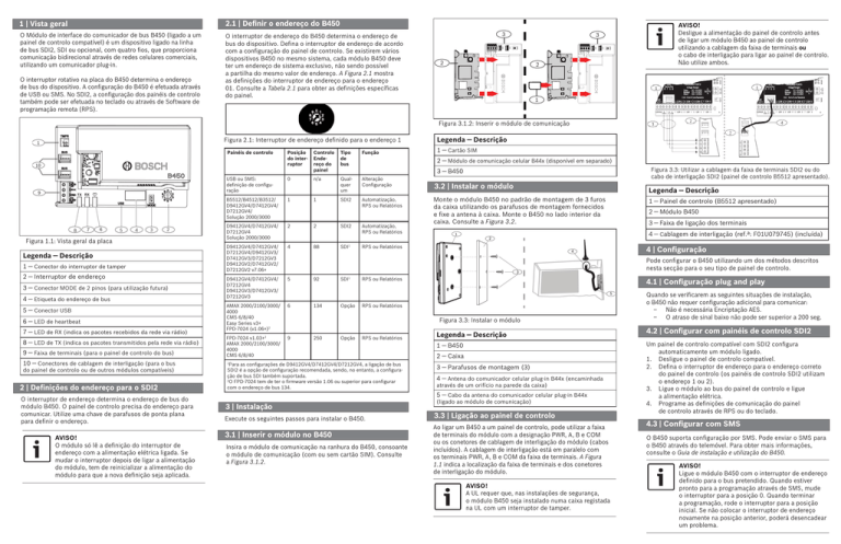 1 | Vista geral 2.1 | Definir o endereço do B450 O Módulo de interface do comunicador de bus B450 (ligado a um painel de controlo compatível) é um dispositivo ligado na linha de bus SDI2, SDI ou opcional, com quatro fios, que proporciona comunicação bidirecional através de redes celulares comerciais, utilizando um comunicador plug-in. O interruptor de endereço do B450 determina o endereço de bus do dispositivo. Defina o interruptor de endereço de acordo com a configuração do painel de controlo. Se existirem vários dispositivos B450 no mesmo sistema, cada módulo B450 deve ter um endereço de sistema exclusivo, não sendo possível a partilha do mesmo valor de endereço. A Figura 2.1 mostra as definições do interruptor de endereço para o endereço 01. Consulte a Tabela 2.1 para obter as definições específicas do painel. O interruptor rotativo na placa do B450 determina o endereço de bus do dispositivo. A configuração do B450 é efetuada através de USB ou SMS. No SDI2, a configuração dos painéis de controlo também pode ser efetuada no teclado ou através de Software de programação remota (RPS). 3 2 3 2 AVISO! Desligue a alimentação do painel de controlo antes de ligar um módulo B450 ao painel de controlo utilizando a cablagem da faixa de terminais ou o cabo de interligação para ligar ao painel de controlo. Não utilize ambos. 1 Figura 3.1.2: Inserir o módulo de comunicação Figura 2.1: Interruptor de endereço definido para o endereço 1 Painéis de controlo Figura 1.1: Vista geral da placa Legenda ― Descrição 1 ― Conector do interruptor de tamper 2 ― Interruptor de endereço 3 ― Conector MODE de 2 pinos (para utilização futura) 4 ― Etiqueta do endereço de bus 5 ― Conector USB 6 ― LED de heartbeat 7 ― LED de RX (indica os pacotes recebidos da rede via rádio) 8 ― LED de TX (indica os pacotes transmitidos pela rede via rádio) 9 ― Faixa de terminais (para o painel de controlo do bus) 10 ― Conectores de cablagem de interligação (para o bus do painel de controlo ou de outros módulos compatíveis) 2 | Definições do endereço para o SDI2 O interruptor de endereço determina o endereço de bus do módulo B450. O painel de controlo precisa do endereço para comunicar. Utilize uma chave de parafusos de ponta plana para definir o endereço. AVISO! O módulo só lê a definição do interruptor de endereço com a alimentação elétrica ligada. Se mudar o interruptor depois de ligar a alimentação do módulo, tem de reinicializar a alimentação do módulo para que a nova definição seja aplicada. Posição do interruptor Controlo Endereço do painel Tipo de bus Função USB ou SMS: definição de configuração 0 n/a Qualquer um Alteração Configuração B5512/B4512/B3512/ D9412GV4/D7412GV4/ D7212GV4/ Solução 2000/3000 1 SDI2 Automatização, RPS ou Relatórios D9412GV4/D7412GV4/ D7212GV4 Solução 2000/3000 2 D9412GV4/D7412GV4/ D7212GV4/D9412GV3/ D7412GV3/D7212GV3 D9412GV2/D7412GV2/ D7212GV2 v7.06+ 4 D9412GV4/D7412GV4/ D7212GV4 D9412GV3/D7412GV3/ D7212GV3 5 AMAX 2000/2100/3000/ 4000 CMS 6/8/40 Easy Series v3+ FPD-7024 (v1.06+)2 6 FPD-7024 v1.03+2 AMAX 2000/2100/3000/ 4000 CMS 6/8/40 9 1 2 88 Legenda ― Descrição 1 ― Cartão SIM 2 ― Módulo de comunicação celular B44x (disponível em separado) Figura 3.3: Utilizar a cablagem da faixa de terminais SDI2 ou do cabo de interligação SDI2 (painel de controlo B5512 apresentado). 3 ― B450 SDI2 1 SDI Automatização, RPS ou Relatórios 3.2 | Instalar o módulo Monte o módulo B450 no padrão de montagem de 3 furos da caixa utilizando os parafusos de montagem fornecidos e fixe a antena à caixa. Monte o B450 no lado interior da caixa. Consulte a Figura 3.2. Legenda ― Descrição 1 ― Painel de controlo (B5512 apresentado) 2 ― Módulo B450 3 ― Faixa de ligação dos terminais 4 ― Cablagem de interligação (ref.ª: F01U079745) (incluída) RPS ou Relatórios 4 | Configuração Pode configurar o B450 utilizando um dos métodos descritos nesta secção para o seu tipo de painel de controlo. 92 134 SDI1 Opção RPS ou Relatórios 4.1 | Configuração plug and play RPS ou Relatórios Figura 3.3: Instalar o módulo 250 Opção RPS ou Relatórios 1 Para as configurações de D9412GV4/D7412GV4/D7212GV4, a ligação de bus SDI2 é a opção de configuração recomendada, sendo, no entanto, a configuração de bus SDI também suportada. 2 O FPD-7024 tem de ter o firmware versão 1.06 ou superior para configurar com o endereço de bus 134. 3 | Instalação Execute os seguintes passos para instalar o B450. 3.1 | Inserir o módulo no B450 Insira o módulo de comunicação na ranhura do B450, consoante o módulo de comunicação (com ou sem cartão SIM). Consulte a Figura 3.1.2. Legenda ― Descrição 1 ― B450 2 ― Caixa 3 ― Parafusos de montagem (3) 4 ― Antena do comunicador celular plug-in B44x (encaminhada através de um orifício na parede da caixa) 5 ― Cabo da antena do comunicador celular plug-in B44x (ligado ao módulo de comunicação) 3.3 | Ligação ao painel de controlo Ao ligar um B450 a um painel de controlo, pode utilizar a faixa de terminais do módulo com a designação PWR, A, B e COM ou os conetores de cablagem de interligação do módulo (cabos incluídos). A cablagem de interligação está em paralelo com os terminais PWR, A, B e COM da faixa de terminais. A Figura 1.1 indica a localização da faixa de terminais e dos conetores de interligação do módulo. AVISO! A UL requer que, nas instalações de segurança, o módulo B450 seja instalado numa caixa registada na UL com um interruptor de tamper. Quando se verificarem as seguintes situações de instalação, o B450 não requer configuração adicional para comunicar: – Não é necessária Encriptação AES. – O atraso de sinal baixo não pode ser superior a 200 seg. 4.2 | Configurar com painéis de controlo SDI2 Um painel de controlo compatível com SDI2 configura automaticamente um módulo