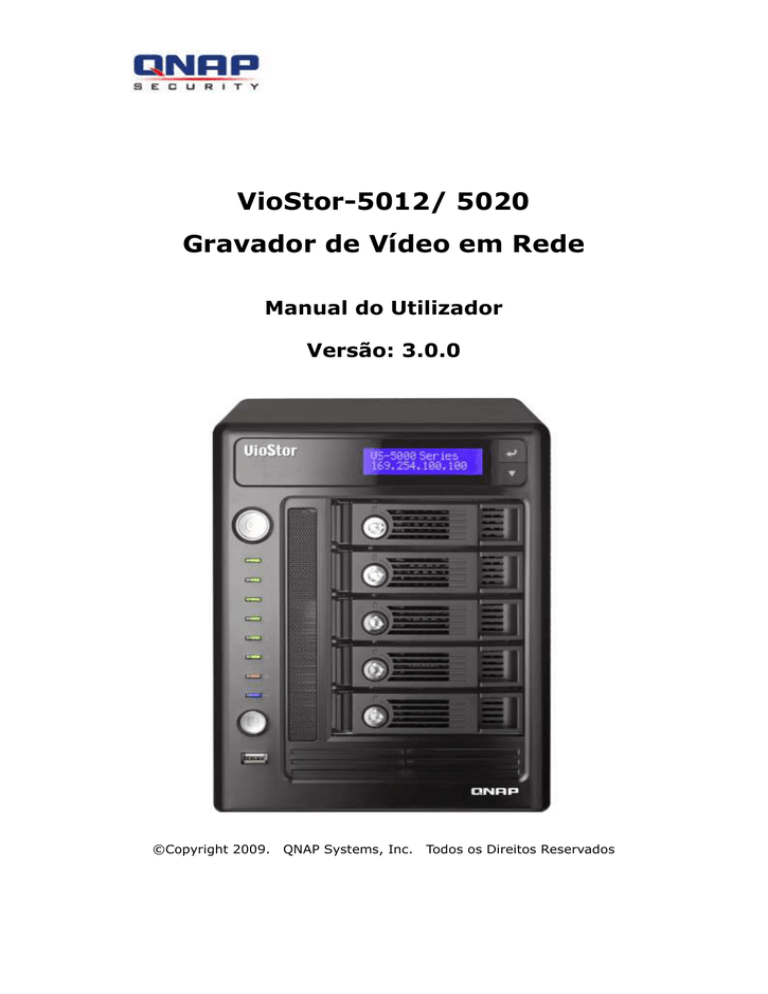 VioStor-5012/ 5020 Gravador de Vídeo em Rede Manual do Utilizador Versão: 3.0.0 ©Copyright 2009. QNAP Systems, Inc. Todos os Direitos Reservados PRÓLOGO Agradecemos-lhe por ter escolhido os produtos da QNAP! O presente manual do utilizador fornecer-lhe-á todas as instruções necessárias para uma devida utilização do produto adquirido. Aconselhamos-lhe a ler atentamente este manual para que possa desfrutar de todas as funções disponibilizadas por este produto! NOTA Todas as características, funcionalidades e demais especificações do produto estão sujeitas a alterações sem aviso prévio nem encargos. Todas as marcas e designações dos produtos referenciados são marcas registadas dos seus respectivos titulares. GARANTIA LIMITADA Em nenhum caso, a responsabilidade da QNAP Systems, Inc. (QNAP) excederá o preço pago pelo produto, relativo ao software directo, indirecto, especial, secundário ou resultante, ou da sua documentação. A QNAP declina qualquer garantia ou representação, expressa, implícita ou estatutária, no que diz respeito aos seus produtos ou conteúdos, bem como à utilização desta documentação e de todos os softwares em anexo, e, renuncia, especificamente, à sua qualidade, desempenho, comerciabilidade ou adequação para qualquer finalidade específica. A QNAP reserva-se o direito de reformular ou de actualizar os seus produtos, software ou documentação, sem que se verifique a obrigatoriedade de notificar previamente quaisquer indivíduos ou entidades. ATENÇÃO 1. Faça periodicamente uma cópia de segurança do seu sistema a fim de evitar quaisquer perdas eventuais de dados. A QNAP declina qualquer responsabilidade relativamente a todo o tipo de perda ou recuperação de dados. 2. Se proceder à devolução de quaisquer componentes da embalagem do produto para restituição ou manutenção, certifique-se de que estes estão cuidadosamente embalados para o seu transporte. Não se procederá a qualquer tipo de indemnização no caso de se verificar um acondicionamento inadequado. 2 Aviso Importante Instruções para leitura: Recomendamos-lhe que leia atentamente os avisos de segurança, bem como o manual do utilizador, antes de proceder à utilização deste produto. Fonte de alimentação: Este produto só poderá ser utilizado com a fonte de alimentação fornecida pelo fabricante. Assistência: Em caso de dúvidas de foro técnico, queira contactar os nossos técnicos qualificados. Não tente, em qualquer circunstância, reparar este produto a fim de evitar qualquer perigo de alta tensão e demais riscos causados pela abertura do tampo deste produto. Aviso: Para evitar a ocorrência de um incêndio ou de um choque eléctrico, não utilize este produto à chuva ou num ambiente húmido. Não coloque quaisquer objectos sobre este produto. 3 Índice ÍNDICE ................................................................................................................................................... 4 AVISOS DE SEGURANÇA ................................................................................................................... 7 CAPÍTULO 1. INTRODUÇÃO ...................................................................................................... 8 1.1 RESUMO .................................................................................................................................... 8 1.2 CONTEÚDOS DA EMBALAGEM ................................................................................................... 9 1.3 DESCRIÇÃO DO HARDWARE ..................................................................................................... 10 CAPÍTULO 2. INSTALAÇÃO DO VIOSTOR ............................................................................ 11 2.1 INSTALAÇÃO DO HARDWARE ................................................................................................... 13 2.2 CONFIGURAÇÃO DO SISTEMA .................................................................................................. 15 CAPÍTULO 3. INICIAR A UTILIZAÇÃO DO VIOSTOR ........................................................ 19 3.1 CONECTAR-SE AO VIOSTOR ..................................................................................................... 19 3.2 PÁGINA DE MONITORIZAÇÃO .................................................................................................. 21 3.2.1 Janela de vídeo em directo ............................................................................................. 25 3.2.2 Modo de Exibição ........................................................................................................... 27 3.2.3 Painel de Controlo da Câmara PTZ ............................................................................... 27 3.2.4 Monitorização Multi-Servidor ........................................................................................ 28 CAPÍTULO 4. REPRODUÇÃO DOS FICHEIROS DE VÍDEO ............................................... 29 4.1 UTILIZAR A INTERFACE DE REPRODUÇÃO DA WEB .................................................................. 29 4.2 ACEDER AOS DADOS DE GRAVAÇÃO ........................................................................................ 34 4.2.1 Comunidade da Rede Windows (SMB/CIFS) .................................................................. 35 4.2.2 Gestor de Ficheiros (HTTP) ........................................................................................... 35 4.2.3 Servidor FTP (FTP) ........................................................................................................ 36 CAPÍTULO 5. GESTÃO DO SISTEMA ...................................................................................... 37 5.1 CONFIGURAÇÃO RÁPIDA ......................................................................................................... 39 5.2 CONFIGURAÇÕES DO SISTEMA........................................