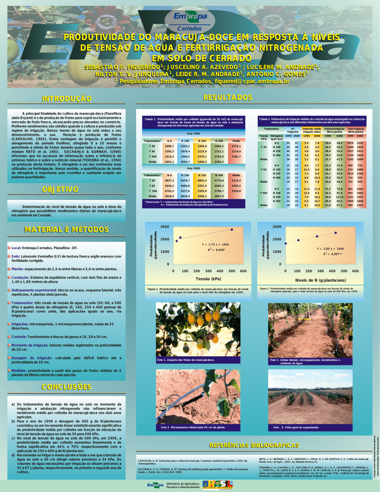 Cerrados PRODUTIVIDADE DO MARACUJÁ-DOCE EM RESPOSTA À NÍVEIS DE TENSÃO DE ÁGUA E FERTIRRIGAÇÃO NITROGENADA EM SOLO DE CERRADO 1 1 1 1 1 1 SEBASTIÃO F. FIGUERÊDO ; JUSCELINO A. AZEVEDO ; LUCILENE M. ANDRADE ; NILTON T. V. JUNQUEIRA11, LEIDE R. M. ANDRADE11, ANTÔNIO C. GOMES11 NILTON T. V. JUNQUEIRA , LEIDE R. M. ANDRADE , ANTÔNIO C. GOMES 1 Pesquisadores Embrapa Cerrados, [email protected] 1 RESULTADOS INTRODUÇÃO Determinação do nível de tensão de água no solo e dose de nitrogênio que possibilitem rendimentos ótimos do maracujá-doce em ambiente de Cerrado. MATERIAL E MÉTODOS Local: Embrapa Cerrados, Planaltina - DF. Solo: Latossolo Vermelho (LV) de textura franco argilo arenoso com fertilidade corrigida. Tratamentos Condução: Sistema de espaldeira vertical, com dois fios de arame a 1,40 e 1,80 metros de altura. Delineamento experimental: blocos ao acaso, esquema fatorial, três repetições, 4 plantas úteis/parcela. Nº irrigações Ano 1999 Tensão (kPa) Tratamentos* N0 N 100 N 250 N 400 Média T 30 2090,7 2352,2 2393,0 1864,5 2175,1 T 60 2302,2 1878,4 2125,9 2151,1 2114,4 T 500 1610,3 1966,5 2370,1 2784,0 2182,7 T 30 Nitrogênio 1999 2000 (g/pl./ano) Média 2001,1 2065,7 2296,3 N0 N 100 Volume/irrigação (litros/planta) Total irrigação (litros/planta) 1999 2000 1999 2000 1999 2000 35 31 5,5 7,8 30,8 40,4 1079 1252 N 100 35 39 5,5 4,9 36,8 49,4 1289 1928 N 250 40 37 5,0 5,6 38,9 52,0 1557 1923 N 400 33 33 5,0 6,1 36,5 49,9 1206 1648 36 35 5,2 6,1 35,7 47,9 1283 1688 N0 15 14 9,4 7,7 43,3 53,9 650 754 N 100 16 17 11,0 6,4 38,9 59,3 623 1008 N 250 23 22 7,4 6,6 44,1 62,0 1014 1364 N 400 20 13 8,6 10,5 35,9 50,4 719 655 19 17 9,1 7,8 40,6 56,4 752 945 N0 14 14 11,0 11,5 57,2 75,0 801 1050 N 100 19 19 12,0 9,5 50,2 87,4 954 1660 N 250 22 12 7,0 10,2 50,0 121,0 1101 1452 N 400 22 16 6,5 10,7 49,9 65,5 1099 1048 19 15 9,1 10,5 51,8 87,2 989 1302 2266,5 Ano 2000 Tratamentos* Intervalo médio irrigação (dias) N0 Média T 60 N 250 N 400 Média T 30 4837,3 5076,7 5802,4 4776,8 5123,3 T 60 4046,2 4086,8 5291,4 4000,3 4356,2 T 500 4763,2 5327,6 5395,8 5796,7 5320,8 Média 4548,9 4830,4 5496,5 4857,9 *Observação: T = tratamentos de tensão de água no solo (kPa); N = tratamentos de adubação nitrogenada (g de N/planta/ano) Média T 500 Média 3000 3000 2000 Y = 1,73 x + 1926 2 R = 0,938* 1000 0 Plantio: espaçamento de 2,5 m entre fileiras e 3,0 m entre plantas. Tabela 2. Parâmetros de irrigação obtidos do controle de água empregado na cultura do maracujá-doce nos diferentes tratamentos em dois anos agrícolas. Produtividade g/parcela/colheita OBJETIVO Tabela 1. Produtividade média por colheita (g/parcela de 30 m2) de maracujádoce em função de níveis de tensão da água no solo e adubação nitrogenada em dois anos agrícolas em solo de Cerrado. Produtividade g/parcela/colheita A principal finalidade do cultivo do maracujá-doce (Passiflora alata Dryand) é o da produção de frutos para suprir exclusivamente o mercado de fruta fresca, alcançando preços elevados no comércio. Melhores rendimentos são obtidos quando a cultura é produzida sob regime de irrigação. Baixos teores de água no solo reduz o seu desenvolvimento, a sua floração e produção de frutos (CARVALHO, 1965). Outra vantagem da irrigação é permitir o alongamento do período frutífero, atingindo 9 a 10 meses e permitindo a oferta de frutos durante quase todo o ano, conforme relatam NETO et al. 1983. GACHANJA & GURNAH, (1980) informam que há escassez de informação sobre a influência do estresse hídrico e sobre a nutrição mineral (TEIXEIRA et al., 1994) na produção desta fruteira. O nitrogênio é um dos nutrientes mais utilizados na fertirrigação. Nesse sentido, a quantificação de níveis de nitrogênio é importante pois constitui o nutriente exigido em maiores quantidades. 2000 Y = 2,89 x + 1640 1000 2 R = 0,997** 0 0 100 200 300 400 500 600 Tensão (kPa) Figura 1. Produtividade média por colheita de maracujá-doce em função de níveis de tensão de água no solo para o nível 400 de nitrogênio em 1999. 0 100 200 300 400 500 600 Níveis de N (g/planta/ano) Figura 2. Produtividade média por colheita de maracujá-doce em função de níveis de nitrogênio aplicado, para o fator tensão de água no solo de 500 kPa, em 1999. Tratamentos: três níveis de tensão de água no solo (30; 60; e 500 kPa) e quatro doses de nitrogênio (0, 100, 250 e 400 gramas de N/planta/ano) como uréia, dez aplicações iguais no ano, via irrigação. Irrigações: microaspersão, 1 microaspersor/planta, vazão de 35 litros/hora. Controle: Tensiômetros e blocos de gesso a 10, 20 e 30 cm, Momento de irrigação: leituras médias registradas na profundidade de 10 cm. Dosagem de irrigação: calculada pelo déficit hídrico até a profundidade de 35 cm. Foto 1. Aspecto dos frutos de maracujá-doce. Foto 2. Linhas laterais, microaspersores, tensiômetros e coletores de água. Medidas: produtividade a partir dos pesos de frutos obtidos de 4 plantas da fileira central de cada parcela. CONCLUSÕES Foto 3. Microaspersor distanciado 60 cm da planta. Foto 4. Vista geral do experimento. REFERÊNCIAS BIBLIOGRÁFICAS CARVALHO, A. M. Instruções para a cultura do maracujá. Campinas, Instituto Agronômico, 1965. 8p. (mimeografado). GACHANJA, S. P.; GURNAH, A. M. Pruning and trellising purple passionfruit. 1. Yields and seasonal trends. J. Hortic. Sci., 5:345-349. 1980. NETO, L. G.; BEZERRA, J. E. F.; ABRAMOF, L.; MELO, G. S. DE; DANTAS, F. A. Cultivo do maracujá. Recife. Secr. da Agric., 1983. 4p. (Boletim técnico, 9). TEIXEIRA, C. G.; CASTRO, J. V., TOCCHINI, R. P.; NISIDA, A. L. A. C.; HASHIZUME, T.; MEDINA, J. C.; TURATTI, J. M.; LEITE, R. S. S. F.; BLISKA, F. M. M.; GARCIA, A. E. B. Maracujá: cultura, matéria prima, processamento e aspectos econômicos. 2a. ed. rev. e ampl.: ITAL - Instituto de Tecnologia de Alimentos. Campinas, 1994. 267p.; (Série Frutas Tropicais, 9). Criação e Arte: Lei