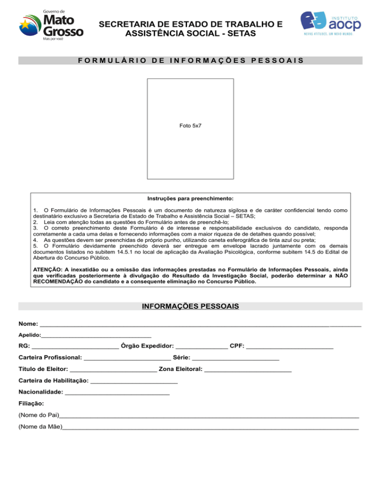 SECRETARIA DE ESTADO DE TRABALHO E ASSISTÊNCIA SOCIAL - SETAS FORMULÁRIO DE INFORMAÇÕES PESSOAIS Foto 5x7 Instruções para preenchimento: 1. O Formulário de Informações Pessoais é um documento de natureza sigilosa e de caráter confidencial tendo como destinatário exclusivo a Secretaria de Estado de Trabalho e Assistência Social – SETAS; 2. Leia com atenção todas as questões do Formulário antes de preenchê-lo; 3. O correto preenchimento deste Formulário é de interesse e responsabilidade exclusivos do candidato, responda corretamente a cada uma delas e fornecendo informações com a maior riqueza de de detalhes quando possível; 4. As questões devem ser preenchidas de próprio punho, utilizando caneta esferográfica de tinta azul ou preta; 5. O Formulário devidamente preenchido deverá ser entregue em envelope lacrado juntamente com os demais documentos listados no subitem 14.5.1 no local de aplicação da Avaliação Psicológica, conforme subitem 14.5 do Edital de Abertura do Concurso Público. ATENÇÃO: A inexatidão ou a omissão das informações prestadas no Formulário de Informações Pessoais, ainda que verificadas posteriormente à divulgação do Resultado da Investigação Social, poderão determinar a NÃO RECOMENDAÇÃO do candidato e a consequente eliminação no Concurso Público. INFORMAÇÕES PESSOAIS Nome: ___________________________________________________________________________________ __________ Apelido:___________________________________ RG: _________________________ Órgão Expedidor: _______________ CPF: _________________________ Carteira Profissional: _________________________ Série: _________________________ Título de Eleitor: _________________________ Zona Eleitoral: _________________________ Carteira de Habilitação: _________________________ Nacionalidade: ______________________________ Filiação: (Nome do Pai)______________________________________________________________________________________ (Nome da Mãe)_____________________________________________________________________________________ INFORMAÇÕES RESIDENCIAIS Endereço: _____________________________________________________________________________ Nº __________ Bairro: ______________________________ Complemento: ______________________________ Cep: _____________-_______ Cidade: ________________________________________ UF: _______ Telefone Residencial: (_____)__________________ Celular: (_____)__________________ Com quem reside? _________________________________________________________________________________ A quanto tempo reside no imóvel? ________________________________________ Situação do Imóvel (alugado, próprio, etc.): ________________________________________ Declarar em ordem cronológica decrescente, os lugares onde residiu nos últimos 5 (cinco) anos: Endereço 1: _____________________________________________________________________________________ Nº __________ Bairro: ______________________________ Complemento: ______________________________ Cep: _____________-_______ Cidade: ________________________________________ UF: _______ Com quem residiu? _______________________________________________________________________________ Quanto tempo residiu no imóvel? ________________________________________ Endereço 2: _____________________________________________________________________________________ Nº __________ Bairro: ______________________________ Complemento: ______________________________ Cep: _____________-_______ Cidade: ________________________________________ UF: _______ Com quem residiu? _______________________________________________________________________________ Quanto tempo residiu no imóvel? ________________________________________ Endereço 3: _____________________________________________________________________________________ Nº __________ Bairro: ______________________________ Complemento: ______________________________ Cep: _____________-_______ Cidade: ________________________________________ UF: _______ Com quem residiu? _______________________________________________________________________________ Quanto tempo residiu no imóvel? ________________________________________ INFORMAÇÕES FAMILIARES Qual seu estado civil: ( ) Solteiro (a) ( ) Casado (a) ( ) Viúvo (a) ( ) Convivente Você tem filhos? ( ) Sim ( ) Não Quantos? ___________ Relacione abaixo todos os seus filhos (caso tenha), especificando a Situação da Criança (Filho Legítimo, Legitimado, Adotivo, Enteado). Nome do Filho: _________________________________________________________________________________ Endereço de onde reside: __________________________________________________________________________ Nº __________ Bairro: ______________________________ Complemento: ______________________________ Cep: _____________-_______ Cidade: ________________________________________ UF: _______ Com quem reside? _______________________________________________________________________________ Qual a situação da criança?___________________________ Data de Nascimento: _____/_____/_________ Nome do Filho: _________________________________________________________________________________ Endereço de onde reside: __________________________________________________________________________ Nº __________ Bairro: ______________________________ Complemento: ______________________________ Cep: _____________-_______ Cidade: ________________________________________ UF: _______ Com quem reside? _______________________________________________________________________________ Qual a situação da criança?___________________________ Data de Nascimento: _____/_____/_________ Nome do Filho: _________________________________________________________________________________ Endereço de onde reside: __________________________________________________________________________ Nº __________ Bairro: ______________________________ Complemento: ______________________________ Cep: _____________-_______ Cidade