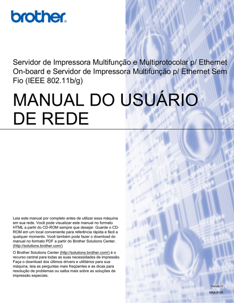 Servidor de Impressora Multifunção e Multiprotocolar p/ Ethernet On-board e Servidor de Impressora Multifunção p/ Ethernet Sem Fio (IEEE 802.11b/g) MANUAL DO USUÁRIO DE REDE Leia este manual por completo antes de utilizar essa máquina em sua rede. Você pode visualizar este manual no formato HTML a partir do CD-ROM sempre que desejar. Guarde o CDROM em um local conveniente para referência rápida e fácil a qualquer momento. Você também pode fazer o download do manual no formato PDF a partir do Brother Solutions Center. (http://solutions.brother.com/) O Brother Solutions Center (http://solutions.brother.com/) é o recurso central para todas as suas necessidades de impressão. Faça o download dos últimos drivers e utilitários para sua máquina, leia as perguntas mais freqüentes e as dicas para resolução de problemas ou saiba mais sobre as soluções de impressão especiais. Versão 0 BRA-POR Definições de observações Utilizamos o seguinte ícone ao longo deste Manual do Usuário: As observações lhe dizem como você deverá reagir a uma situação que possa surgir ou fornecem dicas sobre como a operação interage com outros recursos. Marcas comerciais O logotipo da Brother é marca comercial registrada da Brother Industries, Ltd. Brother é marca comercial registrada da Brother Industries, Ltd. Microsoft, Windows, Windows Server e Internet Explorer são marcas comerciais registradas da Microsoft Corporation nos Estados Unidos e/ou em outros países. Windows Vista é uma marca comercial ou marca registrada da Microsoft Corporation nos Estados Unidos e outros países. Apple, Macintosh, Safari e TrueType são marcas comerciais da Apple Inc., registradas nos Estados Unidos e em outros países. HP, Hewlett-Packard, Jetdirect e PCL são marcas registradas da Hewlett-Packard Company. Linux é marca comercial registrada da Linus Torvalds nos EUA e em outros países. UNIX é marca comercial registrada do The Open Group nos Estados Unidos e em outros países. PostScript é marca comercial registrada e PostScript 3 é marca registrada da Adobe Systems Incorporated. Firefox é marca comercial ou marca comercial registrada da Mozilla Foundation. BROADCOM, SecureEasySetup e o logotipo da SecureEasySetup são marcas comerciais ou marcas comerciais registradas da Broadcom Corporation nos Estados Unidos e/ou em outros países. Wi-Fi, WPA, WPA2 e Wi-Fi Protected Setup são marcas comerciais ou marcas comerciais registradas da WiFi Alliance nos Estados Unidos e/ou em outros países. AOSS é uma marca registrada da Buffalo Inc. Cisco é marca comercial registrada da Cisco Systems, Inc. nos Estados Unidos e/ou em outros países. OpenLDAP é marca registrada da OpenLDAP Foundation. Cada empresa cujo título do software é mencionado neste manual possui um Contrato de Licença do Software específico a seus programas proprietários. Todas as outras marcas comerciais registradas são de propriedade de seus respectivos titulares. i Aviso de publicação e compilação Este manual foi compilado e publicado sob a supervisão da Brother Industries Ltd., abrangendo as últimas especificações e descrições do produto. O conteúdo deste manual e as especificações deste produto estão sujeitos a alterações sem aviso prévio. A Brother reserva o direito de fazer alterações sem aviso prévio nas especificações e nos materiais aqui contidos e não se responsabilizará por qualquer dano (incluindo danos indiretos) causados pela confiança nos materiais apresentados, incluindo dentre outros, erros tipográficos e outros erros relativos à publicação. ©2008 Brother Industries Ltd. NOTA IMPORTANTE Este produto é aprovado para uso somente no país de compra. Não use este produto fora do país de compra, pois ele pode violar os regulamentos de energia e telecomunicação sem fios daquele país. Neste documento, Windows® XP representa o Windows® XP Professional, Windows® XP Professional x64 Edition e Windows® XP Home Edition. Neste documento, Windows Server® 2003 representa o Windows Server® 2003 e o Windows Server® 2003 x64 Edition. Windows Vista® neste documento representa todas as edições do Windows Vista®. As ilustrações da máquina baseiam-se no modelo MFC-8890DW. Nem todos os modelos encontram-se disponíveis em todos os países. ii Números da Brother IMPORTANTE Para assistência técnica e operacional, você deverá ligar para o número correspondente no país onde adquiriu a máquina. As chamadas deverão ser feitas de dentro desse país. Para atendimento ao cliente Nos EUA 1-877-BROTHER (1-877-276-8437) No Canadá 1-877-BROTHER No Brasil [email protected] Na Europa Visite http://www.brother.com/ para obter informações de contato no seu escritório Brother local. Localização de centros de serviços (EUA) Para saber a localização de um centro de serviços autorizado Brother, ligue para 1-877-BROTHER (1877-276-8437). Localização de centros de serviço (Canadá) Para saber a localização de um centro de serviços autorizado Brother, ligue para 1-877-BROTHER. Caso tenha algum comentário ou sugestão, escreva-nos para: Nos EUA Suporte ao cliente Brother International Corporation 100 Somerset Corporate Boulevard Bridgewater NJ 08807-0911 No Canadá Brother International Corporation (Canada), Ltd. - Marketing Dept. 1 Hôtel de Ville Dollard des Ormeaux, QC H9B 3H6 Canada No Brasil Brother International Corporation do Brasil Ltda. Av. Paulista, 854 - 15 and. - Ed. Top Center CEP: 01310-100 - São Paulo - SP - Brasil Na Europa European Product & Service Support 1 Tame Street Audenshaw Manchester, M34 5JE, UK iii Endereço na Internet Site Global da Brother: http://www.brother.com/ Para informar-se sobre as perguntas mais freqüentes (FAQs), suporte ao produto, atualizações do driver e utilitários: http://solutions.brother.com/ Realizando pedidos de acessórios e suprimentos Nos EUA: 1-877-552-MALL (1-877-552-6255) 1-800-947-1445 (fax) http://www.brothermall.com/ No Ca