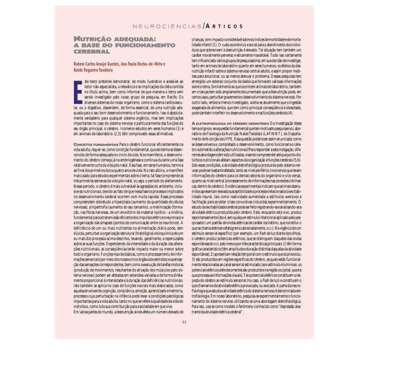 NEUROCIÊNCIAS NUTRIÇÃO ADEQUADA: A BASE DO FUNCIONAMENTO CEREBRAL Rubem Carlos Araújo Guedes, Ana Paula Rocha-de-Melo e Naíde Regueira Teodósio ste texto pretende demonstrar, de modo ilustrativo e acessível ao leitor não-especialista, a relevância e as implicações da idéia contida no título acima, bem como informar de que maneira o tema vem sendo investigado pelo nosso grupo de pesquisa, em Recife. Os diversos sistemas do nosso organismo, como o sistema cardiovascular, ou o digestivo, dependem, de forma essencial, de uma nutrição adequada para o seu bom desenvolvimento e funcionamento. Isso é absolutamente verdadeiro para qualquer sistema orgânico, mas tem implicações importantes no caso do sistema nervoso e particularmente das funções do seu órgão principal, o cérebro. Inúmeros estudos em seres humanos (1) e em animais de laboratório (2,3) têm comprovado essas afirmativas. E CONCEITOS FUNDAMENTAIS Para o cérebro funcionar eficientemente na vida adulta, requer-se, como condição fundamental, que ele tenha se desenvolvido de forma adequada no início da vida. Nos mamíferos, o desenvolvimento do cérebro começa já na embriogênese e continua durante uma fase relativamente curta da vida pós-natal. Essa fase, em seres humanos, termina ao final dos primeiros dois a quatro anos de vida. No rato albino, o mamífero mais usado para estudos experimentais sobre o tema, tal fase compreende as três primeiras semanas da vida pós-natal, ou seja, o período do aleitamento. Nesse período, o cérebro é mais vulnerável às agressões do ambiente, inclusive às nutricionais, devido ao fato de que nessa fase os processos implicados no desenvolvimento cerebral ocorrem com muita rapidez. Esses processos compreendem sobretudo a hiperplasia (aumento da quantidade de células nervosas), a hipertrofia (aumento do seu tamanho), a mielinização (formação, nas fibras nervosas, de um envoltório de material lipídico - a mielina, fundamental para a transmissão eficiente dos impulsos elétricos neuronais) e a organização das sinapses (pontos de comunicação entre os neurônios). A deficiência de um ou mais nutrientes na alimentação diária pode, sem dúvida, perturbar a organização estrutural (histológica) e bioquímica de um ou mais dos processos acima descritos, levando, geralmente, a repercussões sobre as suas funções. Dependendo da intensidade e da duração das alterações nutricionais, as conseqüências terão impacto maior ou menor sobre todo o organismo. Funções neurais básicas, como o processamento de informações sensoriais (por meio dos nossos cinco órgãos dos sentidos) e a percepção das sensações correspondentes, bem como a execução de tarefas motoras (produção de movimentos, resultantes da ativação dos músculos pelo sistema nervoso) podem ser afetadas em extensões variadas e de forma diretamente proporcional à intensidade e à duração das deficiências nutricionais. Isto também se aplica no caso de funções neurais mais elaboradas, como aquelas envolvendo cognição, consciência, emoção, aprendizado e memória, processos cuja perturbação na infância pode levar a condições patológicas importantes para a vida adulta, tanto no que se refere à qualidade da vida do indivíduo, como à da sua contribuição para a sociedade em que vive. Em várias partes do mundo, a desnutrição ainda afeta um número elevado de 32 /A R T I G O S crianças, com impacto considerável sobre os índices de morbidade e de mortalidade infantil (1). O custo econômico e social para o atendimento dos indivíduos que sobrevivem à desnutrição é elevado. Tal situação tem também um caráter moralmente perverso e eticamente inaceitável. Tudo isso certamente tem influenciado vários grupos de pesquisadores, em sua decisão de investigar, tanto em animais de laboratório quanto em seres humanos, os efeitos da desnutrição infantil sobre o sistema nervoso central adulto, e assim propor medidas para solucionar, ou ao menos atenuar o problema. Dessas pesquisas tem emergido um extenso conjunto de dados que fornecem valiosas informações sobre o tema. Similarmente ao que ocorre em animais de laboratório, também em crianças tem sido amplamente documentado que a desnutrição pode, em certos casos, perturbar gravemente o desenvolvimento do sistema nervoso. Por outro lado, embora menos investigado, aceita-se atualmente que a ingestão exagerada de alimentos, que tem como principal conseqüência à obesidade, pode também interferir no desenvolvimento e nas funções cerebrais (4). A ELETROFISIOLOGIA DO CÉREBRO DESNUTRIDO Da investigação desse tema originou-se a questão fundamental que tem motivado pesquisas no Laboratório de Fisiologia da Nutrição Naíde Teodósio (LAFINNT), do Departamento de Nutrição da UFPE. Essa questão poderia ser assim enunciada: como se desenvolveria e, completado o desenvolvimento, como funcionaria o cérebro submetido a alterações nutricionais? Para responder a esta indagação, diferentes abordagens têm sido utilizadas, visando compreender até que ponto distúrbios nutricionais afetam aspectos da organização e funções cerebrais (5,6). Sob essas condições, a atividade eletrofisiológica produzida pelo sistema nervoso pode ser bastante afetada, tanto ao nível periférico (nos nervos que levam informações do cérebro para os demais setores do organismo e vice-versa), quanto ao nível central (processamento de informações nas conexões intrínsecas, dentro do cérebro). Evidências experimentais indicam que animais desnutridos apresentam elevada susceptibilidade a processos relacionados à excitabilidade neural, tais como reatividade aumentada a estímulos aversivos e facilitação para se obter crises convulsivas induzidas experimentalmente. O estudo da excitabilidade cerebral pode ser feito registrando-se e analisando-se a atividade elétrica produzida pelo cérebro. Este, enquanto está vivo, prod