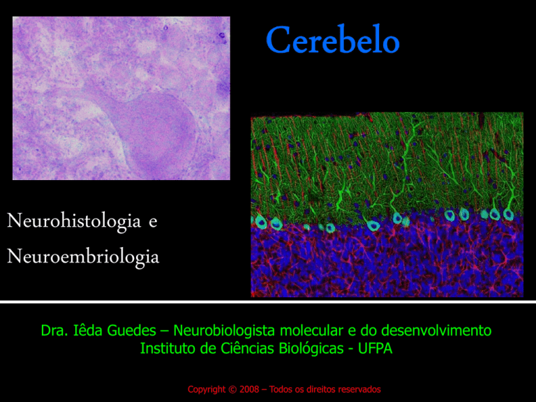 Neurohistologia e Neuroembriologia Dra. Iêda Guedes – Neurobiologista molecular e do desenvolvimento Instituto de Ciências Biológicas - UFPA Copyright © 2008 – Todos os direitos reservados Cerebelo Subdivisão correspondente Vestíbulocerebelo - Arquicerebelo – ajuda coordenar equilíbrio/postura e os movimentos oculares Espinocerebelo - Paleocerebelo ajuda a coordenar - movimento estereotipado (locomoção/reações posturais) e o tônus muscular. Cerebrocerebelo - Neocerebelo ajuda a coordenar -programação de movimentos dos membros movimentos não estereotipados ensinamentos e treinamentos. 14/03/2016 2 Cerebelo Centro para controle dos movimentos iniciados pelo córtex motor Subdivididos em direito e esquerdo cada lado fica responsável pelo controle dos movimentos do lado direito ou esquerdo do corpo respectivamente. Cerebelo planejamento e execução dos movimentos: 14/03/2016 3 Cerebelo • Via corticocerebelar principal fonte de aferências núcleos pontinos - cerebelo • Vias espino e vestibulocerebelares -labirinto do ouvido, fusos musculares, mecanorreceptores - posição e movimento do corpo. 14/03/2016 4 Cerebelo A via de saída é através dos núcleos cerebelares profundos; e entrada no córtex cerebelar. 14/03/2016 5 Cerebelo Ajustes PosturaisCoordenação do Movimento 14/03/2016 6 Cerebelo Cerebelo planejamento e execução dos movimentos: 14/03/2016 7 Cerebelo 14/03/2016 8 Cerebelo Três camada - molecular, Purkinje e granular Estreladas Cesto (basket) Granulares Golgi Escova unipolar 14/03/2016 9 Cerebelo Organização modular – dois planos perpendiculares: Dendritos PC e fibras trepadeiras- sagitalmente; Axônios células granulares (fibras paralelas) e fibras musgosas –tranversal 14/03/2016 10 Cerebelo Conexões excitatórias e inibitórias no córtex cerebelar e núcleos cerebelares profundos PC e neurônios dos núcleos profundos – recebem input excitatório das fibras trepadeiras e musgosas Input convergente adicional interneurônios locais (basket, Golgi, estrelado) - movemento e feedback derivado Outputs PC –neurônios dos núcleo profundos cerebelar – gera sinal de correção de erro 14/03/2016 11 Cerebelo Saliências - lábio rômbico projetam-se interior do Quarto Ventrículo aumentam de Tamanho fundem-se na linha média ultrapassam metade rostral do quarto ventrículo sobrepõem-se - ponte/ bulbo • Quinta a sexta semana 14/03/2016 12 Cerebelo 14/03/2016 13 Cerebelo Neuroblastos Alares (partes dorsais) Córtex Cerebelar Núcleos Cerebelares 14/03/2016 14 Cerebelo 14/03/2016 15 Cerebelo 14/03/2016 16 Cerebelo 14/03/2016 17 Cerebelo EGL ML ML PL PL GL P3 EGL: Camada germinativa externa ML: Camada molecular PL: Camada de células de Purkinje GL: Camada de células granulares 14/03/2016 P10 P20 18 Cerebelo Um grupo migra - zona ventricular - direção radial – formar camada PC; Outro grupo – migra ao longo da superfície pial – matriz germinativa secundária – camada germinativa (granular ) externa; Capacidade divisão muitas das células filhas – camada granular interna 14/03/2016 Células Neuroepiteliais 19 Cerebelo Células – camada granular externa - desenvolvem processos axonais orientados tangencialmente; 1. Desenvolvem processos radiais – ao longo do qual corpo celular migra para camada granular interna; 2. Durante a migração processo perpendicular – axônio T-shape (Heimer, 1995). 14/03/2016 20 Cerebelo 1. Neurônios granulares – vários passos – red 2. Precursores superfície externa – proliferação rápida - fibras paralelas 3. Após extensão neurito – corpo célula – polarizada e atracado - glia Bergmann - substrato migração – camada molecular 4. dendritos. 14/03/2016 21 Cerebelo 14/03/2016 22 Cerebelo Proliferação: -Shh via: Patched (Ptc1), Smoothened (Smo)/ Gli – divisão neuroblasto. -Notch 2 via - Jagged1, E(spl), and Hes1. In addition, the D2 cyclin and PP2A phosphatase transcripts - proliferação -Neurônios específicos - Math1 gene neurônio granular Como a célula inicia extensão neuritos: downregulate Math1 NeuroD. -TAG1 glycoprotein - tuj1 – tubulina - Astrotactin (Astn) – molécula adesão neurônio-glia. 14/03/2016 23 Cerebelo 14/03/2016 24 Cerebelo A Lamelipódios B Filopódios Filopódios Cone Cone Axônio Axônio © CEM BILH ÕES DE NEURÔNIOS by Roberto Lent 14/03/2016 25 Cerebelo 14/03/2016 26 Cerebelo Fatores que influenciam no Direcionamento e Estabelecimento Neuronal 14/03/2016 27 Cerebelo Fatores que influenciam no Direcionamento e Estabelecimento Neuronal 14/03/2016 28 Cerebelo 14/03/2016 29 Cerebelo 14/03/2016 30