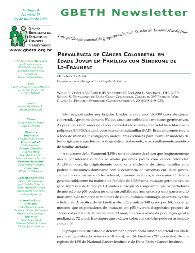 Volume 4 Número 17 25 de junho de 2006 GBETH Newsletter de Tumores Hereditários de Estudos o r i e l i s Uma o Bra publicação semanal do Grup www.gbeth.org.br GBETH Newsletter é uma publicação semanal distribuída aos sócios do Grupo Brasileiro de Estudos de Tumores Hereditários. Sede R José Getúlio, 579 cjs 42/43 Aclimação São Paulo - SP CEP 01503-001 E-mail [email protected] [email protected] Prevalência de Câncer Colorretal em Idade Jovem em Famílias com Síndrome Li-Fraumeni de Maria Isabel W Achatz Departamento de Oncogenética - Hospital do Câncer Wong P, Verselis SJ, Garber JE, Schneider K, Digianni L, Stockwell DH, Li FP, Syngal S. Prevalence of Early Onset Colorectal Cancer in 397 Patients With Classic Li–Fraumeni Syndrome. Gastroenterology 2003;348:919–932. São diagnosticados nos Estados Unidos, a cada ano, 150.000 casos de câncer Editor Erika Maria M Santos Ligia P Oliveira Diretoria Presidente Benedito Mauro Rossi Vice-Presidente Gilles Landman Diretor Científico André Vettore Secretário Geral Fábio de Oliveira Ferreira Primeira Secretária Erika Maria M Santos Tesoureiro Wilson T Nakagawa Conselho Científico Beatriz de Camargo José Claúdio C Rocha Maria Aparecida Nagai Maria Isabel W Achatz Samuel Aguiar Jr Conselho Fiscal Titulares André Lopes Carvalho Gustavo Cardoso Guimarães Stênio de Cássio Zequi Suplentes Fábio José Hadad Mariana Morais C Tiossi Milena J S F L Santos colorretal. Aproximadamente 5% dos casos são atribuídos a mutações germinativas. As principais síndromes de câncer colorretal são o câncer colorretal hereditário sem polipose (HNPCC), e a polipose adenomatosafamiliar (FAP). Estas síndromes foram o foco de intensas investigações moleculares e clínicas para formular modelos de tumorigênese e aperfeiçoar o diagnóstico, tratamento, e aconselhamento genético de famílias afetadas. A síndrome de Li-Fraumeni (LFS) é uma síndrome de câncer que freqüentemente não é considerada quando se avalia pacientes jovens com câncer colorretal. A LFS foi descrita originalmente como uma síndrome de câncer familiar com padrão autossômico-dominante com a ocorrência de sarcomas em idade jovem, carcinomas da mama e córtex adrenal, tumores cerebrais, e leucemias. O defeito genético subjacente na maioria de famílias de LFS é uma mutação germinativa no gene supressor de tumor p53. Estudos subseqüentes sugeriram que os portadores de mutação no p53 podem ter uma suscetibilidade aumentada a uma gama muito mais ampla de tumores: carcinomas do cólon, pulmão, estômago, pâncreas, ovário, e linfomas. A análise de 45 famílias de LFS e outros 140 casos por Nichols et al mostrou que os portadores de mutação em p53 tiveram diagnóstico precoce de câncer colorretal (idade mediana de 33 anos; inferior a idade da população geral – mediana de 72 anos). Isto sugere que o câncer colorretal também pode ser associado com a LFS. O propósito deste estudo é determinar a prevalência câncer colorretal em idade jovem (diagnosticado antes dos 50 anos), em 64 famílias (397 pacientes) de um registro de LFS do National Cancer Institute e do Dana-Farber Cancer Institute. Prevalência de Câncer Colorretal em Idade Jovem em Famílias com Síndrome de Li-Fraumeni foram analisadas em dois pacientes, quatro familiares Métodos Foram selecionados pacientes de um de LFS do National Cancer Institute/ Dana-Farber Cancer Institute compilado durante várias décadas (1960– 2000). Este registro consistiu em 397 pacientes com câncer de 64 famílias que preenchiam os critérios de primeiro grau e três familiares de segundo grau. Como dois pacientes pertenciam a mesma família, as oito famílias estudadas corresponderam a 12,5% de famílias do registro (8 de 64). As mutações em sete dos nove pacientes foram encontradas no domínio de ligação ao DNA, clássicos para LFS.. O critério clássico para LFS descrito pelo Li e Fraumeni incluem: um probando diagnosticado com sarcoma antes dos 45 anos; mais um familiar de primeiro grau com câncer antes dos 45 anos; e um familiar de segundo-grau com qualquer câncer antes dos 45 anos, ou sarcoma diagnosticado em qualquer entre os aminoácidos 102 e 292, região na qual é encontrada a maioria das mutações. Dois pacientes apresentaram mutação fora dessa região, no Exon 10. Foram detectadas cinco mutações missense (55,6%), três nonsense (33,3%) e uma deleção (11,1%). Esta investigação sugere a hipótese que os pacientes de LFS podem ter uma suscetibilidade idade. Deste banco de dados foram selecionados os pacientes com câncer colorretal cujos diagnósticos foram realizados antes dos 50 anos. Foi realizado sequenciamento do gene p53 do paciente com câncer familiar, ou de familiares de primeiro ou segundo aumentada a câncer colorretal e podem apresentar este tumor mais precoce do que a população geral. Das 64 famílias de LFS clássicas analisadas, 10 (15.6%) tiveram um familiar com câncer colorretal. Estes resultados são consistentes com relatos prévios, nos quais a idade mediana de diagnóstico graus. em uma população de pacientes de LFS variou entre 33 a 45 anos. Resultados Dos 397 pacientes em 64 famílias com LFS clássico, 16 pacientes (4%) de 15 famílias diferentes (23.4%) tiveram câncer colorretal. Cinco pacientes que desenvolveram tumores depois de 50 anos foram excluídos de análises adicionais porque estes tumores podem representar tumores esporádicos. Destes 5 pacientes, apenas um era de uma família com uma mutação em p53 identificada Relatórios patológicos de oito pacientes estavam disponíveis, e a maioria dos tumores eram moderadamente ou bem diferenciados (75%) e 50% apresentavam metástase ao diagnóstico. O cólon distal foi a localização mais comum (6 pacientes). Todos os tumores eram adenocarcinomas invasivos. A análise de mutação em p53 foi realizada em nove dos 11 pacientes, dada a possibilidade de obtenção de amostras de sangue.