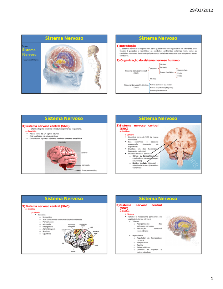 29/03/2012 Sistema Nervoso Sistema Nervoso 1)Introdução Tema: O sistema nervoso é responsável pelo ajustamento do organismo ao ambiente. Sua função é perceber e identificar as condições ambientais externas, bem como as condições reinantes dentro do próprio corpo e elaborar respostas que adaptem a essas condições. Sistema Nervoso Marcos Vinícius 2) Organização do sistema nervoso humano Cérebro Encéfalo Cerebelo Mesencéfalo Sistema Nervoso Central (SNC) Tronco Encefálico Ponte Bulbo Medula Sistema Nervoso Periférico (SNP) Nervos cranianos (12 pares) Nervos raquidianos (31 pares) Terminações nervosas Sistema Nervoso 3)Sistema nervoso central (SNC) 3)Sistema nervoso central (SNC) É formado pelo encéfalo e medula espinhal ou raquidiana. a) Encéfalo Sistema Nervoso a) Encéfalo Possui cerca de 1,4 kg nos adultos Está localizado na caixa craniana Dividido em 3 partes: cérebro, cerebelo e tronco encefálico Encéfalo cérebro cerebelo I) Cérebro Constitui cerca de 90% da massa encefálica Sua superfície é bastante pregueada (aumento da superfície) Dividido em dois hemisférios (esquerdo e direito) Dividido em duas partes: o Córtex ou Cortical (externo) – substância cinzenta (corpos neuronais) o Região medular (interna) – substância branca (dendritos e axônios) Tronco encefálico Sistema Nervoso 3)Sistema nervoso central (SNC) a) Encéfalo I) Cérebro Funções: o Sensações o Atos conscientes e voluntários (movimentos) o Pensamento o Memória o Inteligência o Aprendizagem o Sentidos o Equilíbrio Sistema Nervoso 3)Sistema (SNC) nervoso central a) Encéfalo I) Cérebro Tálamo e Hipotálamo (presentes na região inferior do cérebro) Tálamo o Reorganização dos estímulos nervosos o Percepção sensorial (consciência) Hipotálamo o Regulador da homeostase corporal o Temperatura o Apetite o Balanço hídrico o Controle da hipófise e outras glândulas 1 29/03/2012 Sistema Nervoso 3)Sistema nervoso central (SNC) I) Cérebro Tálamo e Hipotálamo Sistema Nervoso 3)Sistema nervoso central (SNC) III) Tronco encefálico 3 divisões: Mesencéfalo Ponte Bulbo Sistema Nervoso 3)Sistema nervoso central (SNC) III) Tronco encefálico Ponte o Manutenção da postura corporal, equilíbrio do corpo e tônus muscular. Sistema Nervoso 3)Sistema nervoso central (SNC) II) Cerebelo Responsável pelo equilíbrio do corpo Tônus e vigor muscular Orientação espacial Coordenação dos movimentos Sistema Nervoso 3)Sistema nervoso central (SNC) III) Tronco encefálico Mesencéfalo o Recepção e coordenação da contração muscular o Postura corporal Sistema Nervoso 3)Sistema nervoso central (SNC) III) Tronco encefálico Bulbo o Controle dos batimentos cardíacos o Controle dos movimentos respiratórios o Controle da deglutição (engolir) 2 29/03/2012 Sistema Nervoso 3)Sistema (SNC) nervoso Sistema Nervoso central 3)Sistema nervoso central (SNC) b) Medula Espinhal (raque) Funções da medula b) Medula Espinhal (raque) Cordão cilíndrico que parte da base do encéfalo e percorre toda a coluna vertebral. Aloja-se dentro das perfurações das vértebras. Da medula espinhal partem 31 pares de nervos raquidianos A medula, também apresenta duas regiões: a cortical, formada pela massa branca e a medular, pela massa cinzenta. Na medula, as fibras sensitivas chegam na região posterior, e as motoras saem da região anterior. o Recebe as informações de diversas partes do corpo e as enviam para o encéfalo e vice-versa. o Responsável pelos atos reflexos (reflexo medular). Sistema Nervoso Sistema Nervoso 3)Sistema nervoso central (SNC) 3)Sistema nervoso central (SNC) c) Meninges c) Meninges São três delicadas membranas que revestem e protegem o sistema nervoso central (SNC). - a mais externa, grossa e fibrosa - tem uma vascularização que lembra uma teia de aranha - a mais interna, delgada e aderente ao SNC Medula espinhal Encéfalo Tecido Nervoso 4) Células do tecido Nervoso Tecido Nervoso I) Neurônios Células especializadas na condução de impulsos nervosos Apresentam três componentes principais: O tecido nervoso é constituído por dois componentes principais: Dendritos: Prolongamentos ramificados do neurônio, especializados na recepção de estímulos provenientes de outros neurônios ou de células sensoriais. I) II) Corpo celular: Região onde se localiza o núcleo e a maioria das estruturas citoplasmáticas. É a região metabolicamente ativa da célula. Axônios: Prolongamento único e alongado. Transmite os impulsos nervosos provinientes dos dendritos para outras células (nervosas, musculares, glandulares). 3 29/03/2012 Tecido Nervoso I) Neurônios Tecido Nervoso I) Neurônios Fibras nervosas São representadas pelos prolongamentos do neurônio: Figura mostrando axônio revestido por oligodendrócitos (formando bainha de mielina) I) Dendritos II) Axônios Os axônios encontram-se revestidos por dobras únicas ou múltiplas formadas por células envoltória, denominadas: células de Schwann nas fibras nervosas periféricas e oligodendrócitos no sistema nervoso central. O conjunto desse material envoltório denomina-se: bainha de mielina. Axônio revestido por células de Schwann Formando a bainha de mielina. Tecido Nervoso Tecido Nervoso I) Neurônios I) Neurônios Funções da bainha de mielina Classificação dos neurônios quanto ao tamanho e forma de seus prolongamentos o Atua como isolante elétrico. o Aumenta a velocidade de propagação do impulso nervoso ao longo do axônio. Obs.: Na doença degenerativa esclerose múltipla, ocorre a degeneração gradual da bainha de mielina (desmielização), resultando na perda progressiva de coordenação nervosa. a) Neurônios multipolares: possuem mais de dois prolongamentos. b) Neurônios bipolares: possuem um dendrito e um axônio. c) Neurônios pseudo-unipolares: possuem um único prolongamento próximo ao corpo celular, mas este logo se divide em dois, dirigindo-se um ramo para a periferia e outro para o S.