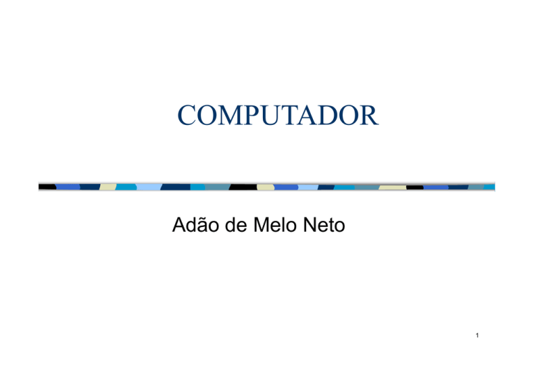 COMPUTADOR Adão de Melo Neto 1 INTRODUÇÃO PROGRAMA – É um conjunto de instruções LINGUAGEM BINÁRIA – Os caracteres inteligíveis não são A, B, +, 0, etc., mas apenas zero(0) e um (1). – É uma linguagem de comunicação dos computadores. – É denominada linguagem de máquina – É de difícil manipulação EVOLUÇÃO DOS COMPUTADORES (segundo elementos de sua organização) – válvulas, transistores, circuito integrado, pastilhas (chips) de alta e muito alta integração. 2 Modelo de Von Newman INTRODUZIU O CONCEITO DE MEMÓRIA: – É um dispositivo de armazenamento temporário onde programas (e dados) podem ser carregados a partir de uma unidade de entrada, para serem executados pela unidade aritmética e lógica, com os resultados sendo transferidos da memória para uma unidade de saída, tudo isso sob a coordenação de uma unidade de controle. – Ela garantiu a flexibilidade (o computador tem seu funcionamento alterado de acordo com programa e dado carregado) 3 Modelo de Von Newman Propôs a NUMERAÇÃO BINÁRIA – Economiza tempo nas operações – Garante a simplicidade dos circuitos Propôs o conceito RELÓGIO DO COMPUTADOR – Dispositivo que produz um sinal elétrico periódico para cadenciar todas as operações do computador . 4 Modelo Barramento de Sistema É uma evolução do Modelo de Von Newman Processador = UCP = unidade de controle + unidade lógica aritmética Memória; Barramento (novo elemento): – barramento de dados, – barramento de endereço e – barramento de controle 5 Modelo Barramento de Sistema Barramento de Endereços – Transporta os sinais de endereço até a memória. – Determinam qual a posição de memória que irá ser lida ou escrita. – Observação: • A informação dessa posição de memória, que está sendo lida ou escrita transita pelo barramento de dados, que é bidirecional. unidirecional bidirecional 6 Modelo Barramento de Sistema Barramento de Controle – Indica qual a operação que vai ser realizada: • leitura ou escrita, na maior parte dos casos – Possui também sinais para • A arbitragem do barramento a ser utilizado e • Para determinar quem vai utilizar o barramento naquele momento, que pode ser tanto a UCP como a unidade de entrada/saída. 7 Modelo Barramento de Sistema CONCEITOS BIT – É a menor unidade de informação armazenáveis em um computador. É a contração das palavras inglesas Binary Digit. O bit pode ter, então, somente dois valores: 0 e 1. CARACTERE – É o menor grupo de bits representando uma informação útil e inteligível para o ser humano. – Letra “v” ==> 0111 0110 BYTE – É o grupo de 8 bits – 1KB representa 210 = 1.024 bytes – 1MB representa 1.024 * 1.024 = 210 *210 = 1.048.576 bytes – Quantos bytes existem em 5 MB ? 9 MEMÓRIA 10 Hierarquia de Memória 11 Memória (conceitos) MEMÓRIA VOLÁTIL – É aquela que perde a informação armazenada quando a energia elétrica desaparece MEMÓRIA DE SEMICONDUTORES – Fabricados com circuitos eletrônicos e baseados em semicondutores.. Note que estas memórias são construídas com Flip-flops (que por sua vez são construídas com portas lógicas, que por sua vez são implementadas com que componentes eletrônicos semicondutores como o diodo e o transistor). Ver também a aula sobre circuito integrado. – São rápidas e relativamente caras, se comparadas com outros tipos. – Registradores e memória principal são exemplos – Volátil MEMÓRIA DE MEIO MAGNÉTICO – Disquetes, discos rígidos e fitas magnéticas – Armazenam informações sob a forma de campos magnéticos. – Não volátil TEMPO DE ACESSO (inverso da velocidade) – É o período de tempo gasto desde o instante em que foi iniciada a operação de acesso até que a informação requerida (instrução ou dado) tenha sido 12 efetivamente transferida. Memória (conceitos) Podemos classificar as memórias de semicondutores conforme abaixo discriminado. Como vermos as memórias ROM são também memórias de acesso aleatório. O mercado incorreu em um erro ao denominar as de memórias RAM somente as R/W. Memória de Acesso aleatório: memória cujas posições de memória podem ser acessadas aleatoriamente 13 Hierarquia de Memória REGISTRADOR – São dispositivos de armazenamento temporário, localizados na CPU, extremamente rápidos, com capacidade para apenas um dado (uma palavra). – Memória de semicondutores MEMÓRIA CACHE – Pequena porção de memória cache, localizada entre a CPU e a MP, e que funciona como um espelho de parte da MP. Objetiva aumentar a velocidade de acesso aos dados da MP por parte da UCP. – Mais rápida que a memória principal, mas mais cara – Memória de semicondutores MEMÓRIA PRINCIPAL – Onde os programas e dados devem estar armazenados para execução pelo processador – Voláteis – Memória de semicondutores MEMÓRIA SECUNDÁRIA – Resolve o problema do armazenamento em grandes quantidades – Não voláteis – Memória de meio magnético 14 MEMÓRIA PRINCIPAL Caminho percorrido pelo dados até o processador A memória cache visa aumentar a velocidade de acesso as dados 15 Memória tipo RAM e ROM RAM – RAM - Random Access Memory – Memória de acesso aleatório – Voláteis (perde os dados se perdem com a falta de energia) ROM – Todo sistema computacional utiliza uma parte do endereçamento da memória principal com memórias do tipo ROM. – Os microcomputadores do tipo PC, vêm de fábrica com um conjunto de rotinas básicas do SO armazenadas em ROM, denominadas de BIOS (Basic Input Output System) – Read Only Memory – Memória de acesso aleatório de somente para leitura (questão de segurança, os VÍRUS não podem ser gravados nesta memória) – Não voláteis. ROMs reutilizáveis – EPROM – EEPROM – MEMÓRIA FLASH 16 Memórias tipo ROM ROMs reutilizáveis – São memórias úteis em programas de sistemas (controle de vídeo, modens, dispositivos de E/S) pois eventualmente o 