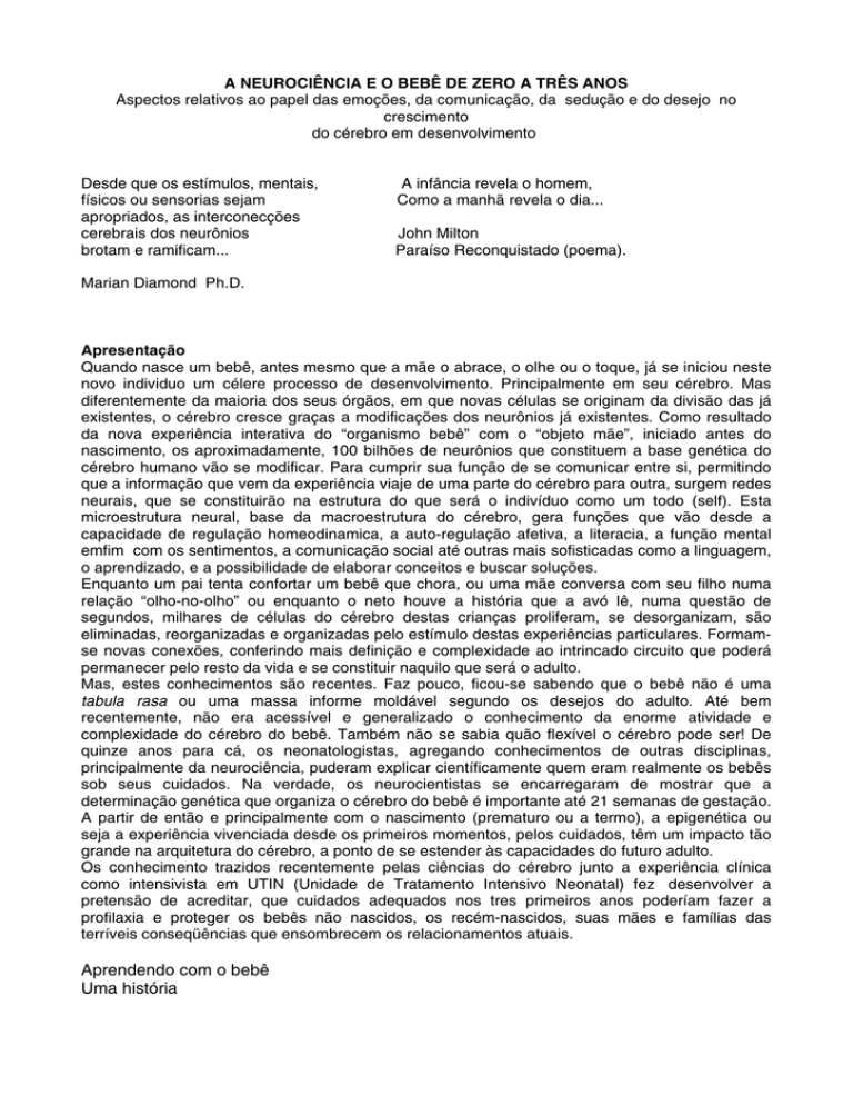 A NEUROCIÊNCIA E O BEBÊ DE ZERO A TRÊS ANOS Aspectos relativos ao papel das emoções, da comunicação, da sedução e do desejo no crescimento do cérebro em desenvolvimento Desde que os estímulos, mentais, físicos ou sensorias sejam apropriados, as interconecções cerebrais dos neurônios brotam e ramificam... A infância revela o homem, Como a manhã revela o dia... John Milton Paraíso Reconquistado (poema). Marian Diamond Ph.D. Apresentação Quando nasce um bebê, antes mesmo que a mãe o abrace, o olhe ou o toque, já se iniciou neste novo individuo um célere processo de desenvolvimento. Principalmente em seu cérebro. Mas diferentemente da maioria dos seus órgãos, em que novas células se originam da divisão das já existentes, o cérebro cresce graças a modificações dos neurônios já existentes. Como resultado da nova experiência interativa do “organismo bebê” com o “objeto mãe”, iniciado antes do nascimento, os aproximadamente, 100 bilhões de neurônios que constituem a base genética do cérebro humano vão se modificar. Para cumprir sua função de se comunicar entre si, permitindo que a informação que vem da experiência viaje de uma parte do cérebro para outra, surgem redes neurais, que se constituirão na estrutura do que será o indivíduo como um todo (self). Esta microestrutura neural, base da macroestrutura do cérebro, gera funções que vão desde a capacidade de regulação homeodinamica, a auto-regulação afetiva, a literacia, a função mental emfim com os sentimentos, a comunicação social até outras mais sofisticadas como a linguagem, o aprendizado, e a possibilidade de elaborar conceitos e buscar soluções. Enquanto um pai tenta confortar um bebê que chora, ou uma mãe conversa com seu filho numa relação “olho-no-olho” ou enquanto o neto houve a história que a avó lê, numa questão de segundos, milhares de células do cérebro destas crianças proliferam, se desorganizam, são eliminadas, reorganizadas e organizadas pelo estímulo destas experiências particulares. Formamse novas conexões, conferindo mais definição e complexidade ao intrincado circuito que poderá permanecer pelo resto da vida e se constituir naquilo que será o adulto. Mas, estes conhecimentos são recentes. Faz pouco, ficou-se sabendo que o bebê não é uma tabula rasa ou uma massa informe moldável segundo os desejos do adulto. Até bem recentemente, não era acessível e generalizado o conhecimento da enorme atividade e complexidade do cérebro do bebê. Também não se sabia quão flexível o cérebro pode ser! De quinze anos para cá, os neonatologistas, agregando conhecimentos de outras disciplinas, principalmente da neurociência, puderam explicar científicamente quem eram realmente os bebês sob seus cuidados. Na verdade, os neurocientistas se encarregaram de mostrar que a determinação genética que organiza o cérebro do bebê é importante até 21 semanas de gestação. A partir de então e principalmente com o nascimento (prematuro ou a termo), a epigenética ou seja a experiência vivenciada desde os primeiros momentos, pelos cuidados, têm um impacto tão grande na arquitetura do cérebro, a ponto de se estender às capacidades do futuro adulto. Os conhecimento trazidos recentemente pelas ciências do cérebro junto a experiência clínica como intensivista em UTIN (Unidade de Tratamento Intensivo Neonatal) fez desenvolver a pretensão de acreditar, que cuidados adequados nos tres primeiros anos poderíam fazer a profilaxia e proteger os bebês não nascidos, os recém-nascidos, suas mães e famílias das terríveis conseqüências que ensombrecem os relacionamentos atuais. Aprendendo com o bebê Uma história Vitor nasceu na ambulância a caminho da maternidade que o abrigaria por 62 dias, pois sua mãe – uma adolescente sem domicílio fixo – o deixou aos cuidados da UTIN (Unidade de Tratamento Intensivo Neonatal). Pela avaliação clínica, tinha 28 semanas de gestação, pesava 750g e estava gravemente enfermo. Além da prematuridade extrema, seu pulmão imaturo o obrigou a respirar com ajuda de ventilação mecânica através de um tubo em sua traquéia; uma bactéria em sua corrente sangüínea tornava-o portador de sepsis perinatal, sua imaturidade digestiva e metabólica não lhe possibilitaram o conforto da sucção só podendo receber alimentação parenteral. Sua situação clínica era de alto-risco não só quanto a morbidade mas também a mortalidade. Por ter galhardamente sobrevivido a todas as agressivas e estressantes investidas tecnológicas, este vitorioso, não nominado pela mãe, o foi pelos cuidadores. Sobreviveu apesar das expectativas. E foi cuidado com extremo carinho pelos seus “muitos cuidadores primários”. Pelo menos até que se conseguisse localizar sua adolescente mãe, quando já estava com dois meses. Era um menino sadio, alegre e comunicativo embora extremamente sensível a qualquer situação que pudesse lhe causar dor ou frustração. Mas consolava-se facilmente. Enfim, este bebê recuperado para a vida graças aos cuidados técnicos e afetivos da UTIN, foi entregue para sua mãe com o diagnóstico de prematuro “organicamente intacto” ou seja saudável. Aparentemente este menino recebeu o que sua família tinha de melhor! Mas Vitor apesar de saudável e inteligente teve seu desenvolvimento muito perturbado. Não soube lidar com as pressões sociais e aos 10 anos após inúmeras dificuldades de adaptação comportamentais, foi vitimado por uma “over dose”. Mas esta é apenas uma história, não pode ser considerada como um caso clínico. Entretanto, estudiosos da evolução de bebês egressos das UTIN tradicionais (sem a inserção das mães), que foram a regra até mais ou menos 10 anos atrás, mostraram um aumento estatísticamente sgnificativo de distúrbios de comportamento. O desenvolvimento do prematuro “organicamente intacto” ao ter alta da UTIN, após uma longa e sofrid