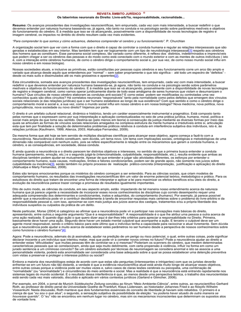 REVISTA ÂMBITO JURÍDICO ® Os laberintos neuronais do Direito: Livre-arb?io, responsabilidade, racionalidade... Resumo: Os avanços procedentes das investigações neurocientíficas, tem empurrado, cada vez com mais intensidade, a buscar redefinir o que devemos entender por natureza humana baseando-se, já agora, não tanto na conduta e na psicologia senão sobre parâmetros medíveis e objetivos do funcionamento do cérebro. E à medida que isso se vá alcançando, possivelmente com a disponibilidade de novas tecnologias de registro e imagem cerebral, os impactos no âmbito do direito resultam cada vez mais evidentes. “Para comprender lo que somos y cómo actuamos, debemos comprender el cerebro y su funcionamiento”. P. Churchlan A organização social tem que ver com a forma com que o direito é capaz de controlar a conduta humana e regular as relações interpessoais que são geradas e estabelecidas em seu interior. Mas também tem que ver logicamente com um tipo de neurobiologia interpessoal[1] respeito aos cérebros dos homens que as constituem. Esse panorama social complexo, tão variado como diferente, é reflexo dos distintos, indeterminados e imprevisíveis que podem chegar a ser os cérebros das pessoas e do modo como está conectado com o mundo exterior e com as mentes de outros indivíduos ( isto é, com a interação entre cérebros humanos, de como o cérebro dirige o comportamento social e, por sua vez, de como nosso mundo social influi em nosso cérebro e em nossa biologia). Nossas sociedades atuais, e inclusive as primitivas, estão constituídas por pessoas cujos cérebros e seu funcionamento corre um arco tão amplo e variado que alcança desde aquilo que entendemos por “normal” – sem saber propriamente o que isto significa - até todo um espectro de “defeitos” desde os mais sutis e dissimulados até os mais grosseiros e aparentes[2]. Esta circunstância, somada aos avanços procedentes das investigações neurocientíficas, tem empurrado, cada vez com mais intensidade, a buscar redefinir o que devemos entender por natureza humana baseando-se, já agora, não tanto na conduta e na psicologia senão sobre parâmetros medíveis e objetivos do funcionamento do cérebro. E à medida que isso se vá alcançando, possivelmente com a disponibilidade de novas tecnologias de registro e imagem cerebral, como vamos operar juridicamente diante de todo esse amálgama de seres humanos que violam e desumanizam o humano? Que circuitos de nosso cérebro elaboram as condutas anti-sociais? E como estas podem ser modificadas ou controladas uma vez conhecidos quais são ditos circuitos? Há correlatos neuronais “responsáveis” tanto pela normalidade como pelos defeitos que emergem dos vínculos sociais relacionais (e das relações jurídicas) que o ser humano estabelece ao longo de sua existência? Com que sentido e como o cérebro dirige o comportamento moral e social e, a sua vez, como o mundo social influi em nosso cérebro e em nossa biologia? Nova medicina, nova política, nova jurisprudência, nova sociedade ou novo direito? Vejamos por parte. O direito é um artefato cultural relacional, dinâmico e histórico, tendo um caráter essencialmente instrumental e pragmático. Está composto tanto pelas normas que o expressam como por sua interpretação e aplicação contextualizadas no seio de uma prática jurídica, humana, moral, política e social mais ampla da que toma seu sentido. Destina-se (pelo menos em teoria) à consecução da justiça mediante as diversas formas por meio das quais se articulam as formas de vínculos sociais relacionais arraigados na complexa estrutura da mente humana e irredutíveis entre si, articulação esta que tem por finalidade a solução de determinados problemas práticos relativos à conduta em interferência subjetiva dos indivíduos, isto é, às relações jurídicas (Kaufmann, 1999; Atienza, 2003; Atahualpa Fernandez, 2009). Da mesma forma que até hoje se tem servido de múltiplas disciplinas científicas para alcançar esse objetivo, agora começa a fazê-lo com a neurociência. Neurociência e direito constituem, sem dúvida, um tema novo. Um tema com implicações sociais, ontológicas e metodológicas de uma dimensão não comparável com nenhum outro, pois se refere especificamente à relação entre os mecanismos que geram a conduta humana, o cérebro, e as consequências, em sociedade, dessa conduta. E ainda quando a neurociência e o direito parecem ter distintos objetivos e interesses, no sentido de que a primeira busca entender a conduta humana (pensamento, emoção, etc.) e o segundo julgá-la (intencionalidade, culpabilidade, responsabilidade, etc.), resulta evidente que ambas as disciplinas também podem ajudar-se mutuamente. Apesar de que entender e julgar são atividades diferentes, os esforços por entender o comportamento humano, suas causas, motivações, limites e fatores condicionantes, podem ser de grande apoio, não somente nos juízos sobre culpabilidade ou inocência[3], senão também no próprio processo de realização prático-concreta (interpretação, justificação e aplicação) do direito (Atahualpa e Marly Fernandez, 2008). Estes são tempos emocionantes porque os mistérios do cérebro começam a ser entendido. Para as ciências sociais, que criam modelos de comportamento humano, os resultados das investigações neurocientíficas têm um valor de enorme potencial teórico, metodológico e prático. Para os estudiosos do direito que tratam de encontrar uma forma de interpretar e aplicar a lei para maximizar os efeitos benéficos e/ou úteis do direito, a evolução da neurociência parece trazer consigo a promessa de resultados igualmente importantes. Dito de outro modo, as ciências da conduta, em seu aspecto amplo, estão impactando de tal maneira nosso entendimento acerca da natureza humana que já parece urgente a necessidade de incorporar esses novos conhecimentos às disciplinas cujo